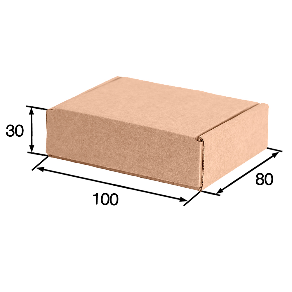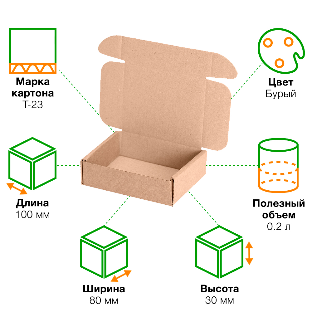 Короб КС-604 МГФ, серии КС-600, бурый, длиной 100 мм, шириной 80 мм и высотой 30 мм. Изготовлен из микрогофрокартона Т-23. Полезный объём — 0.2 л.