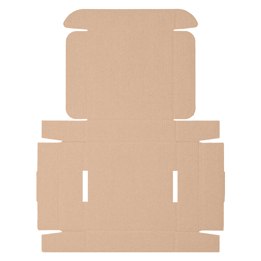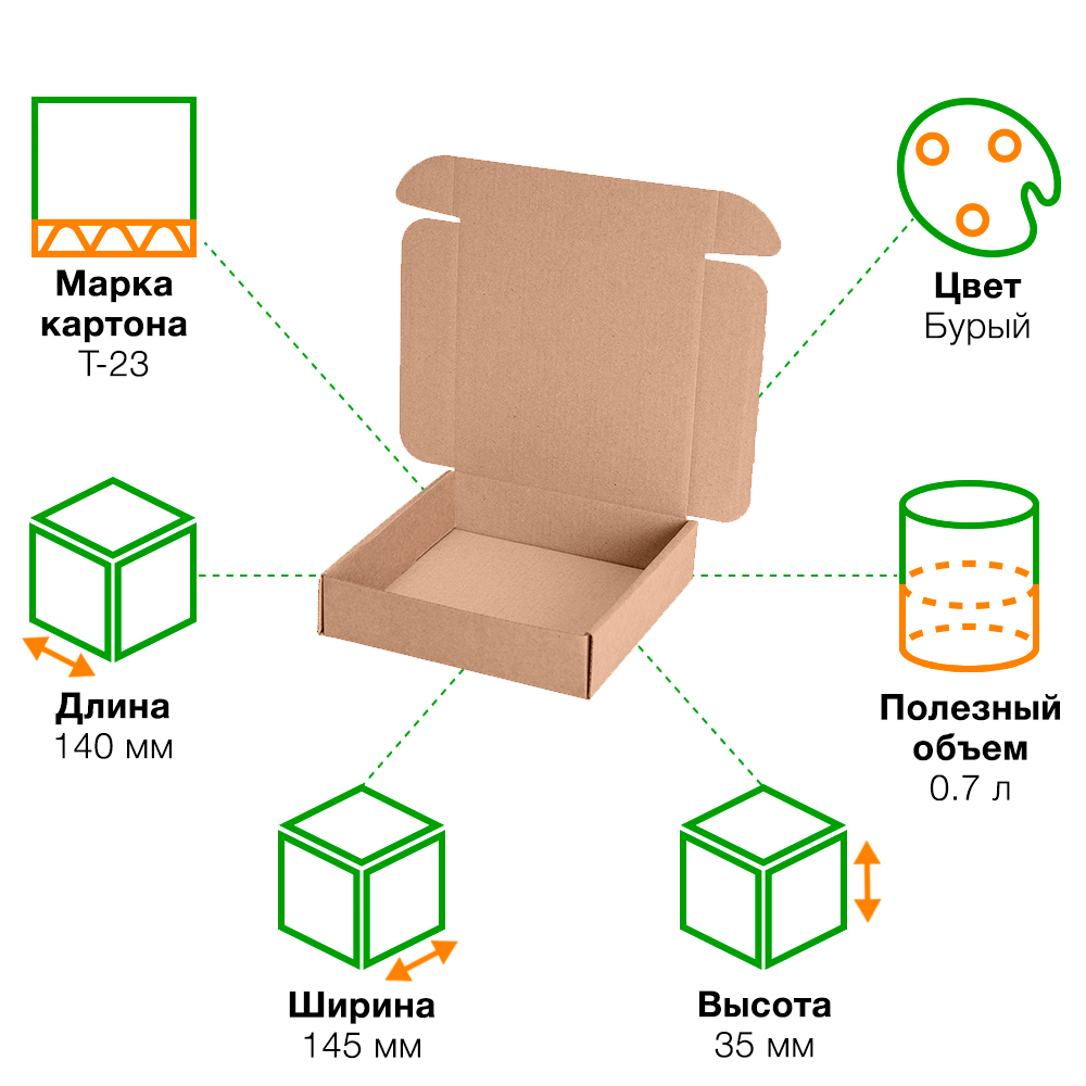 Короб КС-619 МГК, серии КС-600, бурый, длиной 140 мм, шириной 145 мм и высотой 35 мм. Изготовлен из микрогофрокартона Т-23. Полезный объём — 0.7 л.