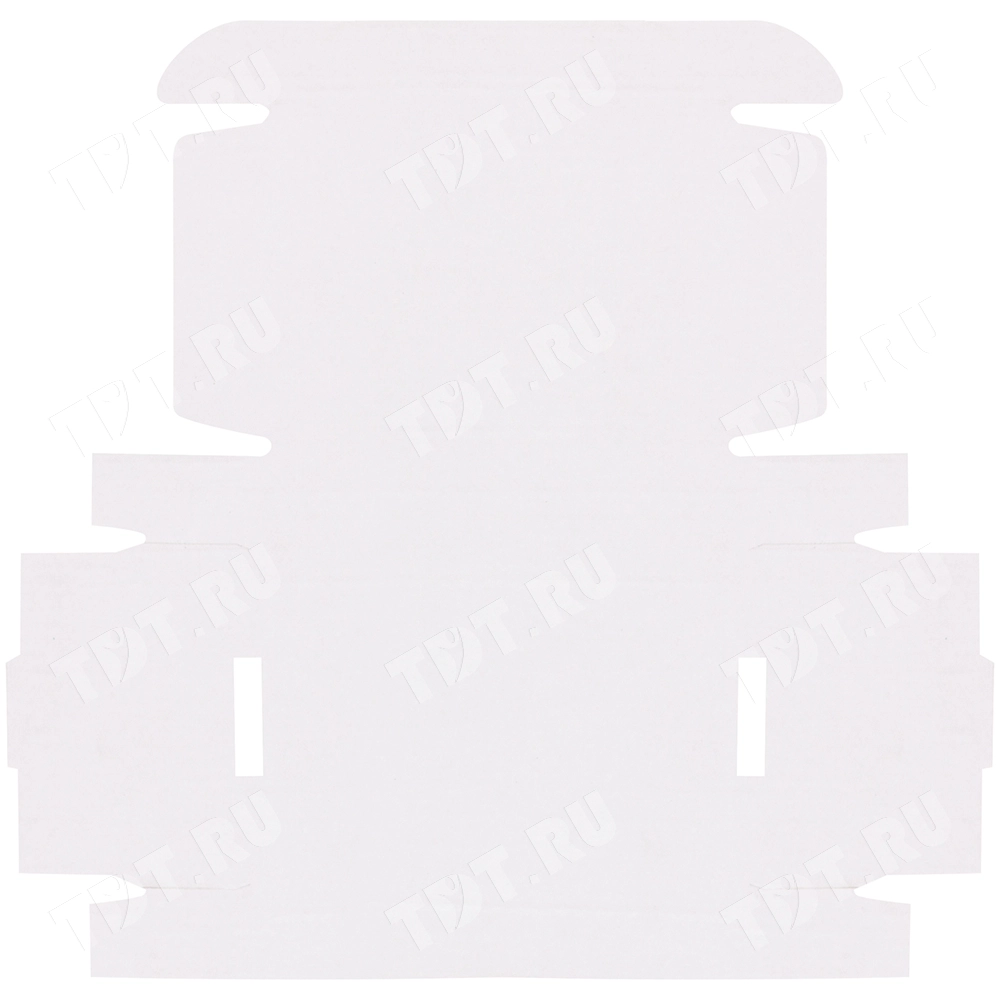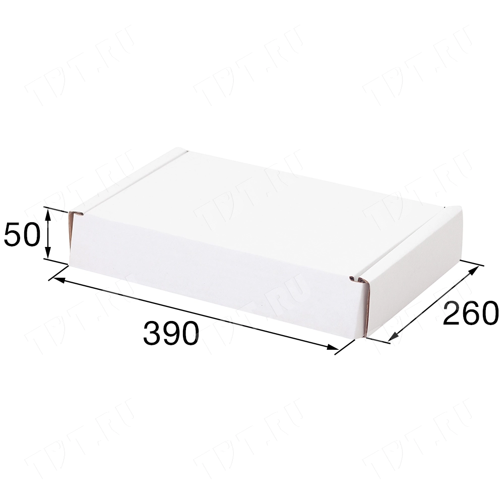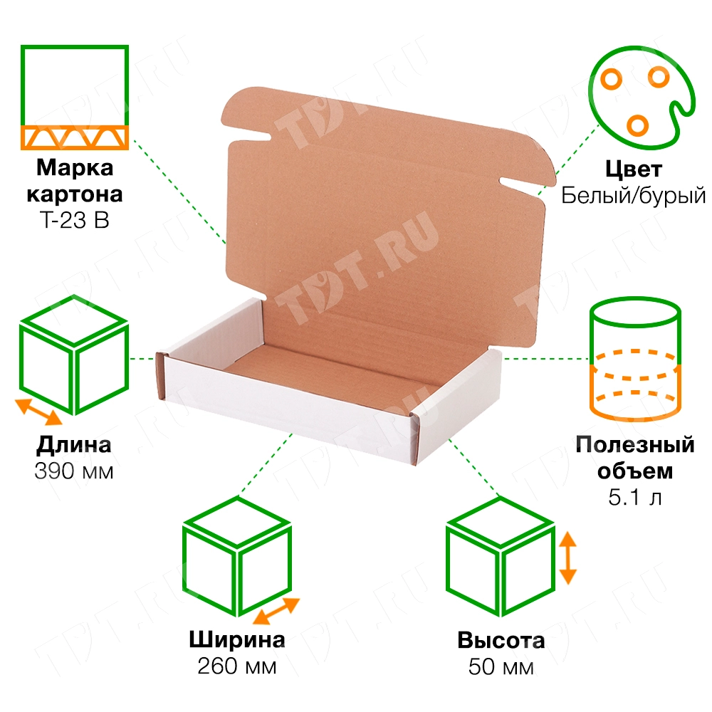 Короб №49/1 белёный, длиной 390 мм, шириной 260 мм и высотой 50 мм. Изготовлен из гофрокартона Т-23 В. Полезный объём — 5.1 л.