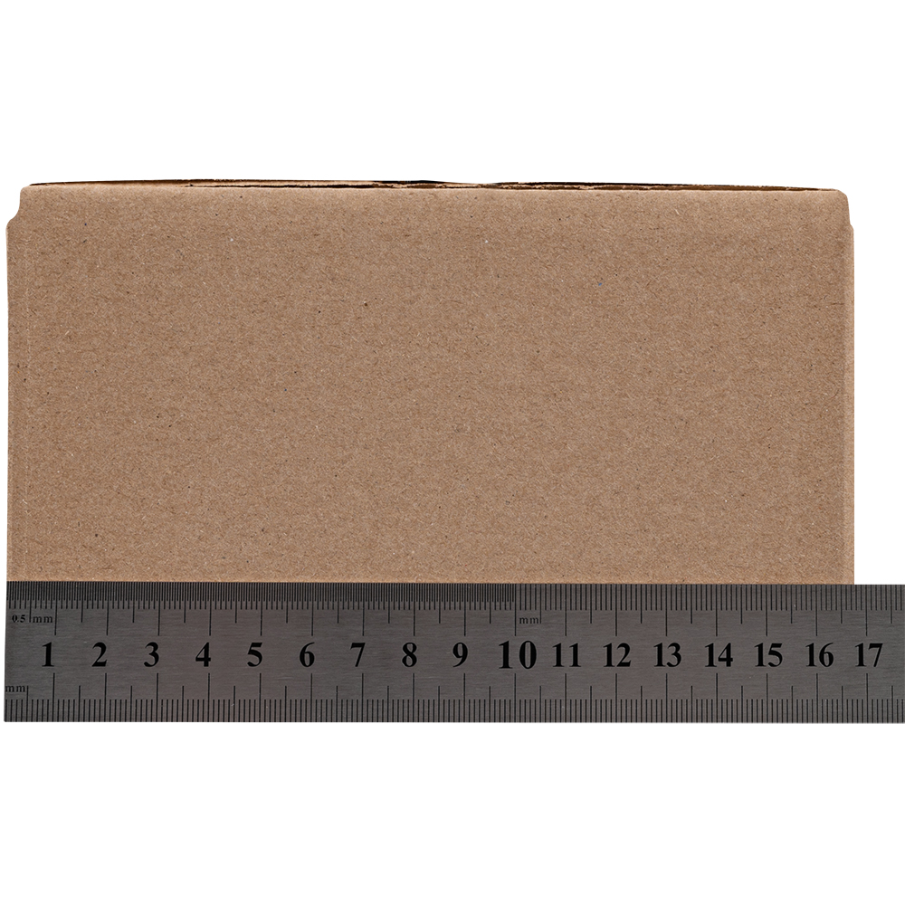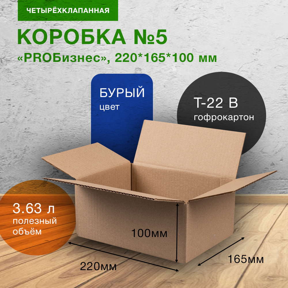 Короб «PROБизнес» №5-МК бурого цвета, длиной 220 мм, шириной 165 мм и высотой 100 мм. Изготовлен из трехслойного картона марки Т-22 В. Полезный объём — 3.63 л.