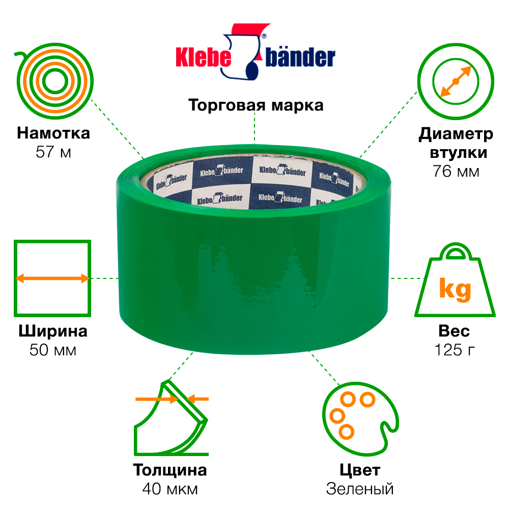 Клейкая лента зеленого цвета 50 мм, намоткой 57 метров для ручной упаковки KLEBEBANDER.