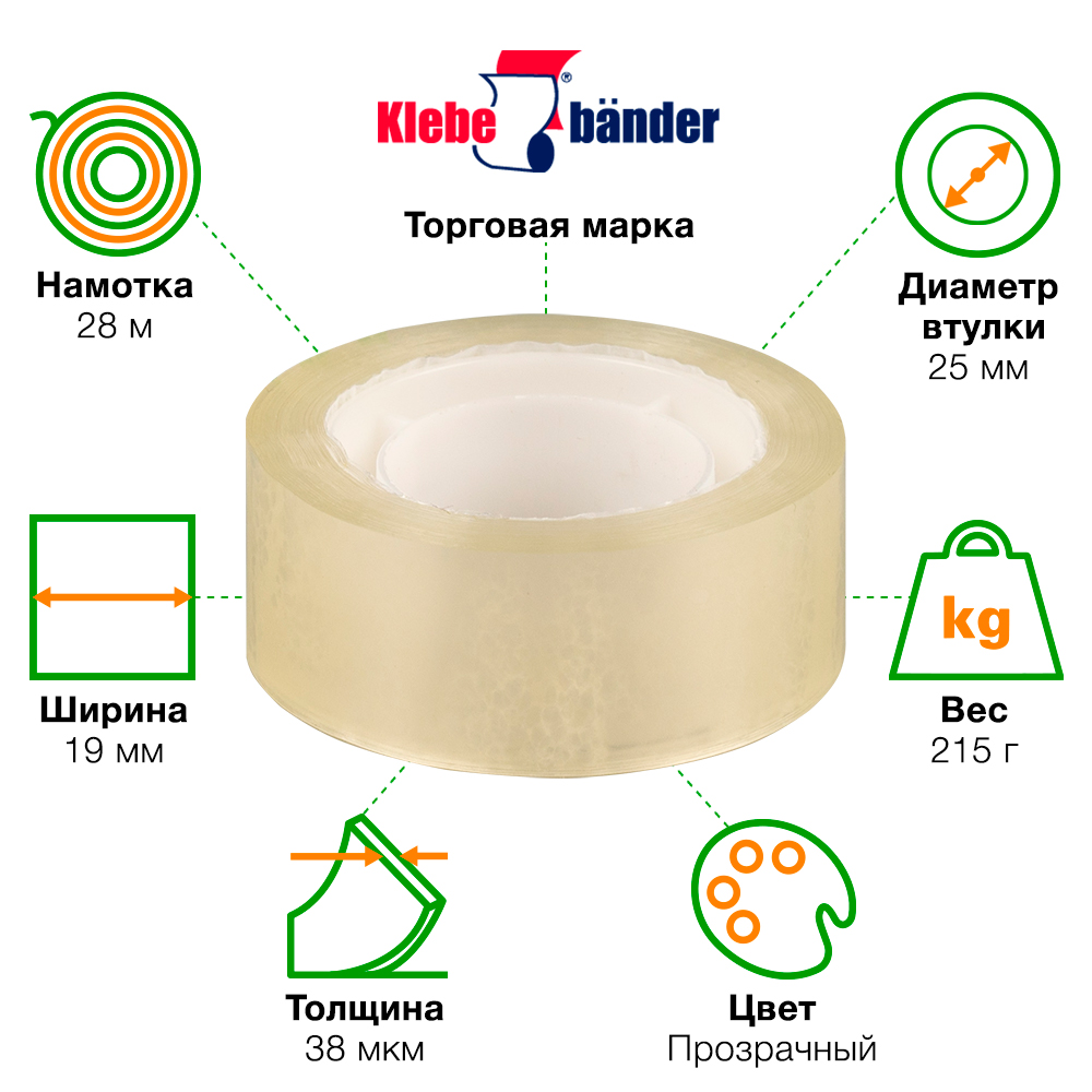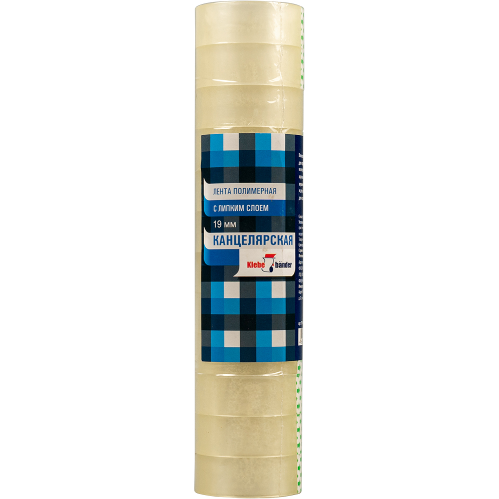 Канцелярская прозрачная клейкая лента Klebebander шириной 19 мм, диаметром втулки 25 мм, намоткой 28 метров. Изготовлена на основе биаксиально ориентированной полипропиленовой пленки (БОПП).