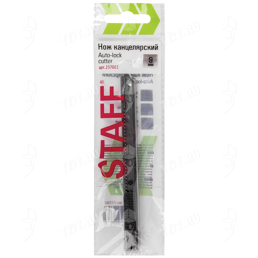 Нож канцелярский STAFF с отламываемым лезвием, код производителя 237081, Auto-lock cutter, шириной 9 мм. Материал – металл. Производится в Китае.