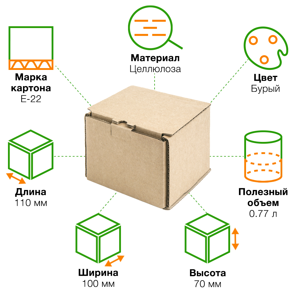 Короб №199 (премиум) бурого цвета, длиной 110 мм, шириной 100 мм и высотой 70 мм. Изготовлен из микрогофрокартона Е-22. Полезный объём — 0.77 л.