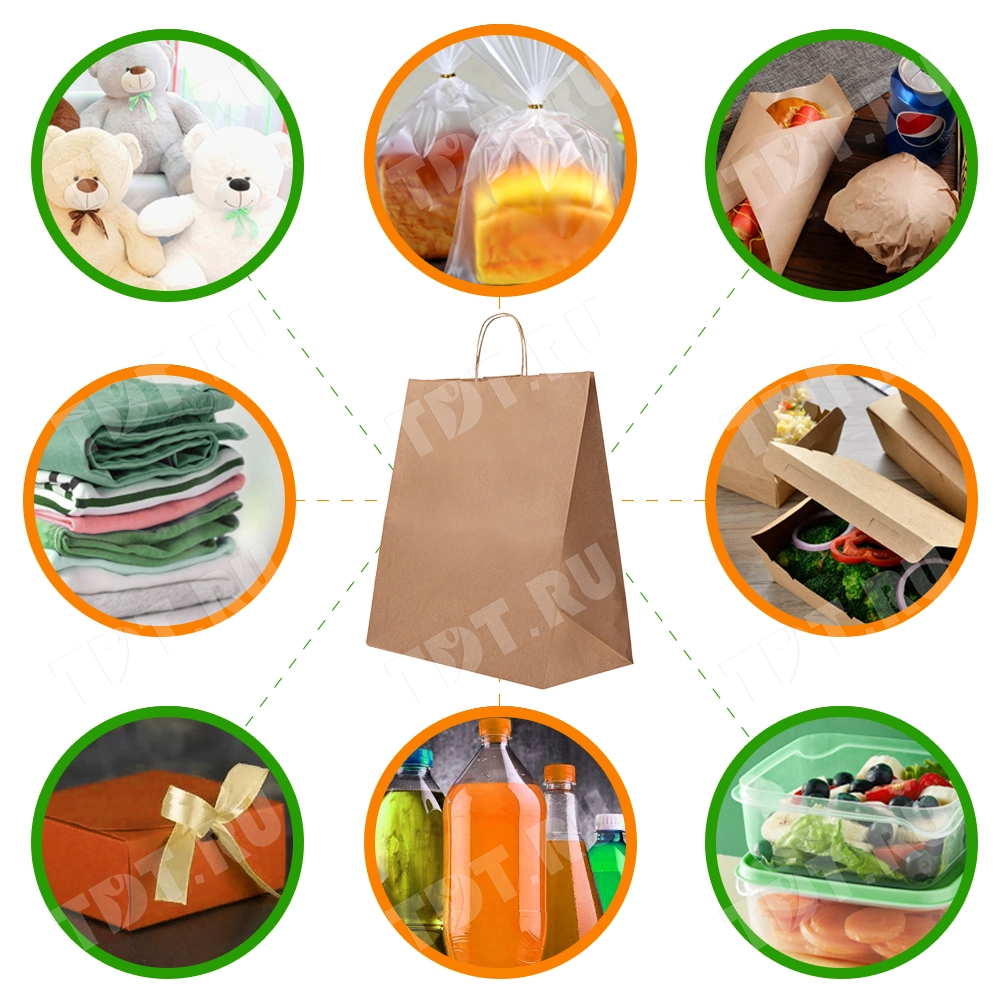 Пакеты с кручёной ручкой используются для упаковки, переноски, хранения продуктов питания и бытовых товаров. Они незаменимы в магазинах, пекарнях, кафе, ресторанах и на фудкортах.