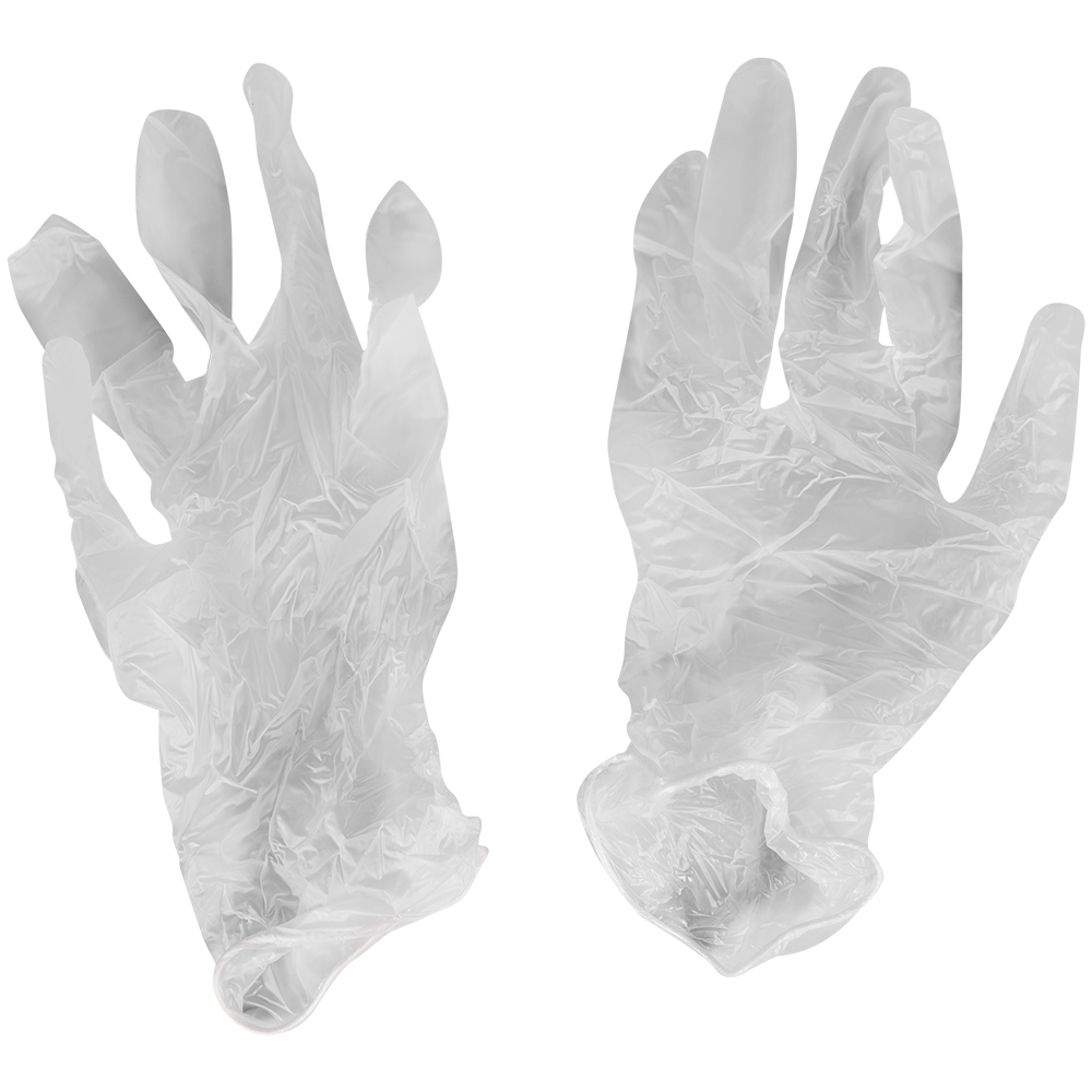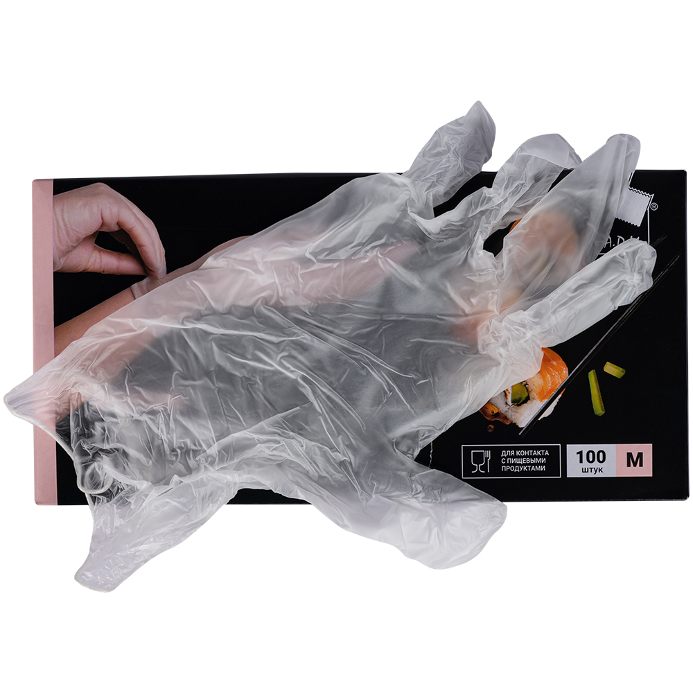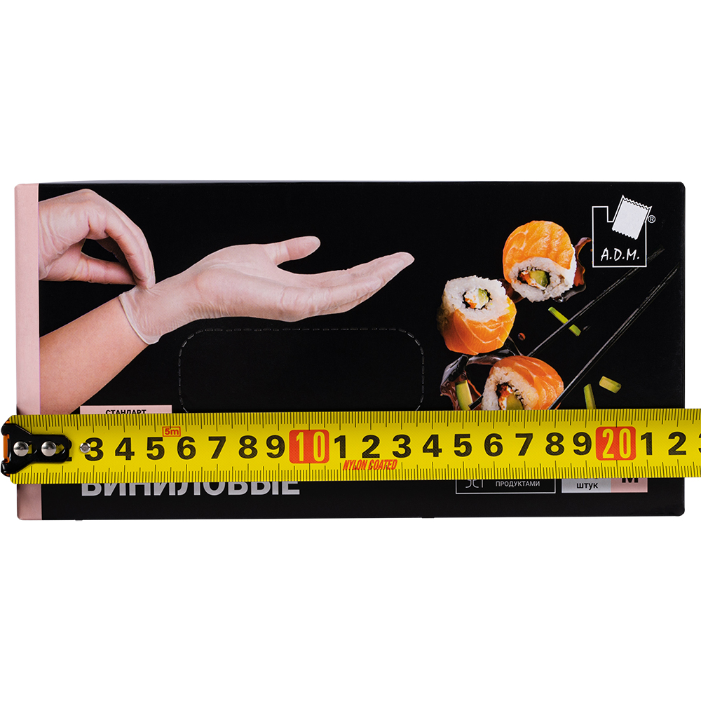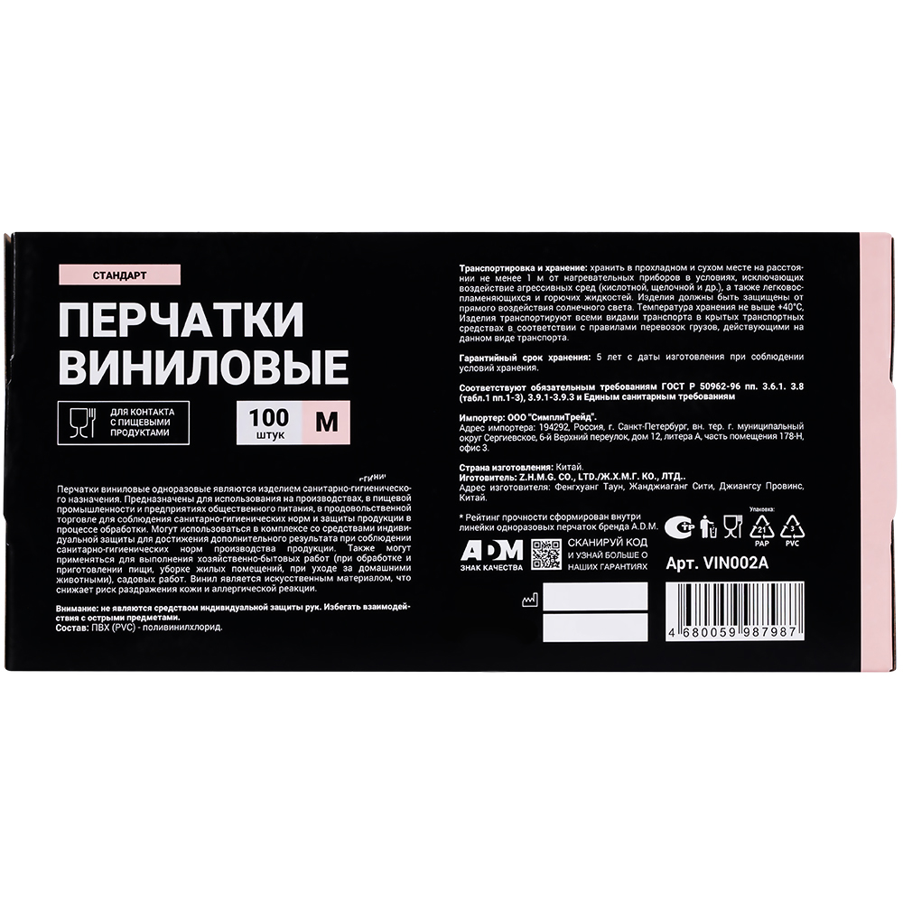 Одноразовые виниловые перчатки A.D.M., размер M, белого цвета, неопудренные, нестерильные, в упаковке по 100 шт. Предназначены для защиты рук при уборке, приготовлении пищи, косметических процедурах. Материал – поливинилхлорид. Производятся в Китае.