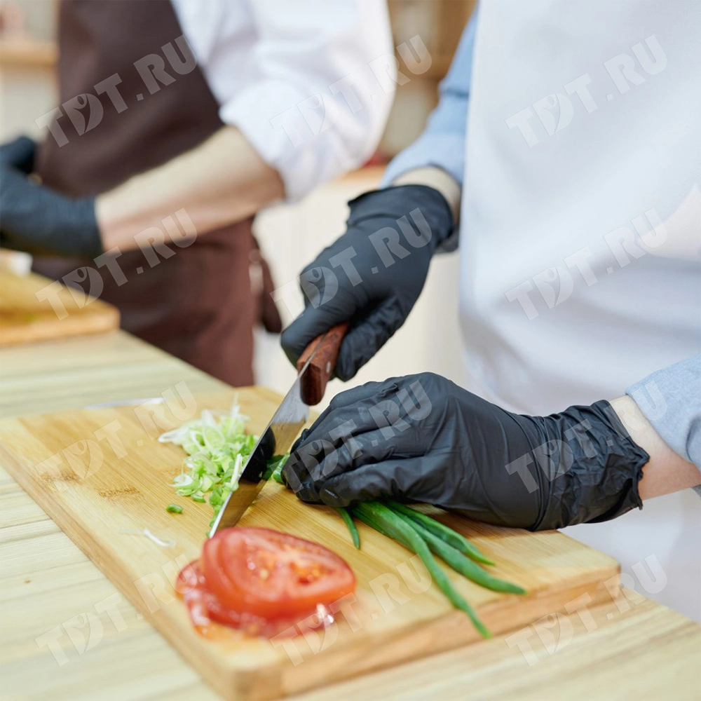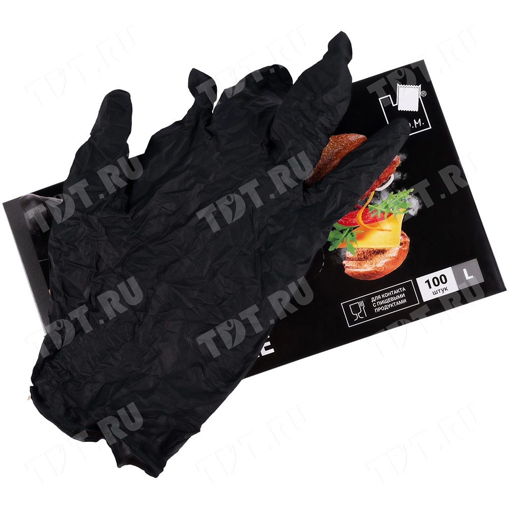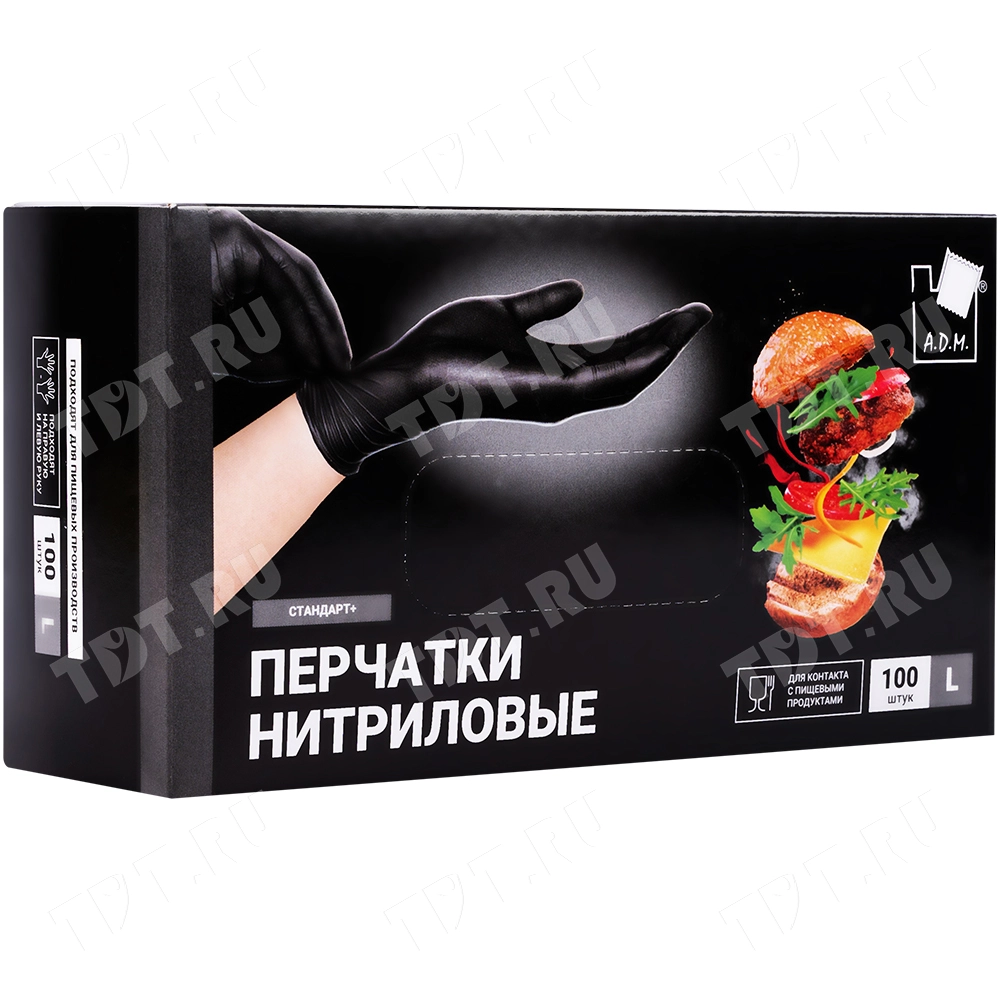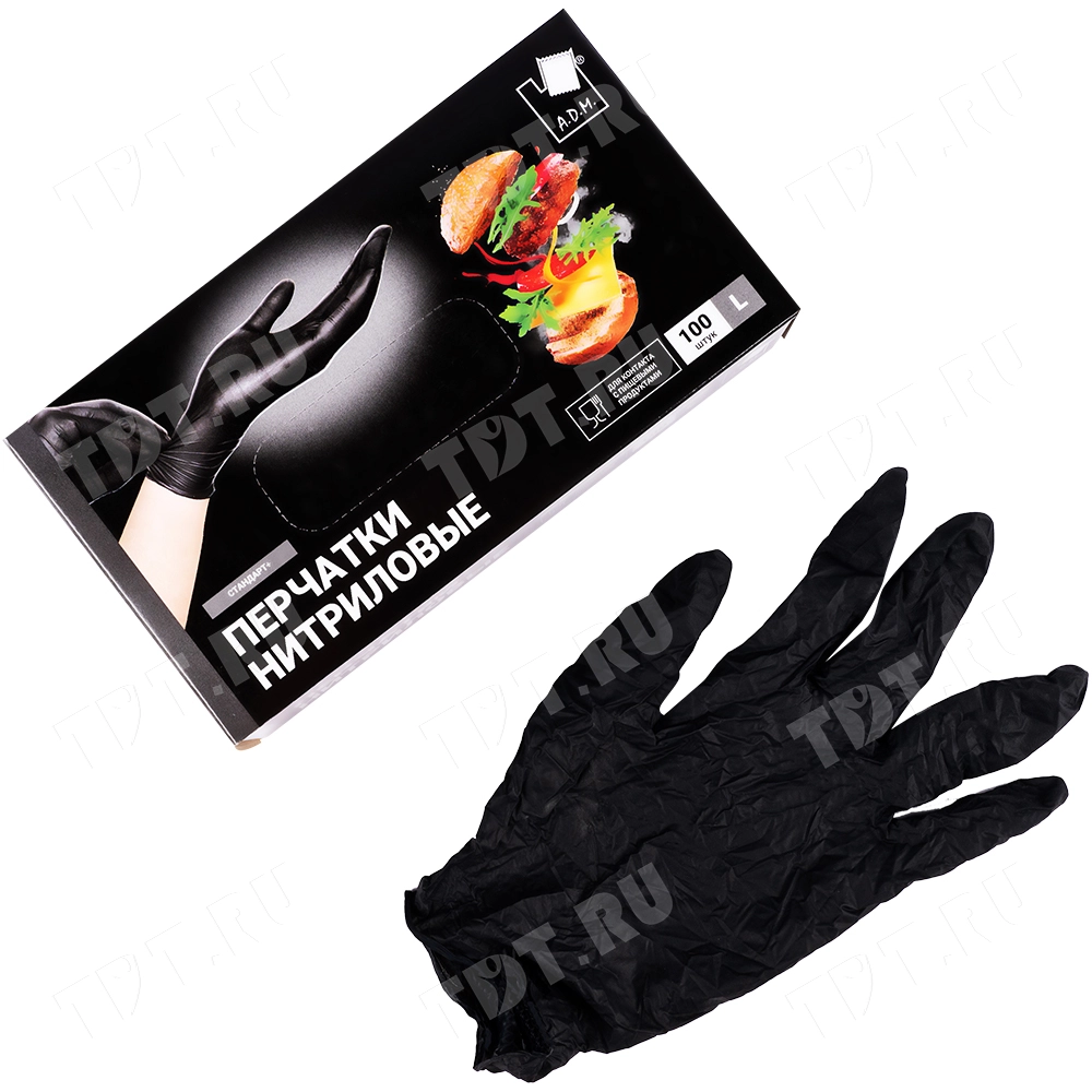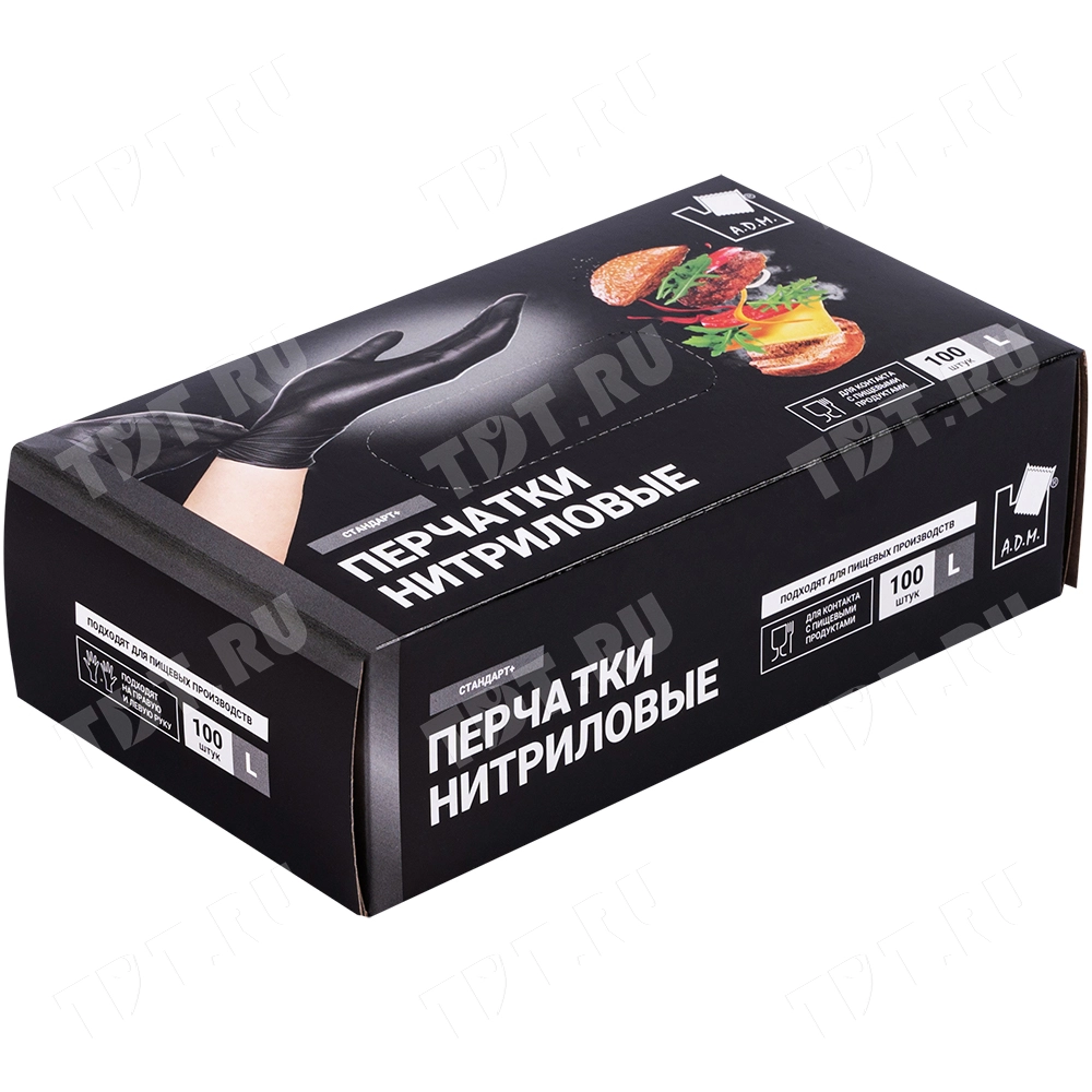 Одноразовые нитриловые перчатки Стандарт+ A.D.M., размера L, черного цвета, в упаковке по 100 шт. Материал – нитрил. Производятся в Китае.