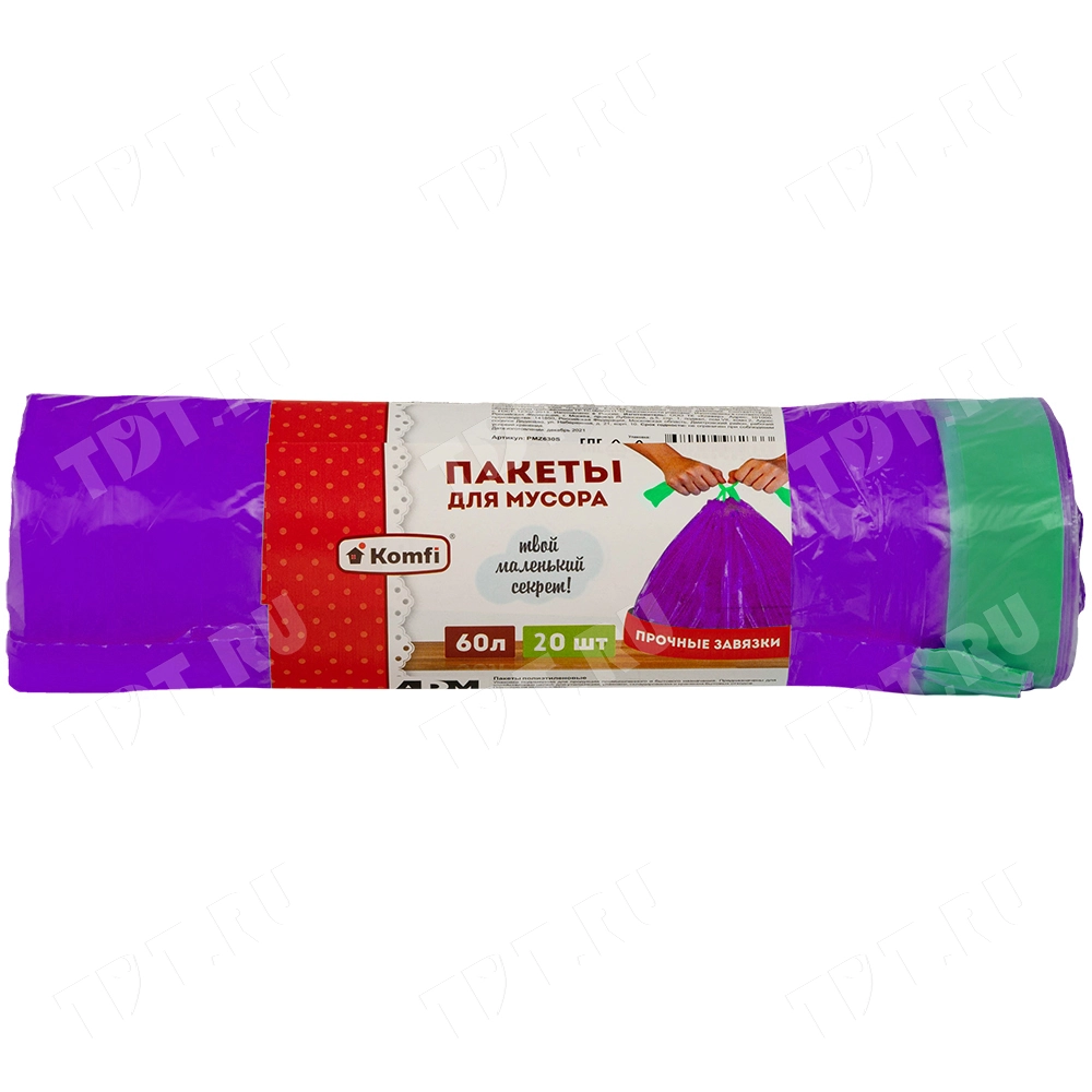 Мешки для мусора ПНД Komfi 60 литров с завязками, 58*68 см, фиолетовые, 20 шт./рулон