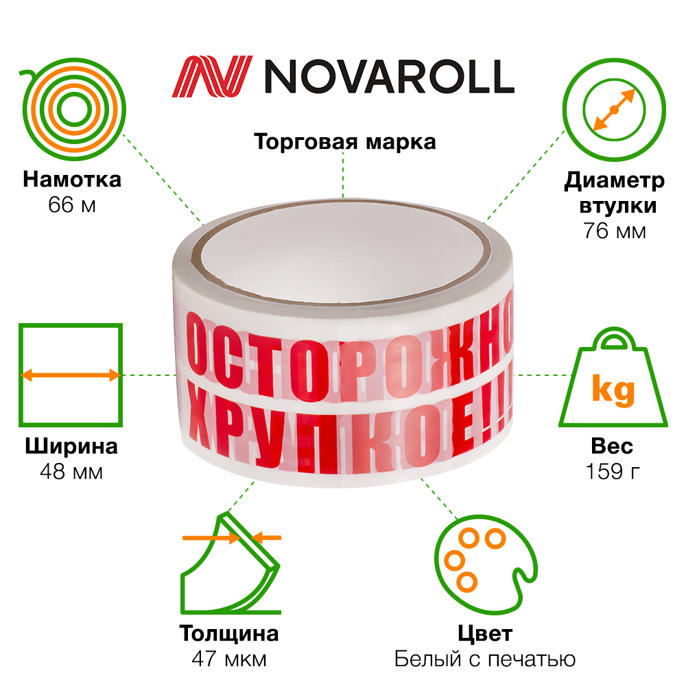 Белая клейкая лента с красной надписью «Осторожно хрупкое» шириной 48 мм, толщиной 47 мкм, диаметром втулки 76 мм, намоткой 66 метров. Изготовлена на основе полипропилена.