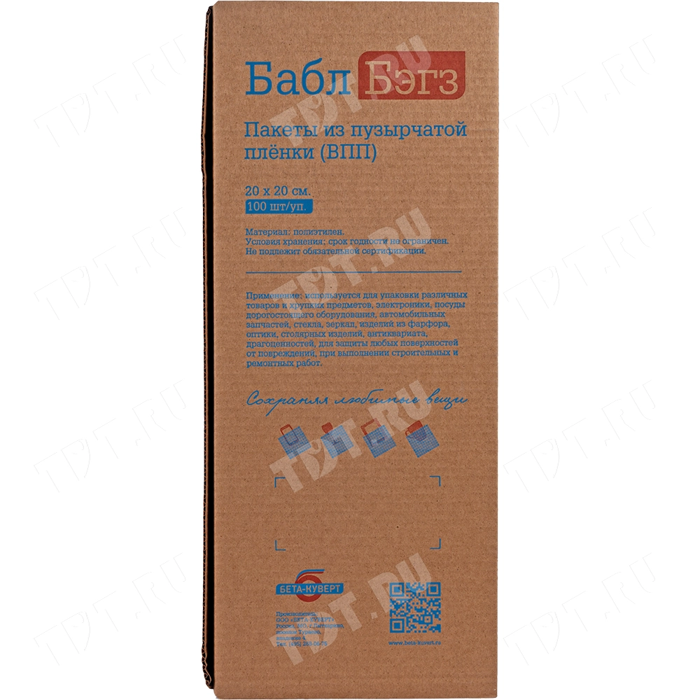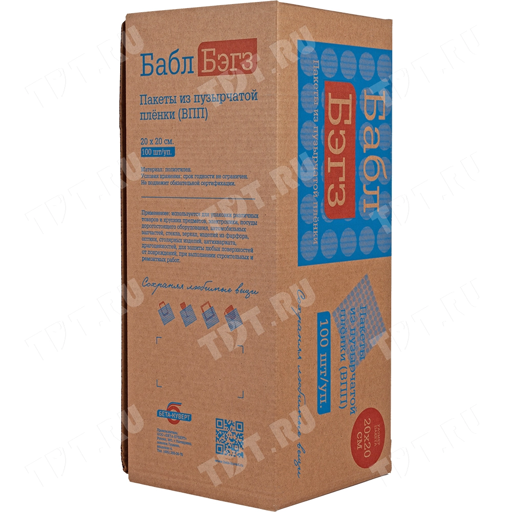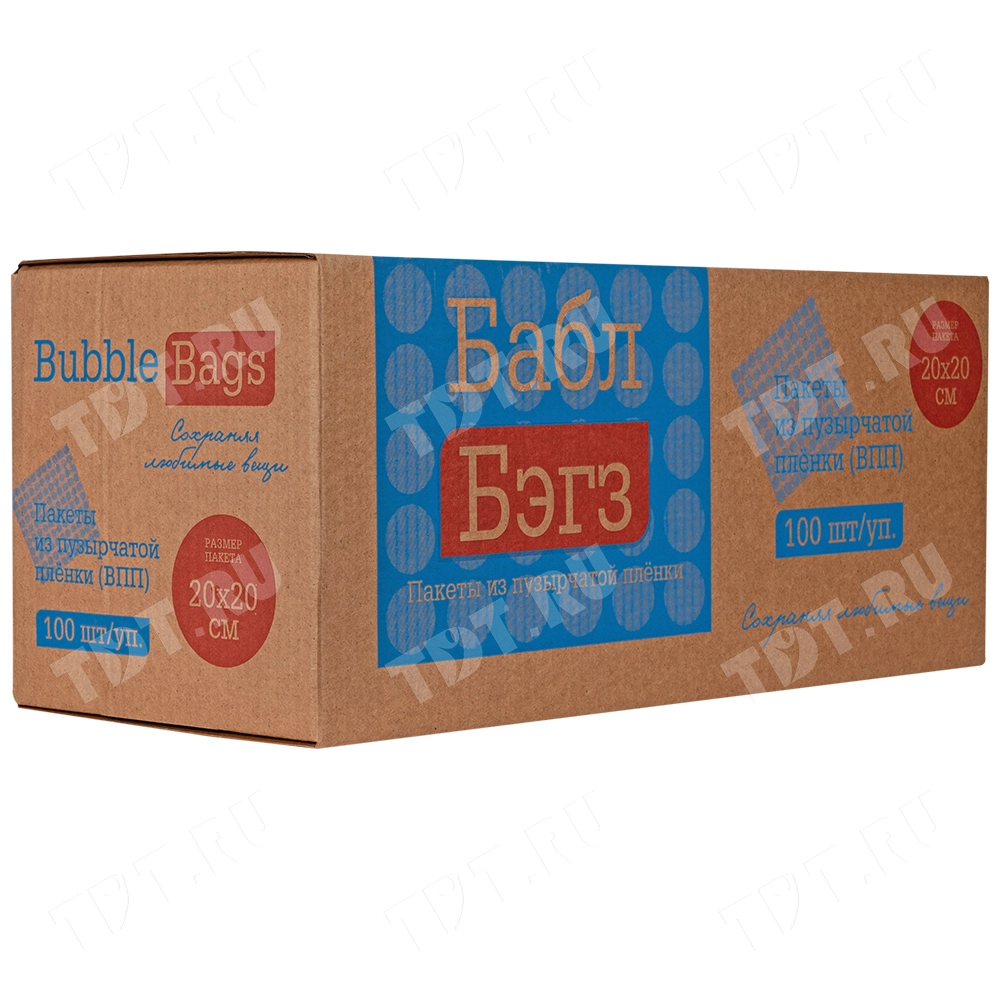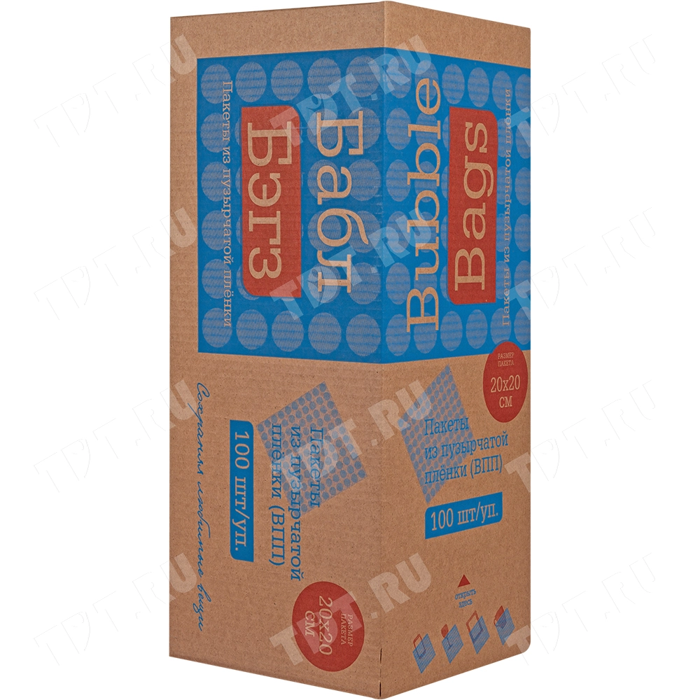 На фото изображена коробка-диспенсер Bubble bags, внутри которой находится 100 трёхслойных ВПП пакетов 20*20 см.