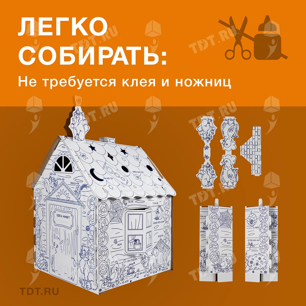Нет, для сборки домика-раскраски не требуются клей или скотч.