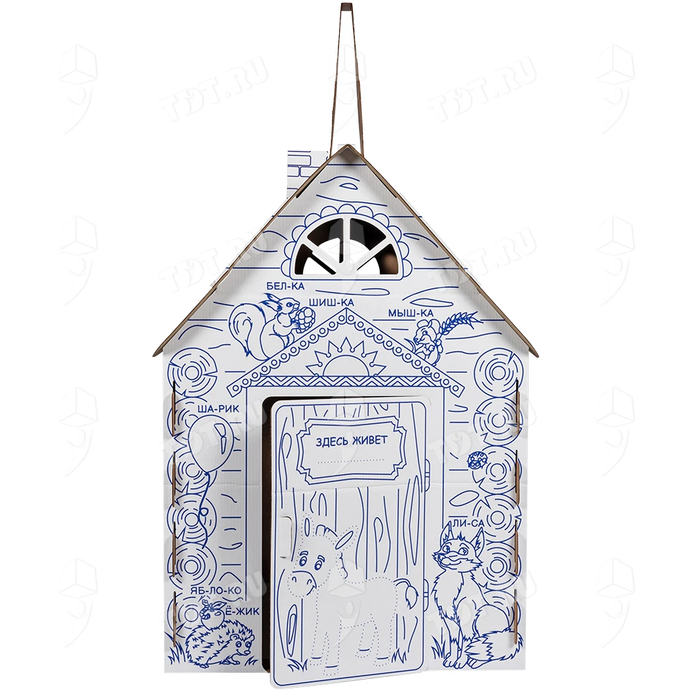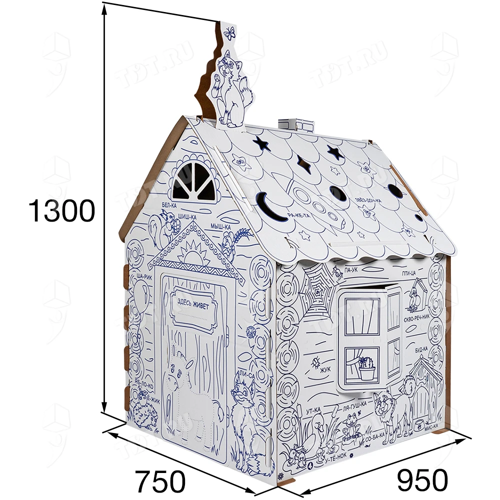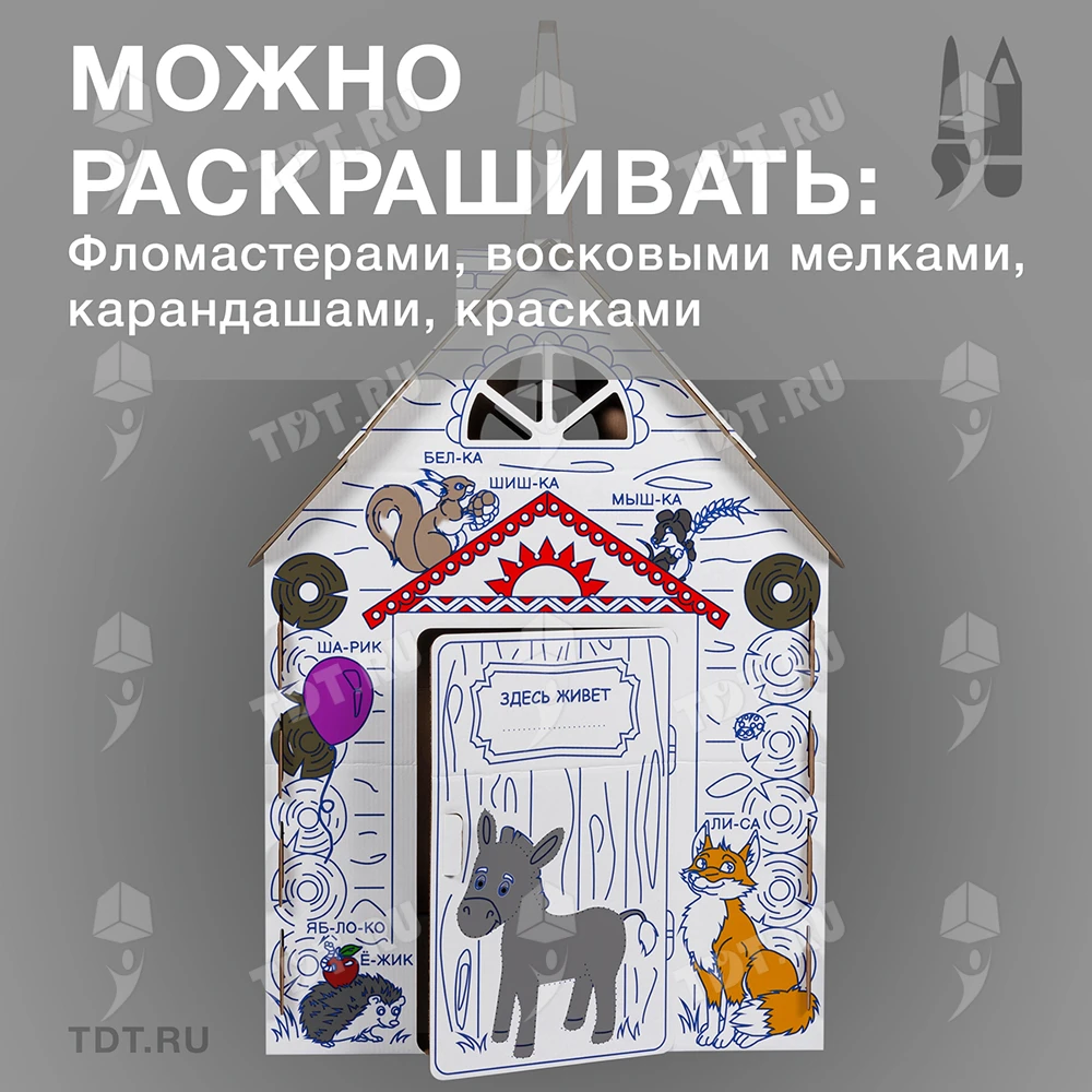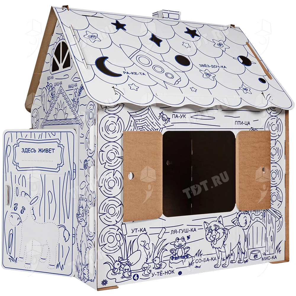 Картонный домик-раскраска «Кто здесь живёт», длиной 950 мм, шириной 750 мм и высотой 1300 мм. Изготовлен из трёхслойного гофрокартона марки Т-24 В.