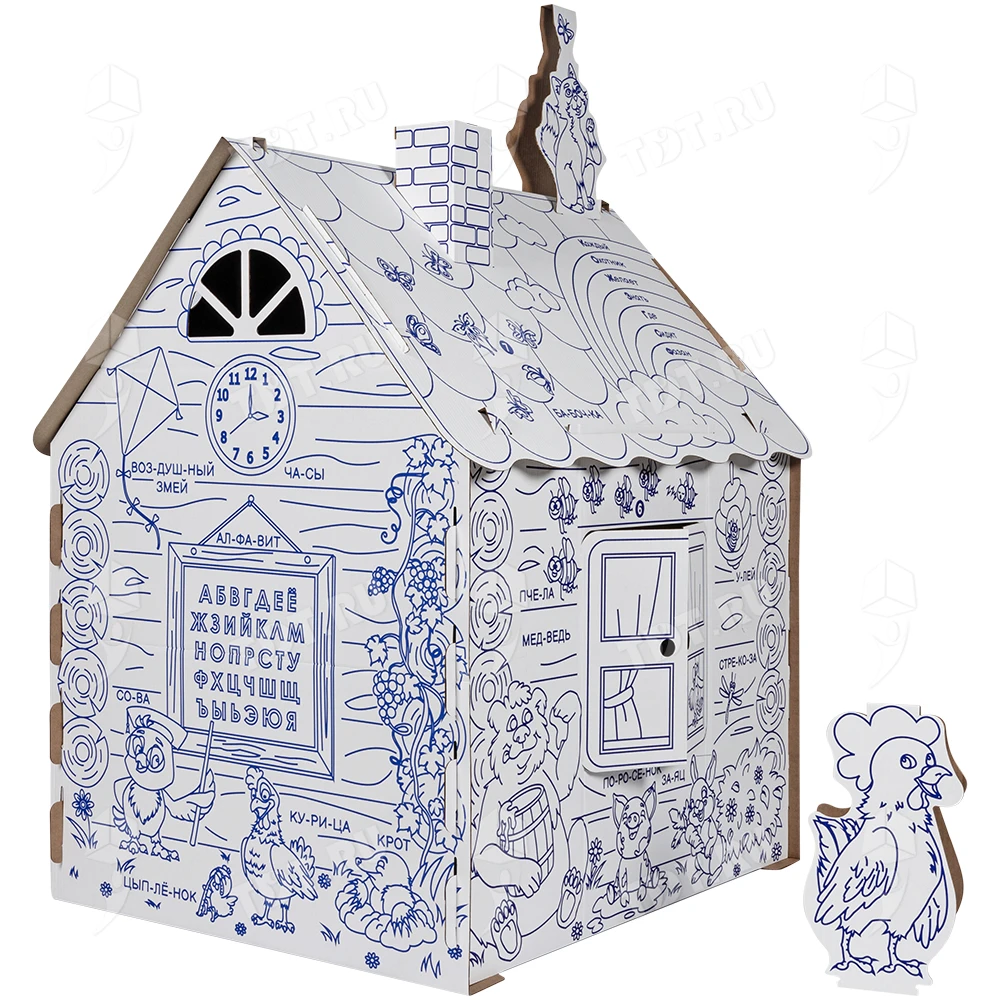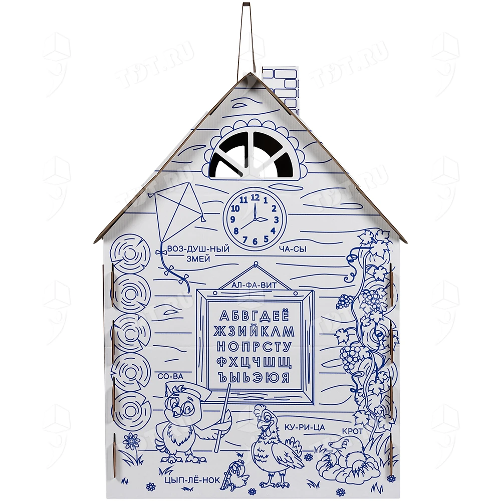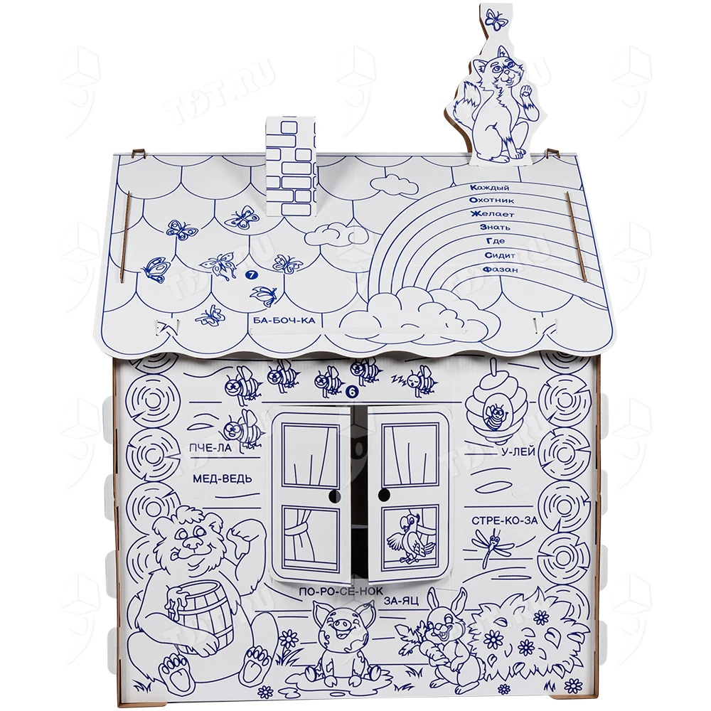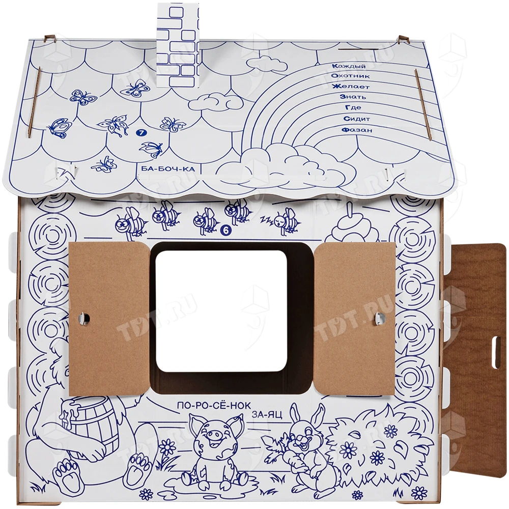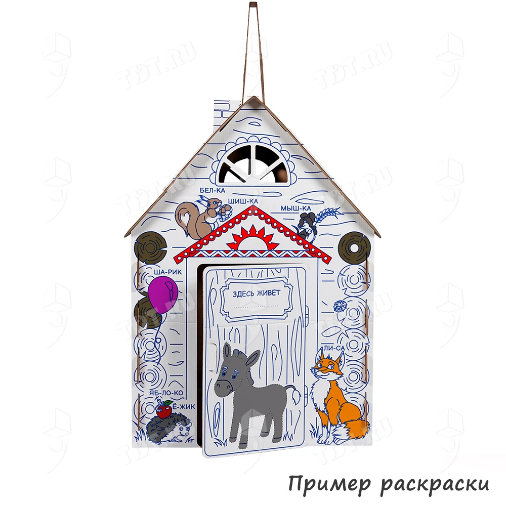 Картонный домик-раскраска «Кто здесь живёт», длиной 950 мм, шириной 750 мм и высотой 1300 мм. Изготовлен из трёхслойного гофрокартона марки Т-24 В.