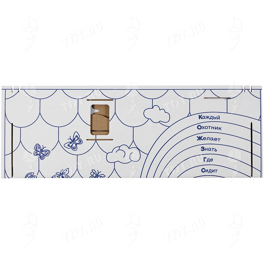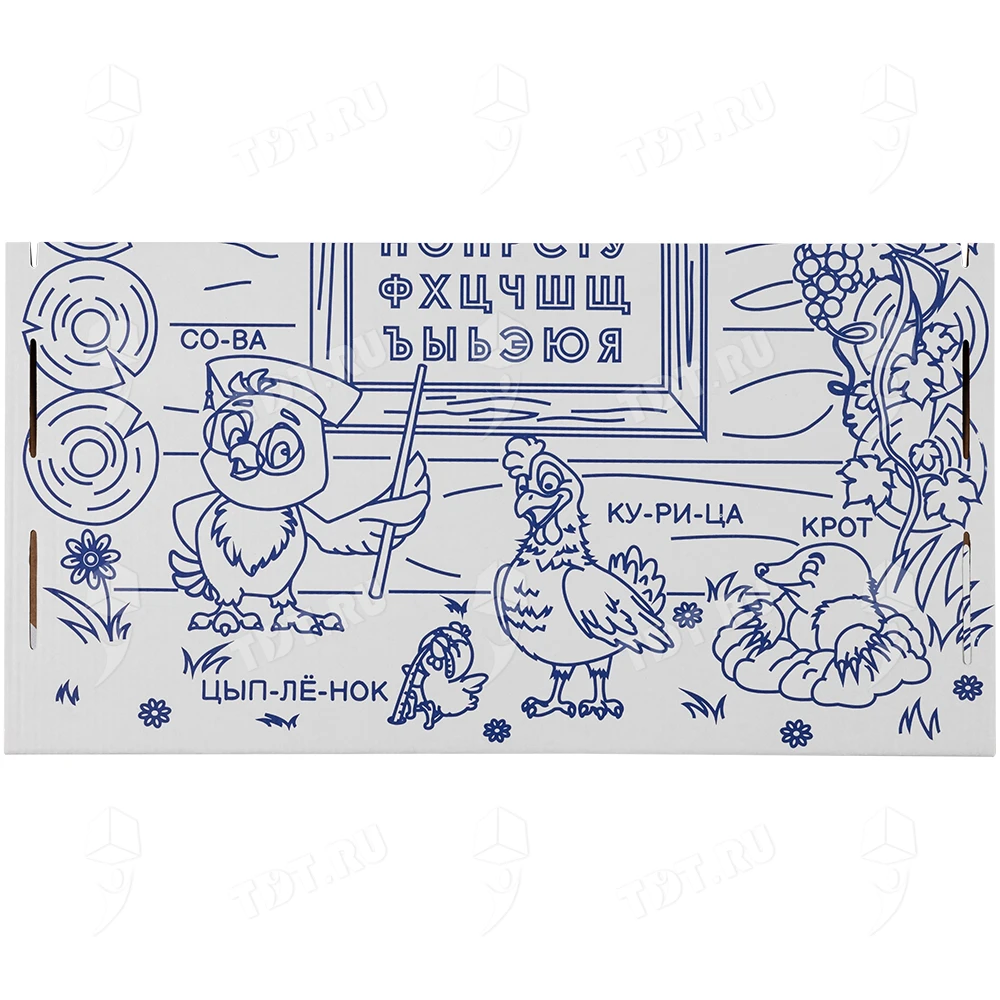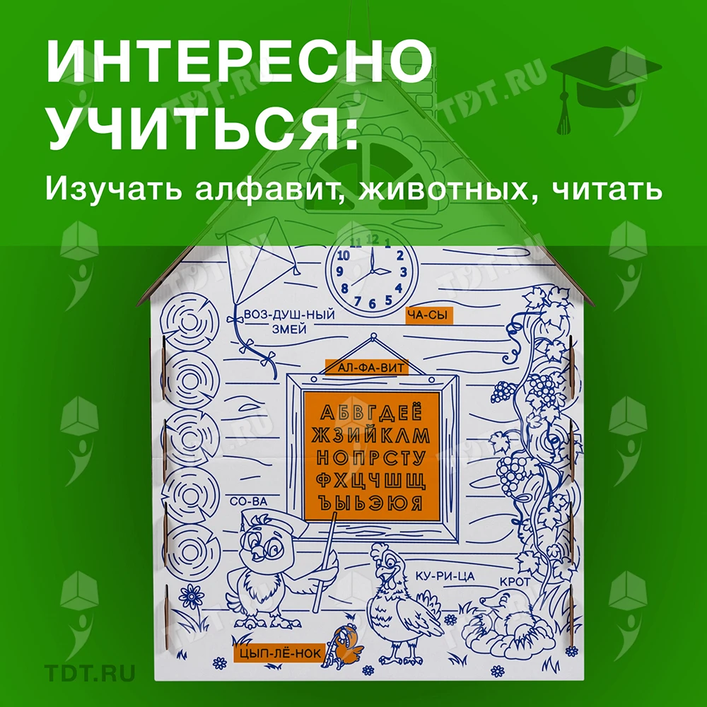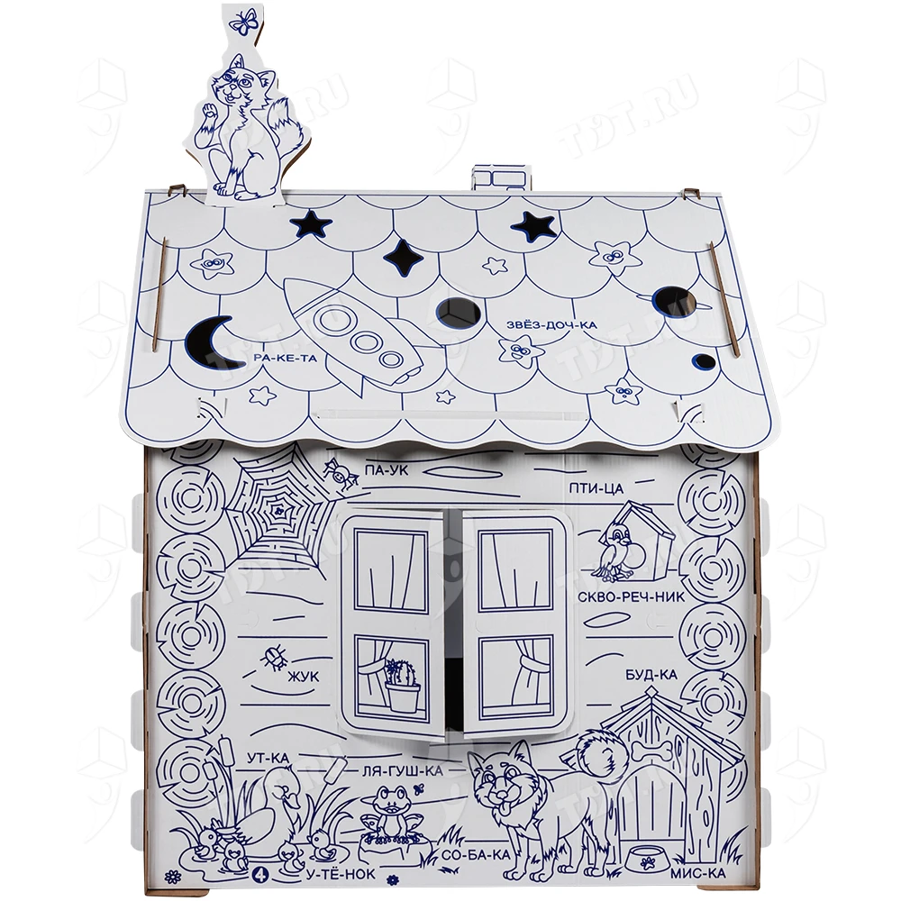 Картонный домик-раскраска «Кто здесь живёт», длиной 950 мм, шириной 750 мм и высотой 1300 мм. Изготовлен из трёхслойного гофрокартона марки Т-24 В.