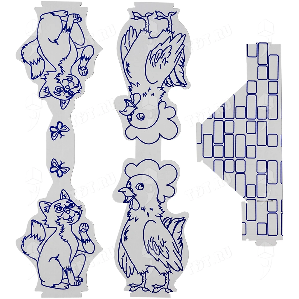 В комплекте идут 2 фигурки животных (кошка и петух) и труба.