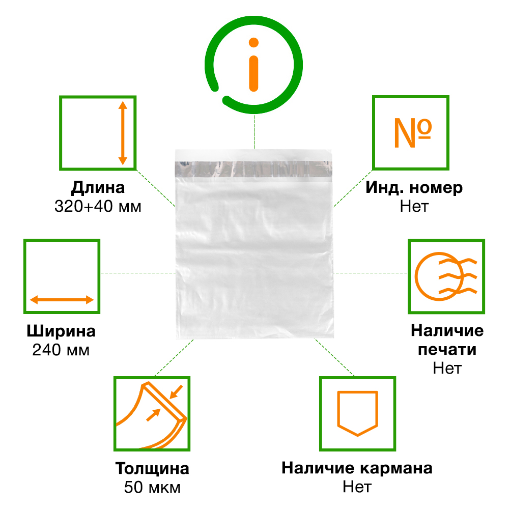 Прозрачный курьер-пакет без кармана, без печати, длиной 320+40 мм, шириной 240 мм, толщиной 50 мкм. В упаковке 100 штук.