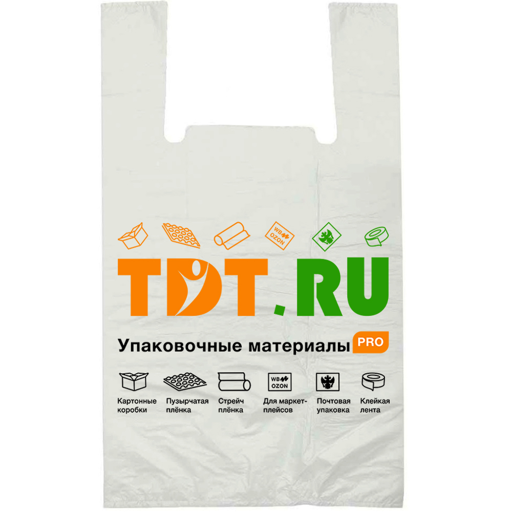 Полиэтиленовые пакеты майка ПНД «TDT» белого цвета, длиной 60 см, шириной 40+10 см, толщиной 30 мкм, реализуется поштучно. Материал – полиэтилен низкого давления. Производятся в России.