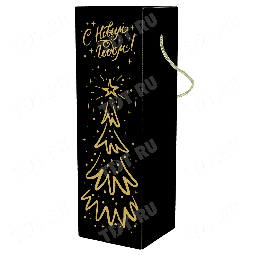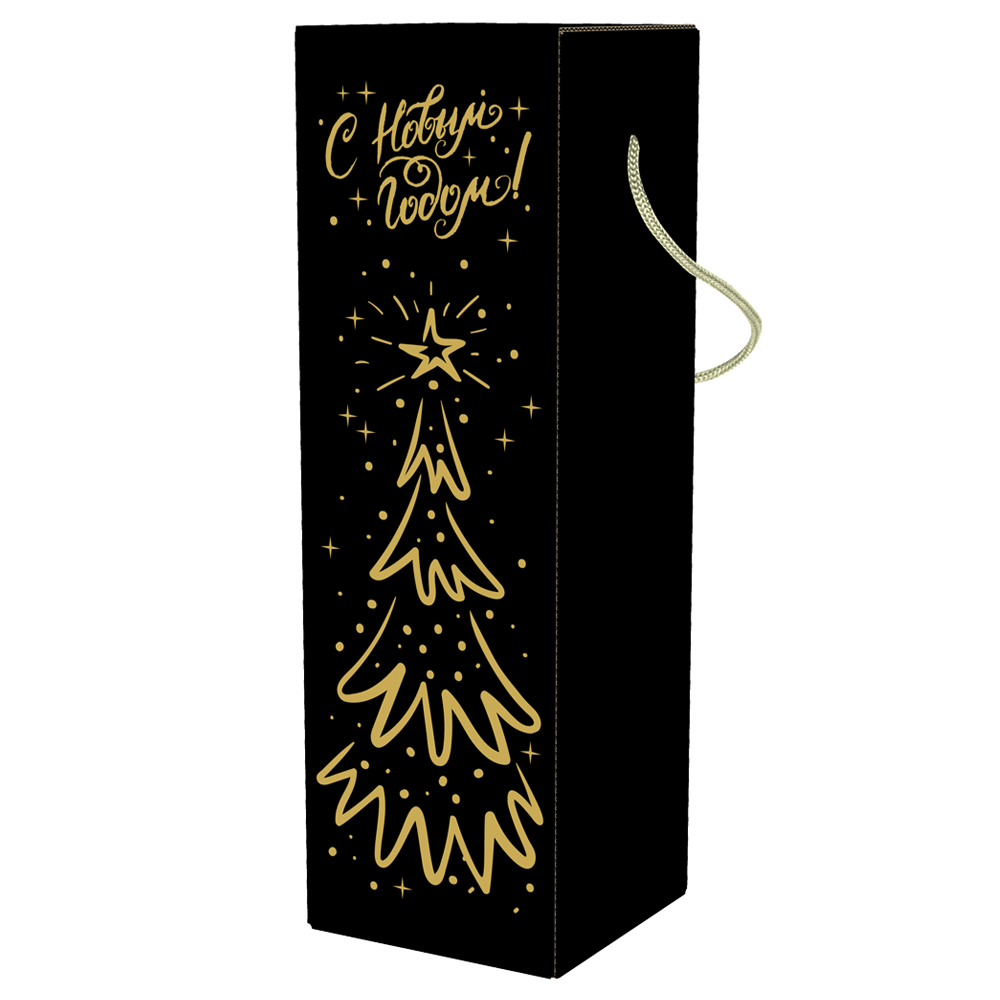 Подарочная коробка для бутылки шампанского «Дракон на черном», длиной 110 мм, шириной 110 мм и высотой 370 мм, веревочная ручка. Тематическая надпись: «С Новым годом!». Изготовлена из картона. Полезный объём — 4.48 л.