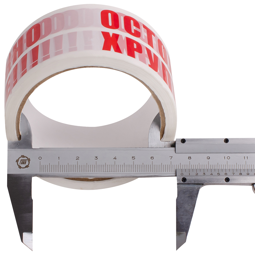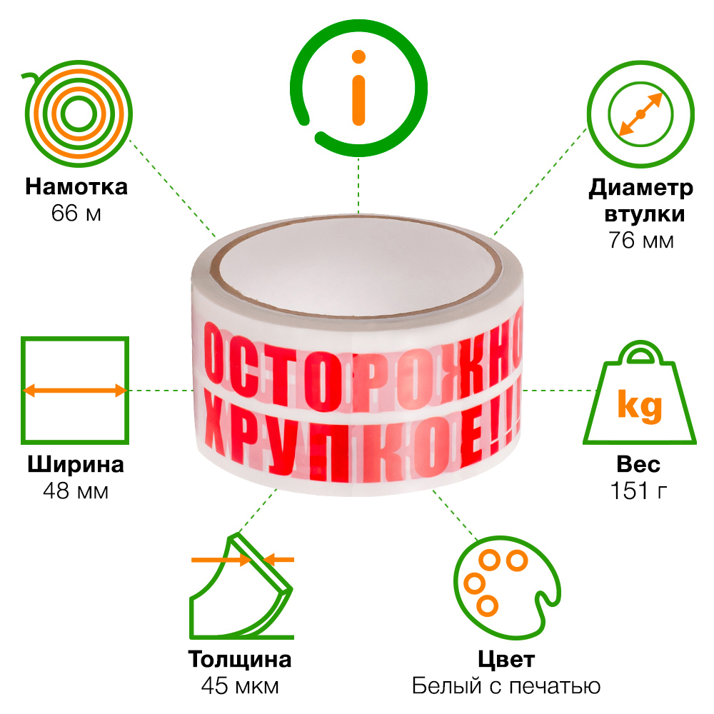 Белая клейкая лента с красной надписью «Осторожно хрупкое» шириной 48 мм, диаметром втулки 76 мм, намоткой 66 метров, толщиной 45 мкм. Изготовлена на основе полипропилена.