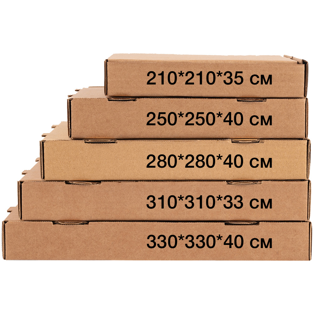 Бурая коробка для пиццы, длиной 250 мм, шириной 250 мм и высотой 40 мм. Изготовлена из трехслойного картона марки Т-23. Полезный объём — 2.5 л. Производится в России.