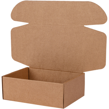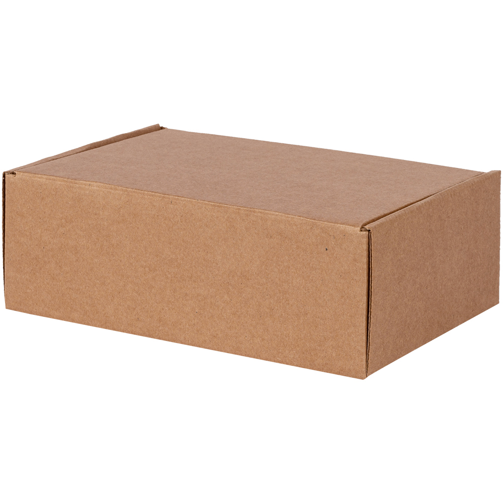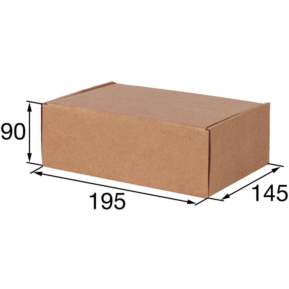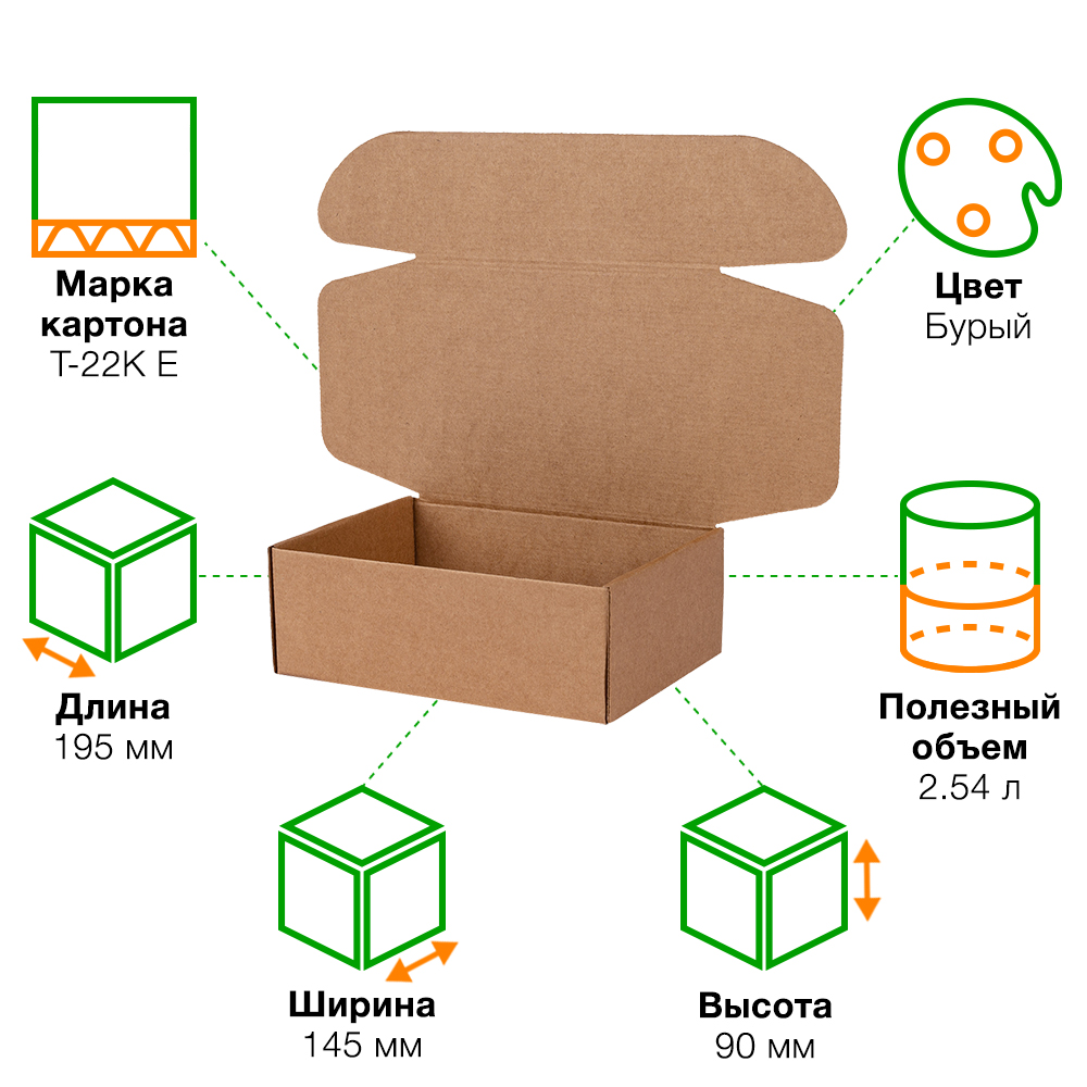 Самосборный короб №144, бурого цвета, длиной 195 мм, шириной 145 мм и высотой 90 мм. Изготовлен из микрогофрокартона Т-22К Е. Полезный объём — 2.54 л.