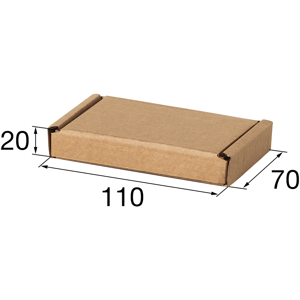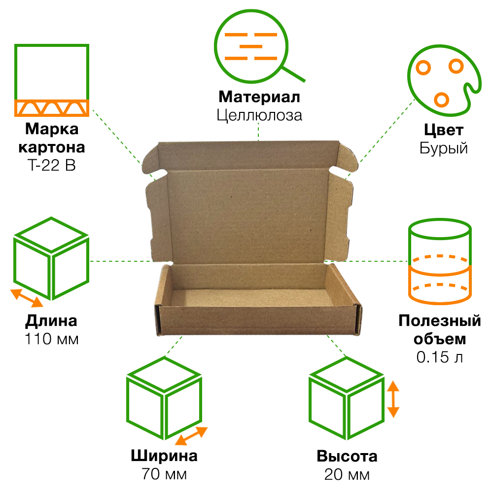 Самосборный короб №148, бурого цвета, длиной 110 мм, шириной 70 мм и высотой 20 мм. Изготовлен из микрогофрокартона Т-22 В. Полезный объём — 0.15 л.