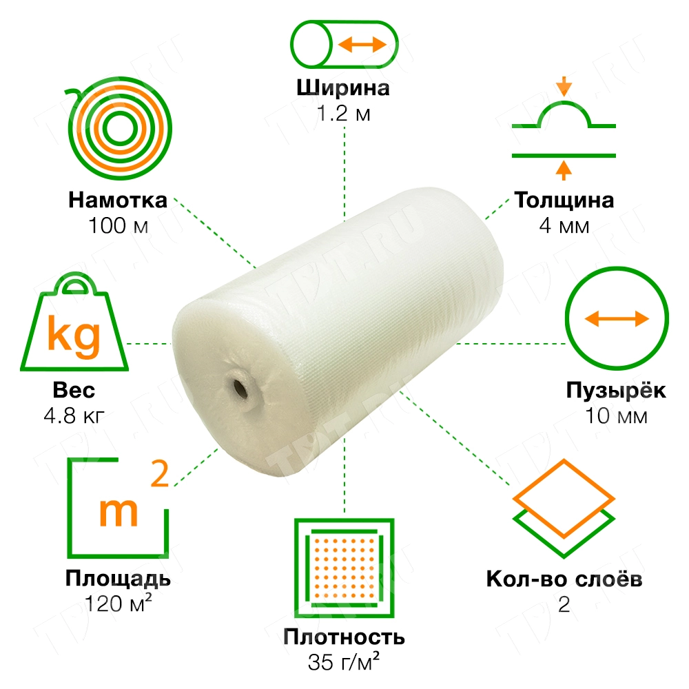 Прозрачная двухслойная воздушно-пузырчатая пленка «Оптима», намоткой 100 м, шириной рулона 1.2 м, диаметром пузырька 10 мм, плотностью 35 г/м². Изготовлена из полиэтилена. Производится в России.