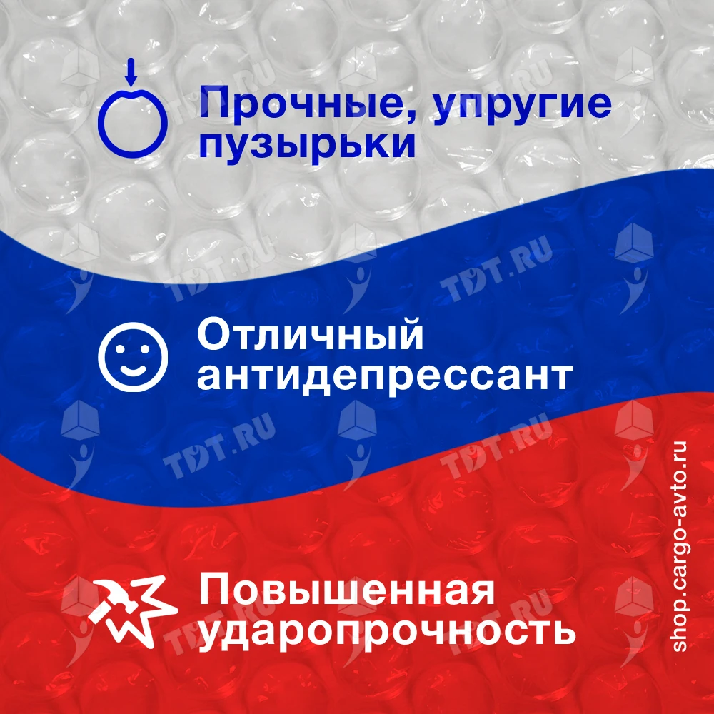 Листы из трехслойной воздушно-пузырчатой пленки, длиной 20 см, шириной 20 см, диаметром пузырька 10 мм, плотностью 60 г/м². В упаковке 100 листов. Изготовлены из полиэтилена. Производятся в России.