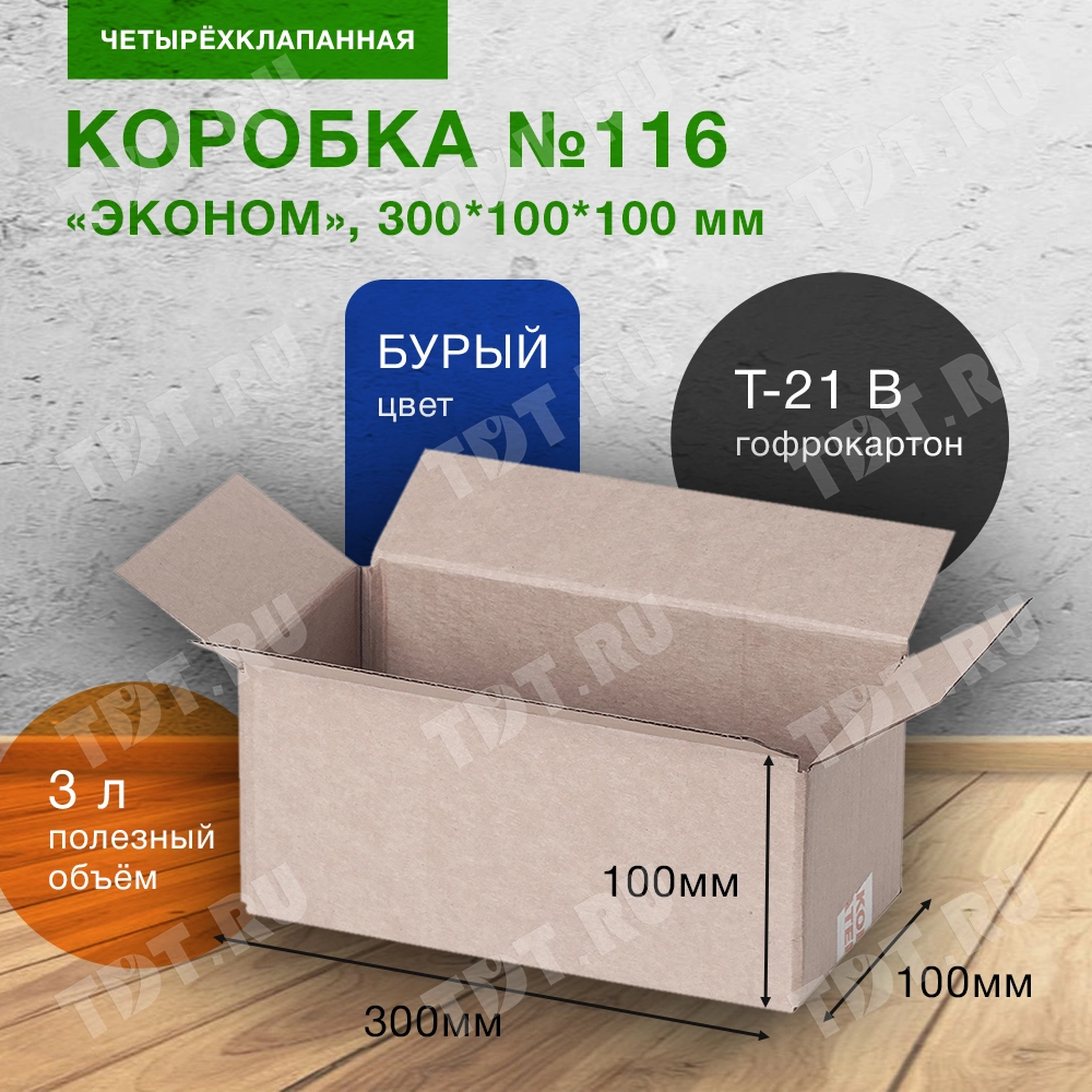 Короб «ЭКОНОМ» №116, длиной 300 мм, шириной 100 мм и высотой 100 мм. Изготовлен из трехслойного картона марки Т-21 В (100% вторсырье). Полезный объём — 3 л.