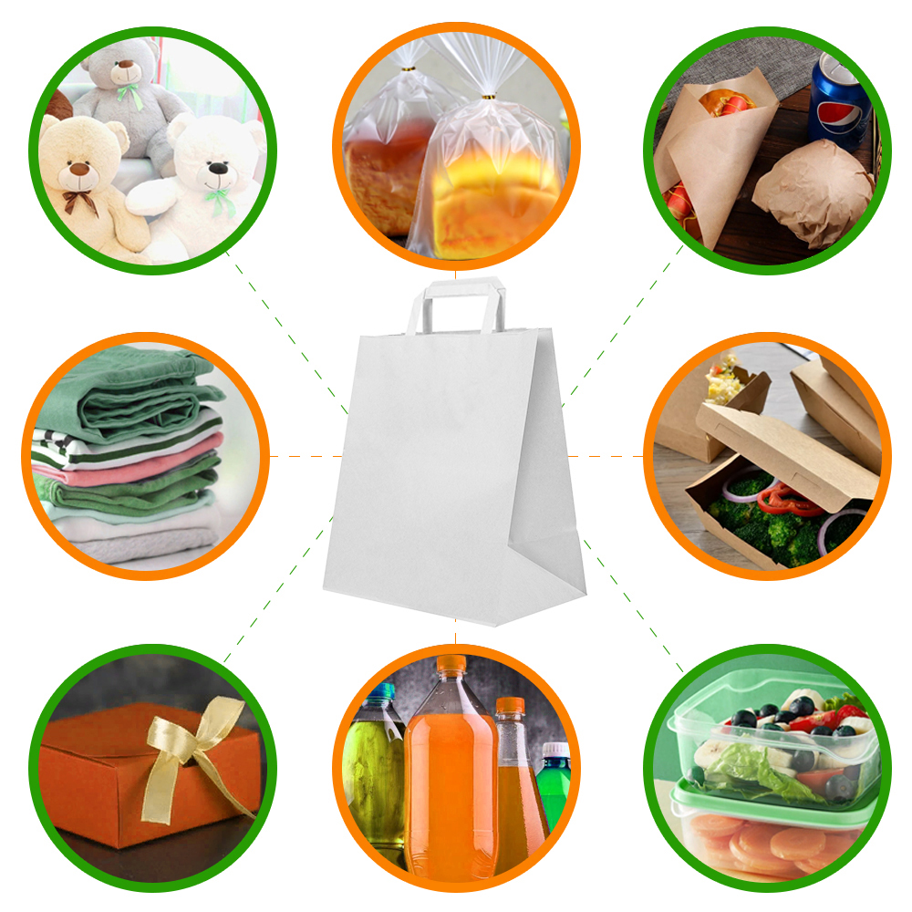 Пакеты с плоской ручкой используются для упаковки, переноски, хранения продуктов питания и бытовых товаров. Они незаменимы в магазинах, пекарнях, кафе, ресторанах и на фудкортах.