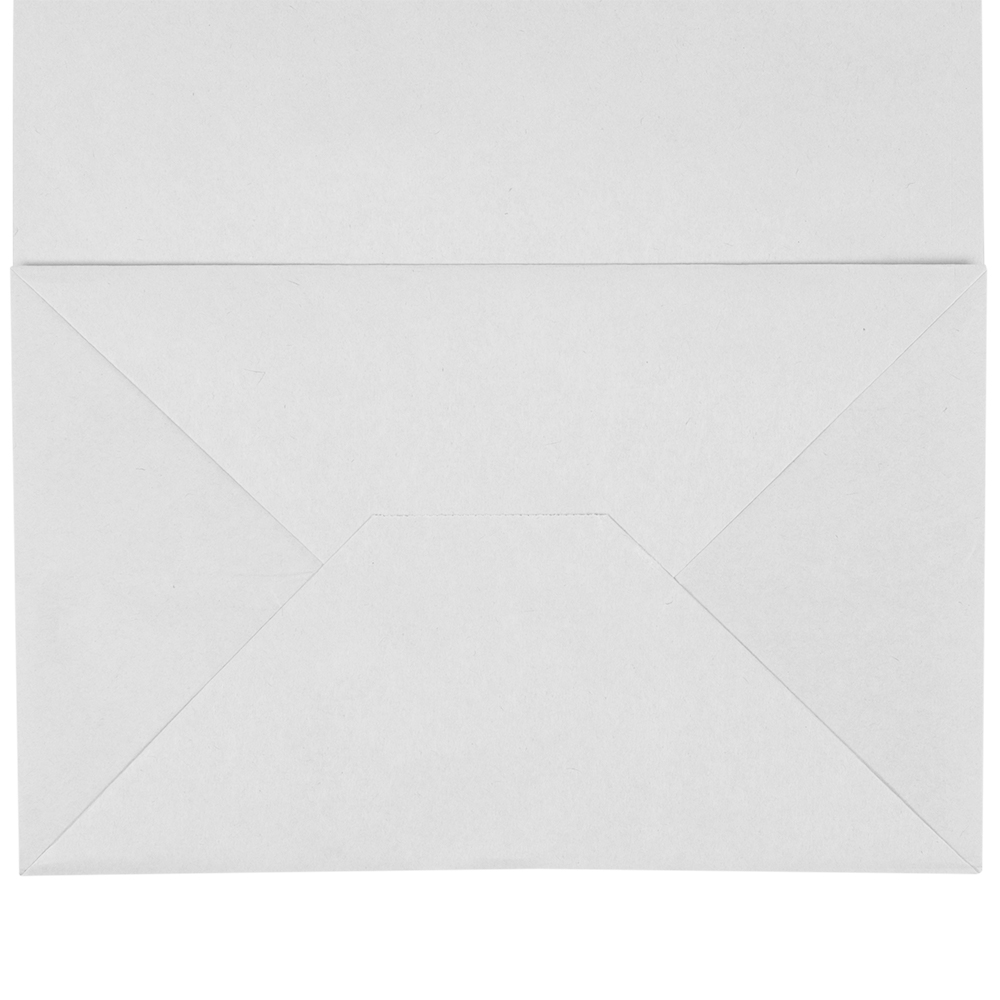 Белый крафт-пакет с плоской ручкой длиной 240 мм, шириной 140 мм, высотой 280 мм. Пакеты производятся в России.