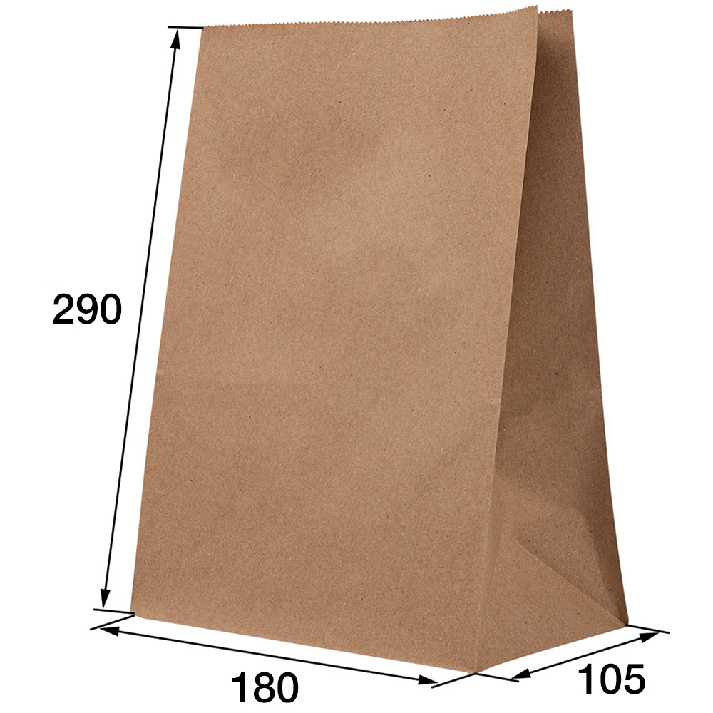 Бумажный крафт пакет с прямоугольным дном без ручек длиной 180 мм, шириной 105 мм, высотой 290 мм, плотностью 70 г/м². Пакеты производятся в России.