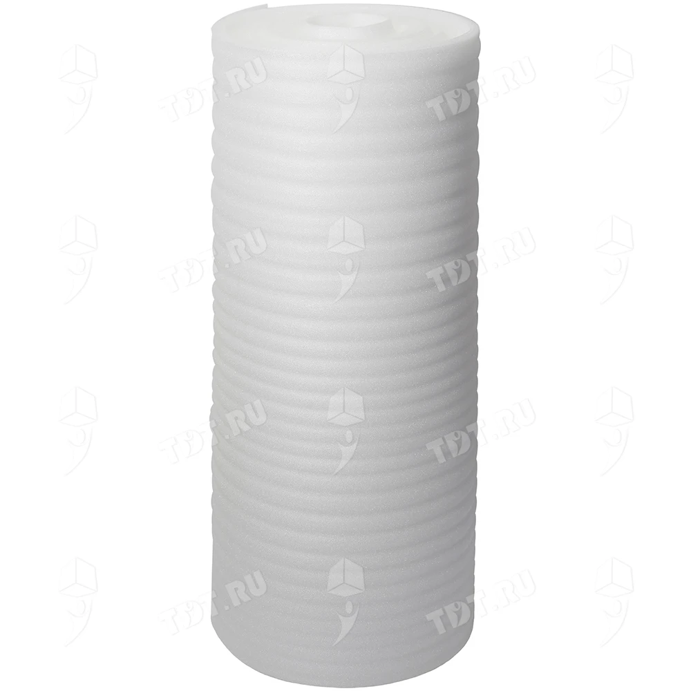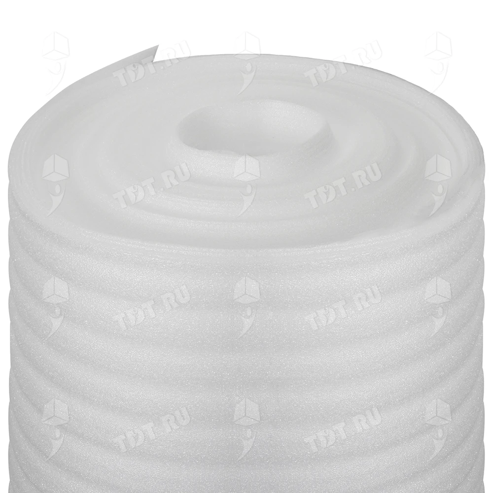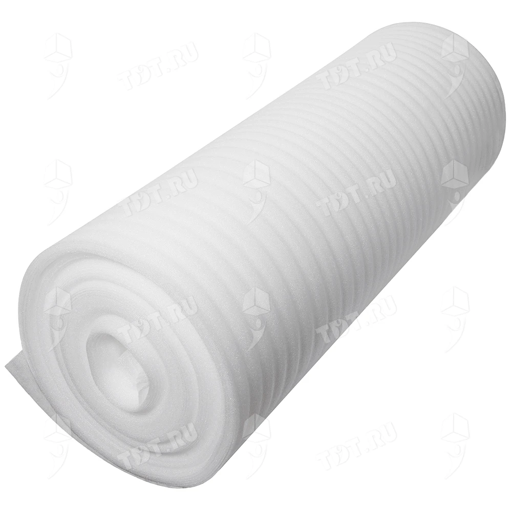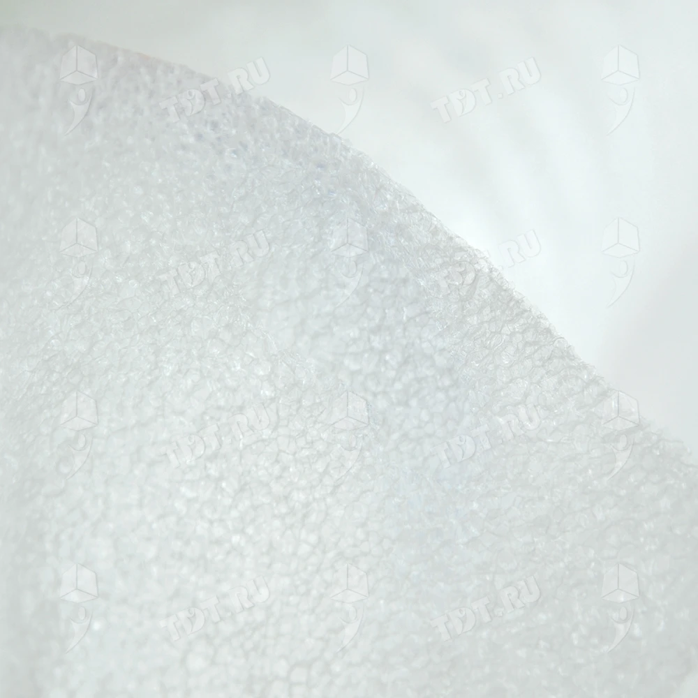 Вспененный полиэтилен, белого цвета, намоткой 50 м, толщиной 2 мм, шириной 1 м, площадью 50 м². Производится в России.