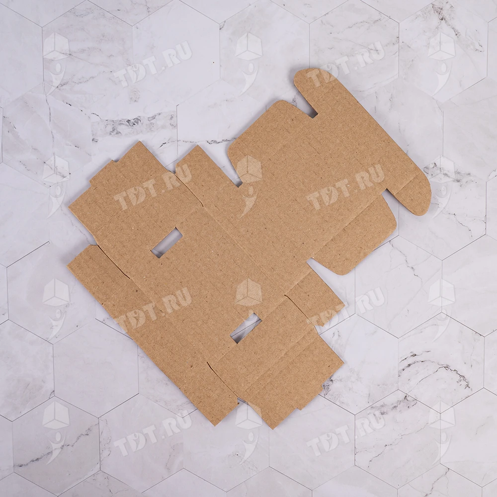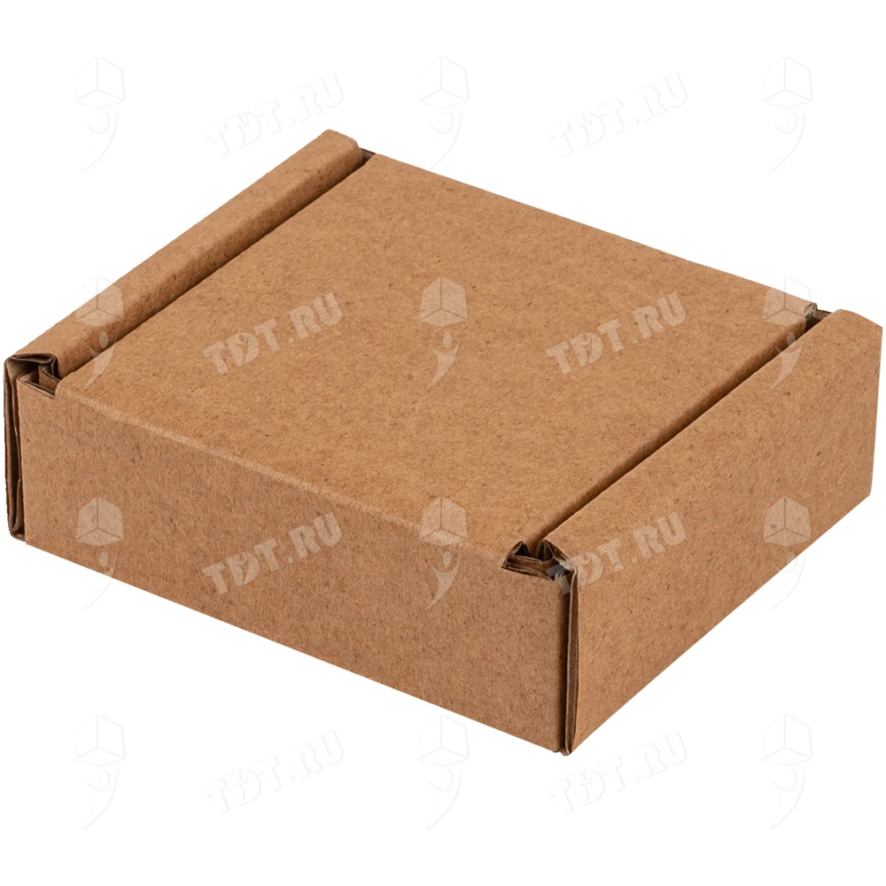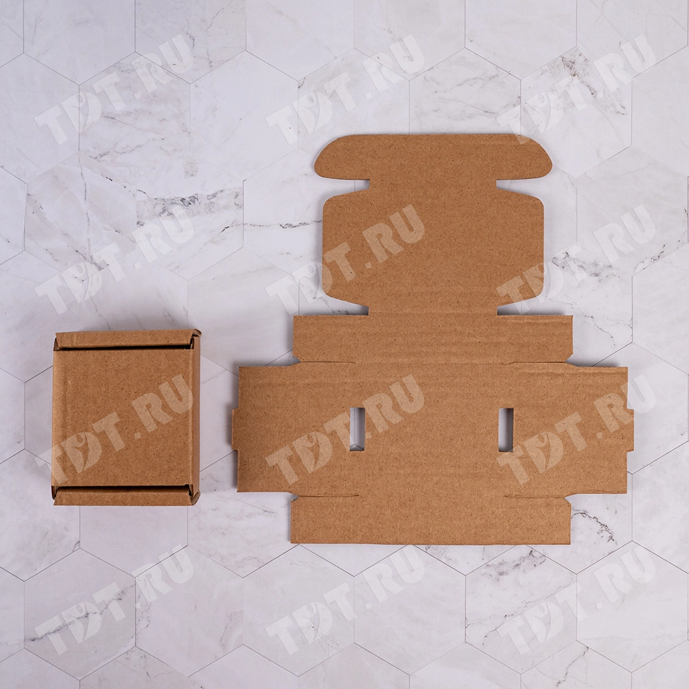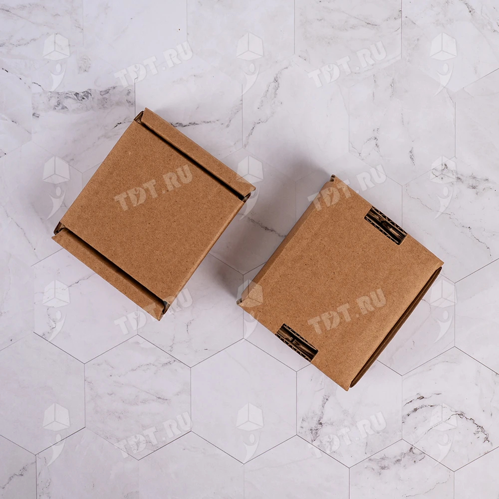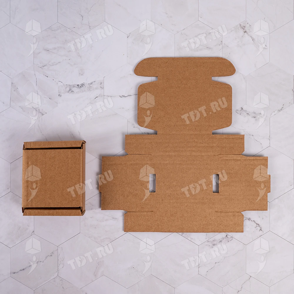 Самосборный короб №126 бурого цвета, длиной 80 мм, шириной 80 мм и высотой 30 мм. Изготовлен из гофрокартона Т-23 В. Полезный объём — 0.192 л.