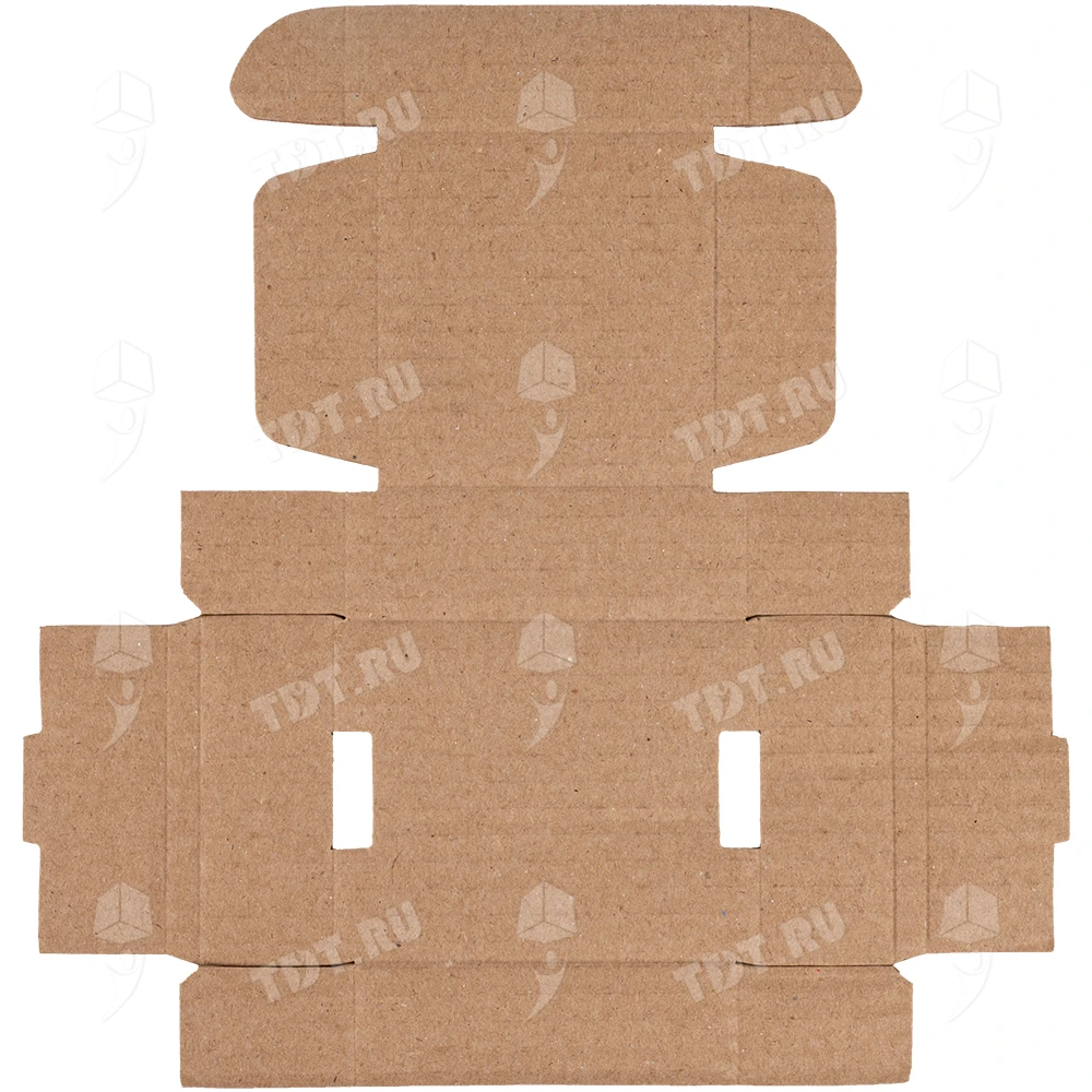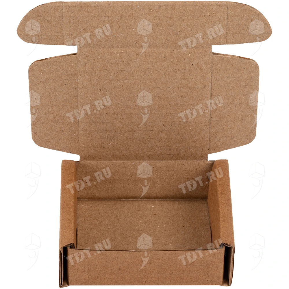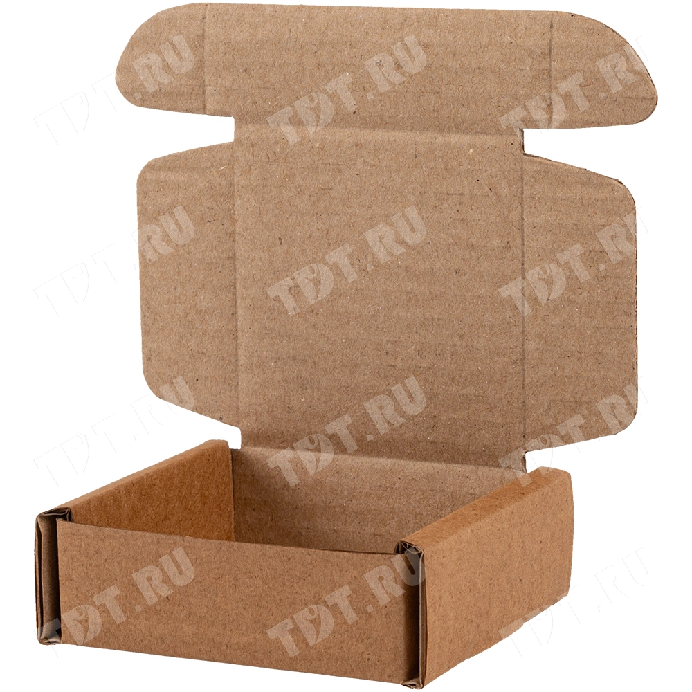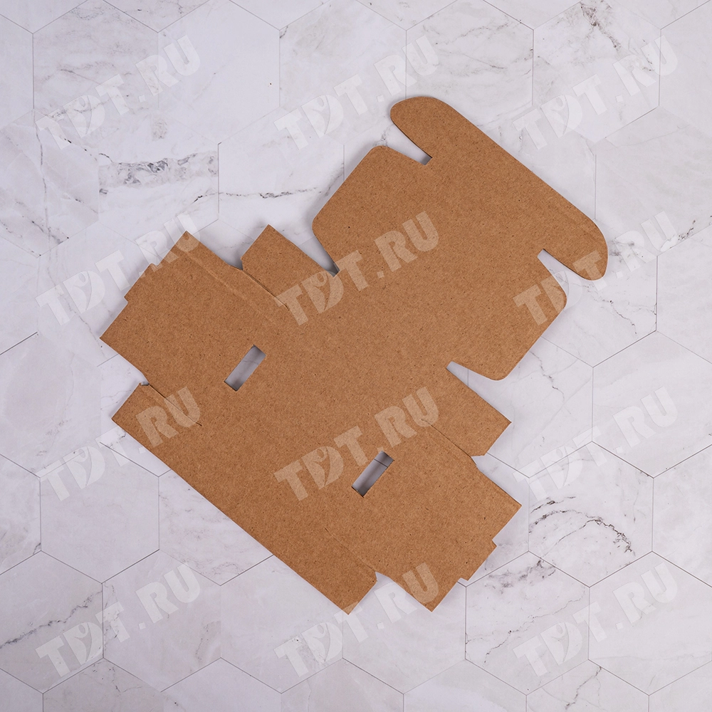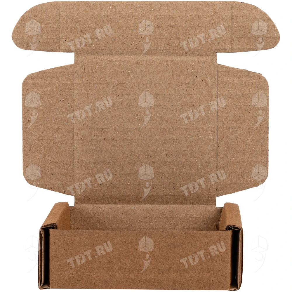 Самосборный короб №126 бурого цвета, длиной 80 мм, шириной 80 мм и высотой 30 мм. Изготовлен из гофрокартона Т-23 В. Полезный объём — 0.192 л.