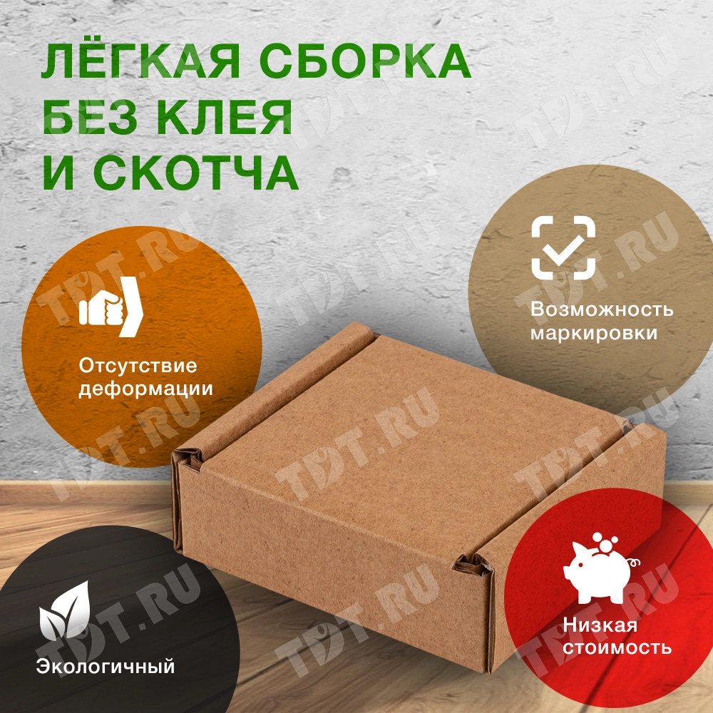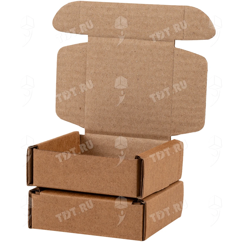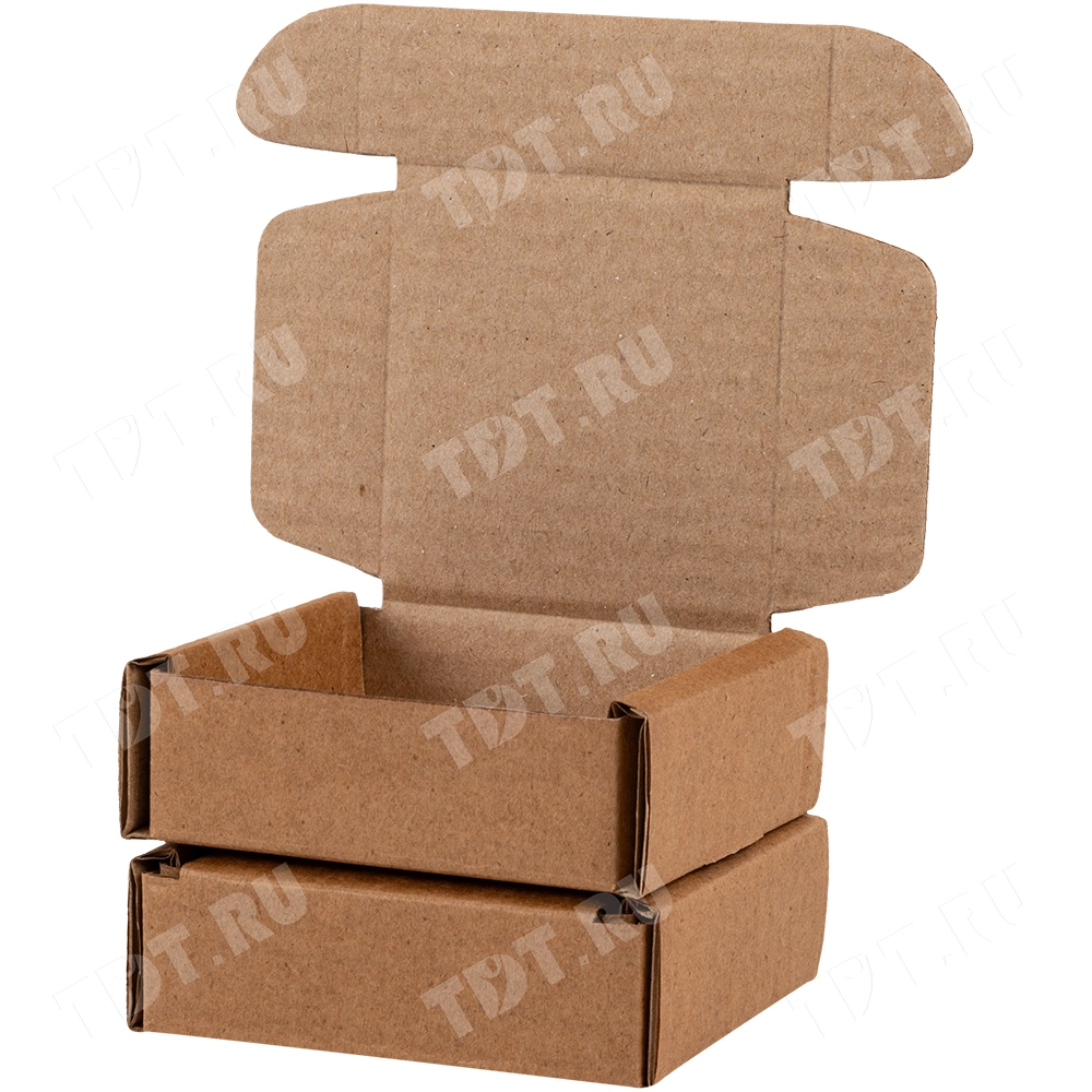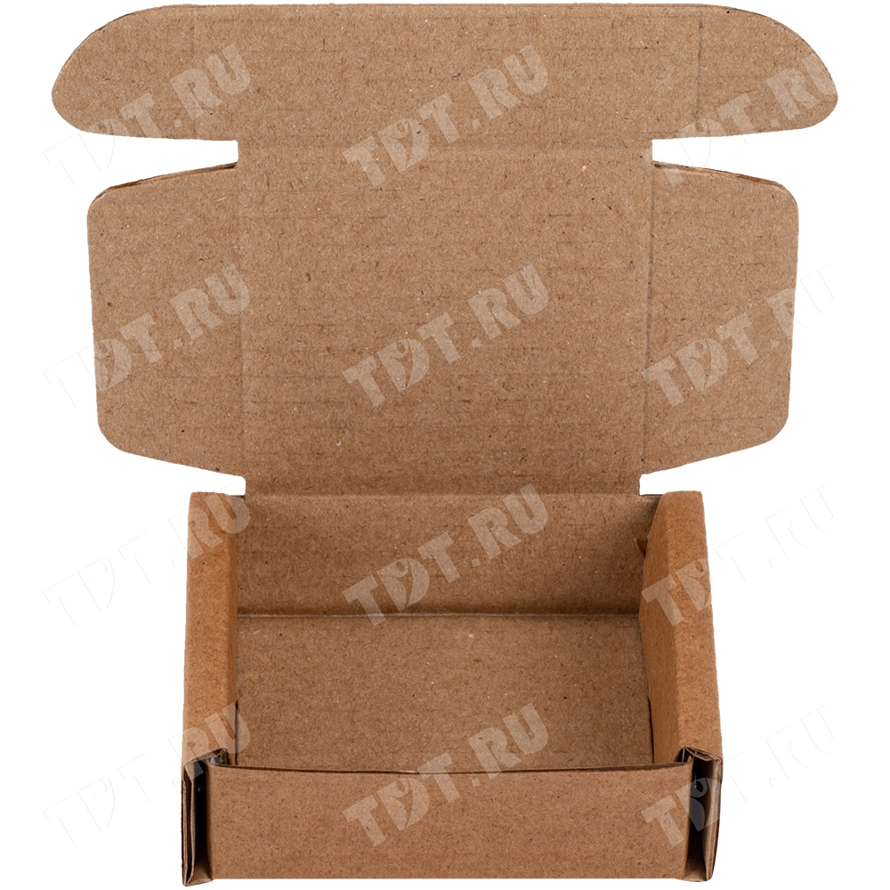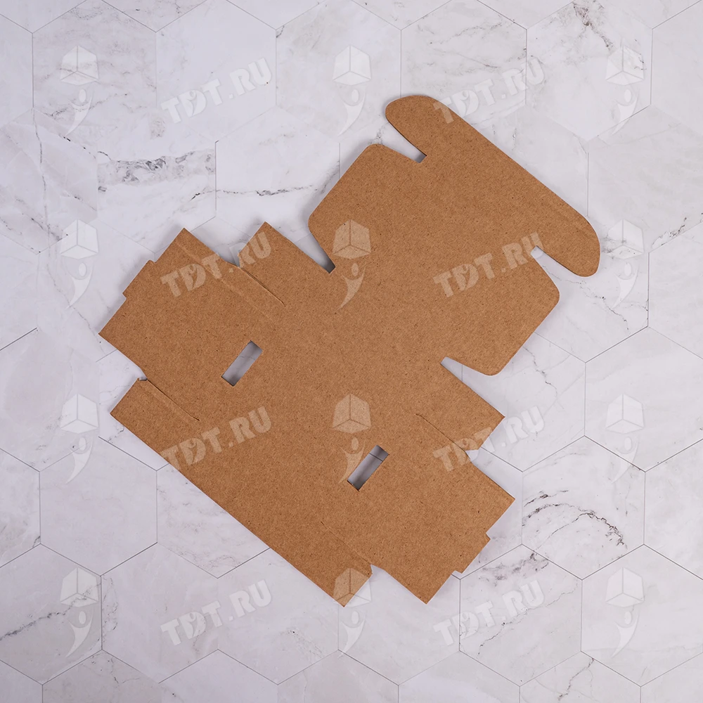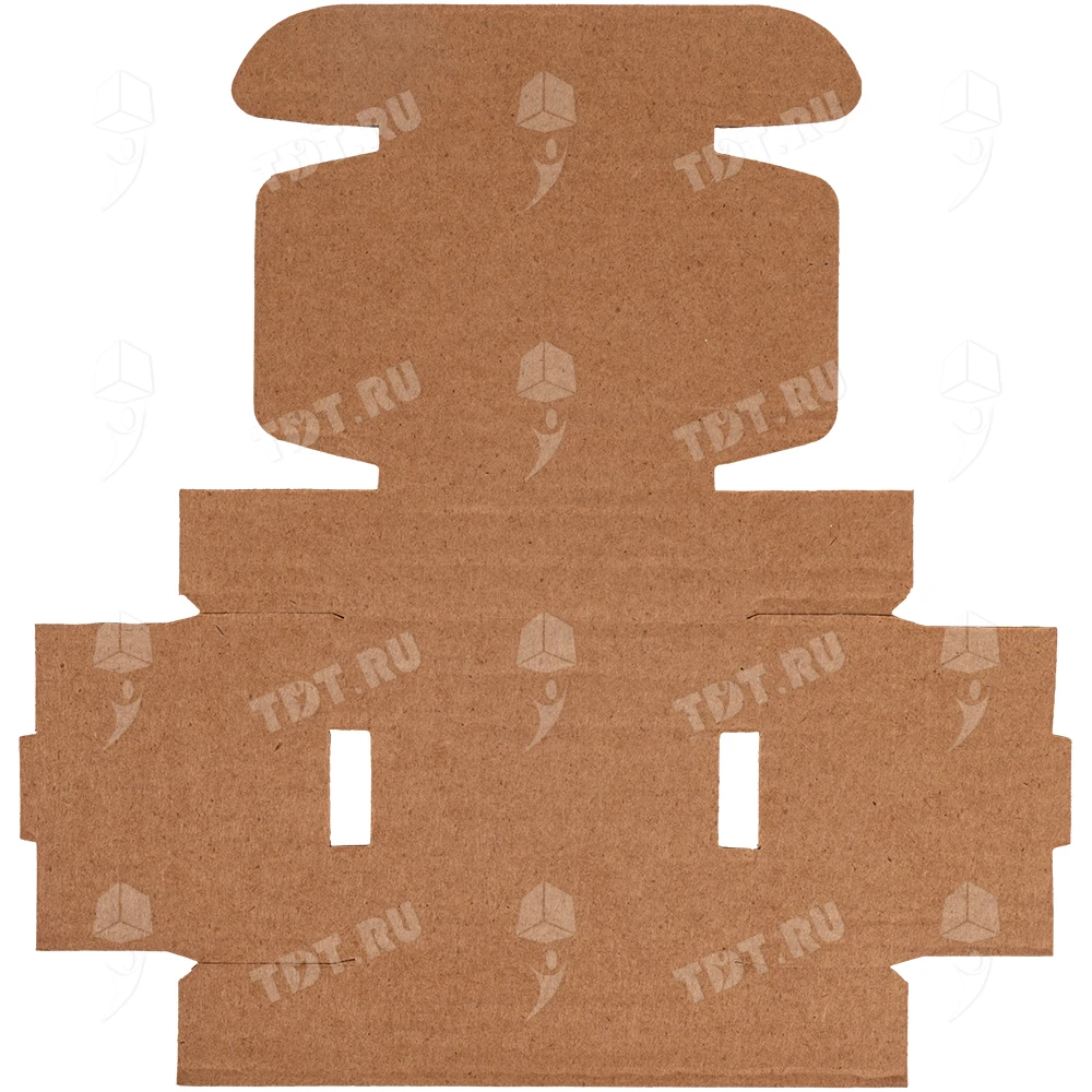 Самосборный короб №126 бурого цвета, длиной 80 мм, шириной 80 мм и высотой 30 мм. Изготовлен из гофрокартона Т-23 В. Полезный объём — 0.192 л.