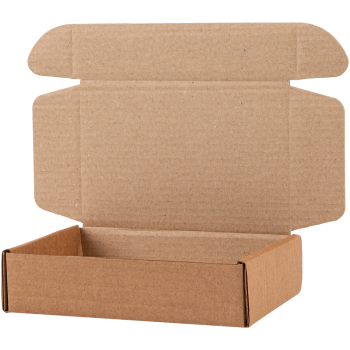 Самосборный короб №128 бурого цвета, длиной 200 мм, шириной 130 мм и высотой 50 мм. Изготовлен из гофрокартона Т-23 В. Полезный объём — 1.3 л.