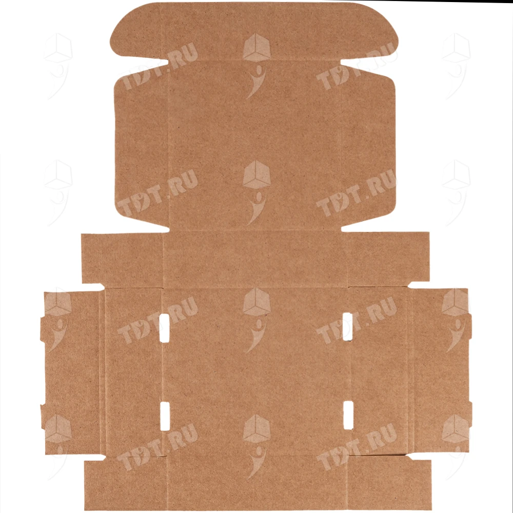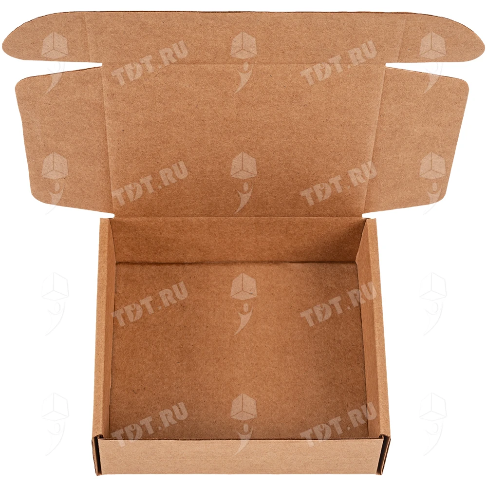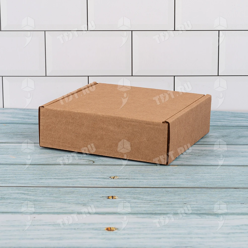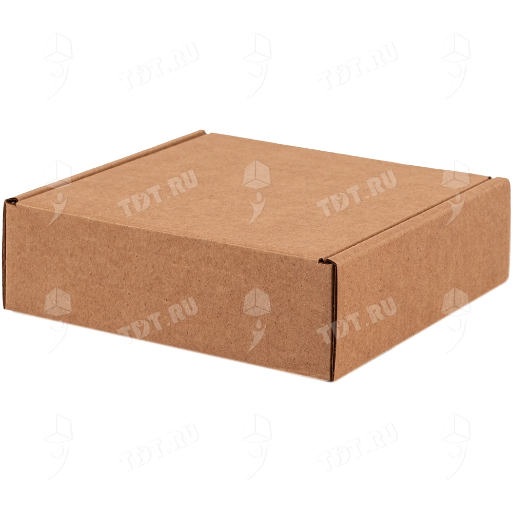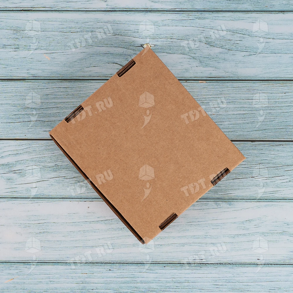 Самосборный короб №129 бурого цвета, длиной 125 мм, шириной 120 мм и высотой 40 мм. Изготовлен из гофрокартона Т-23 Е. Полезный объём — 0.6 л.