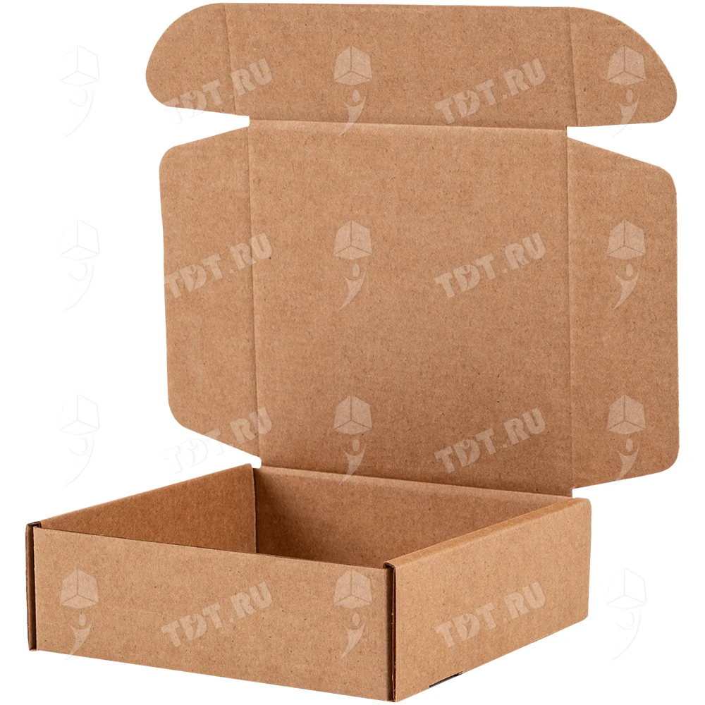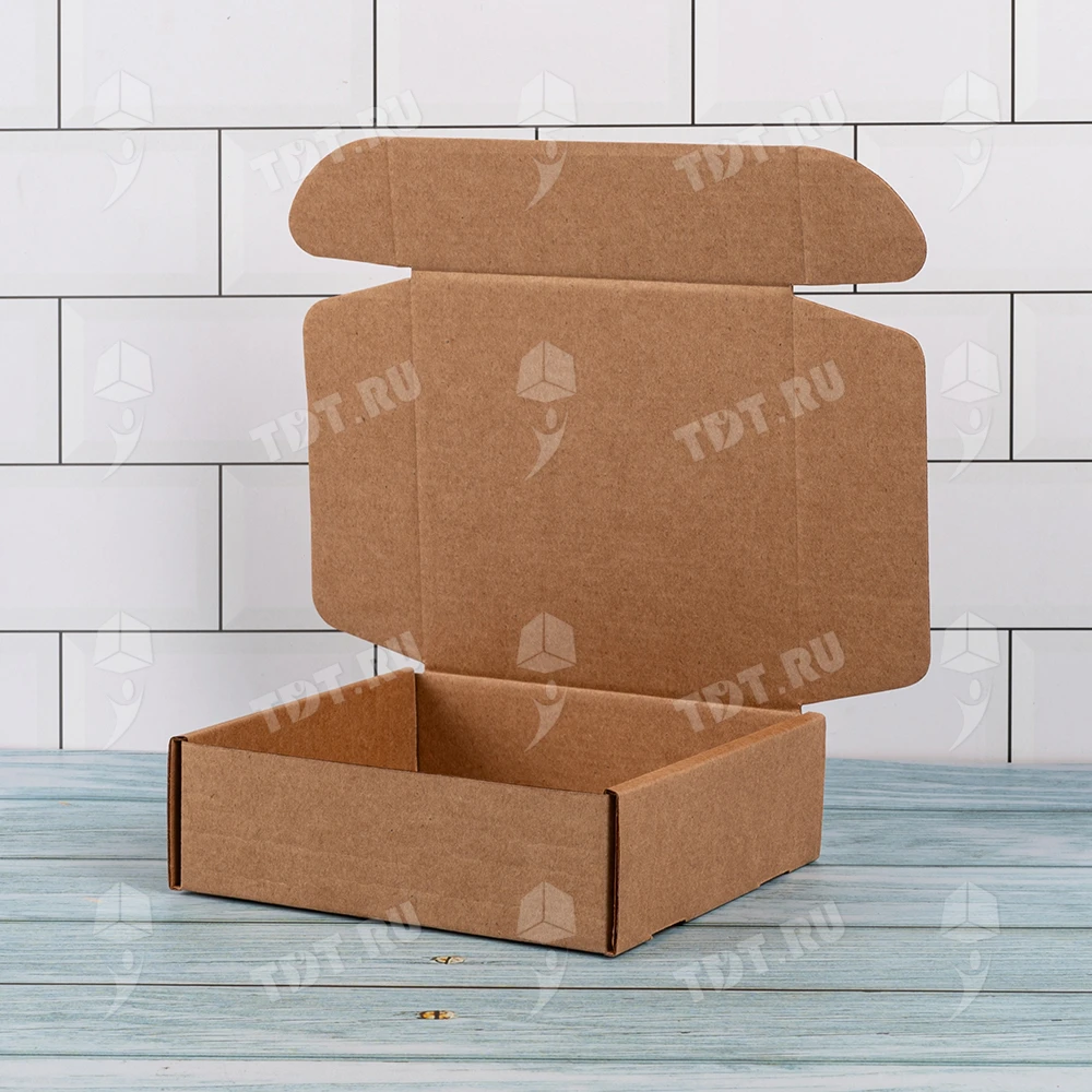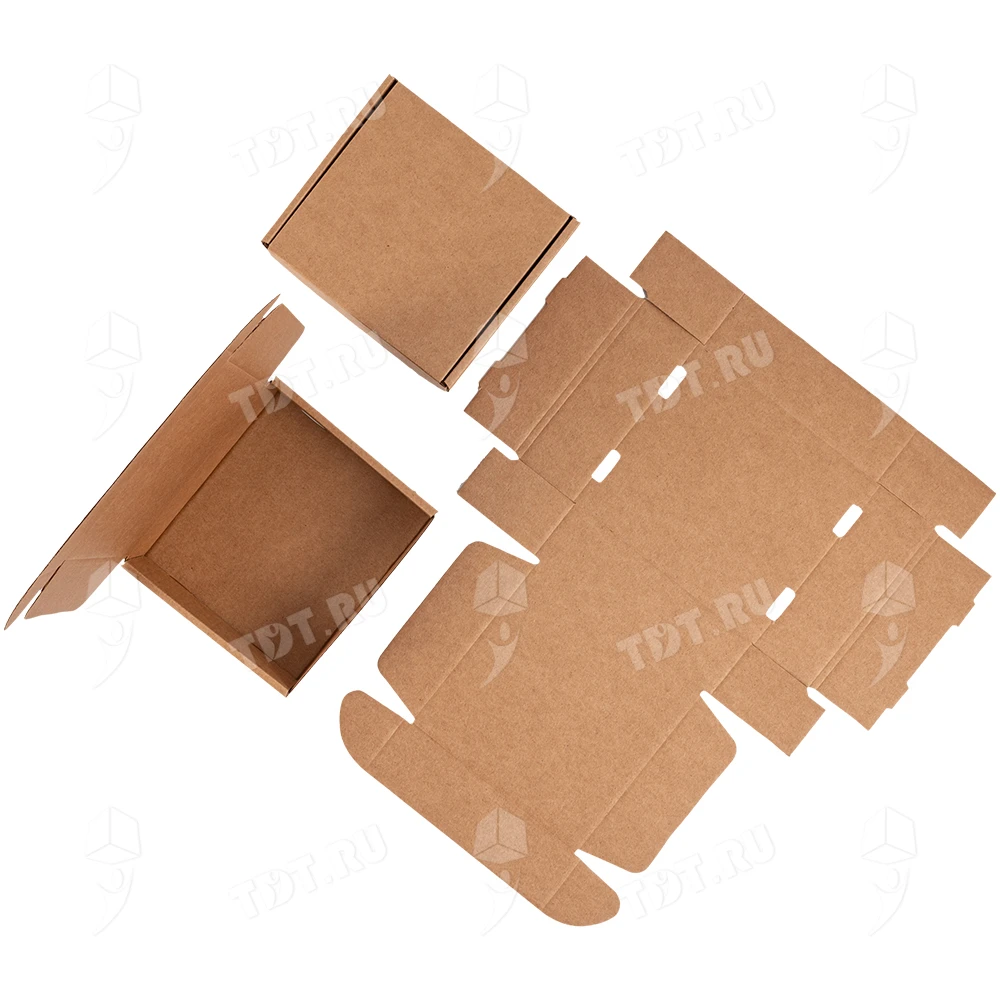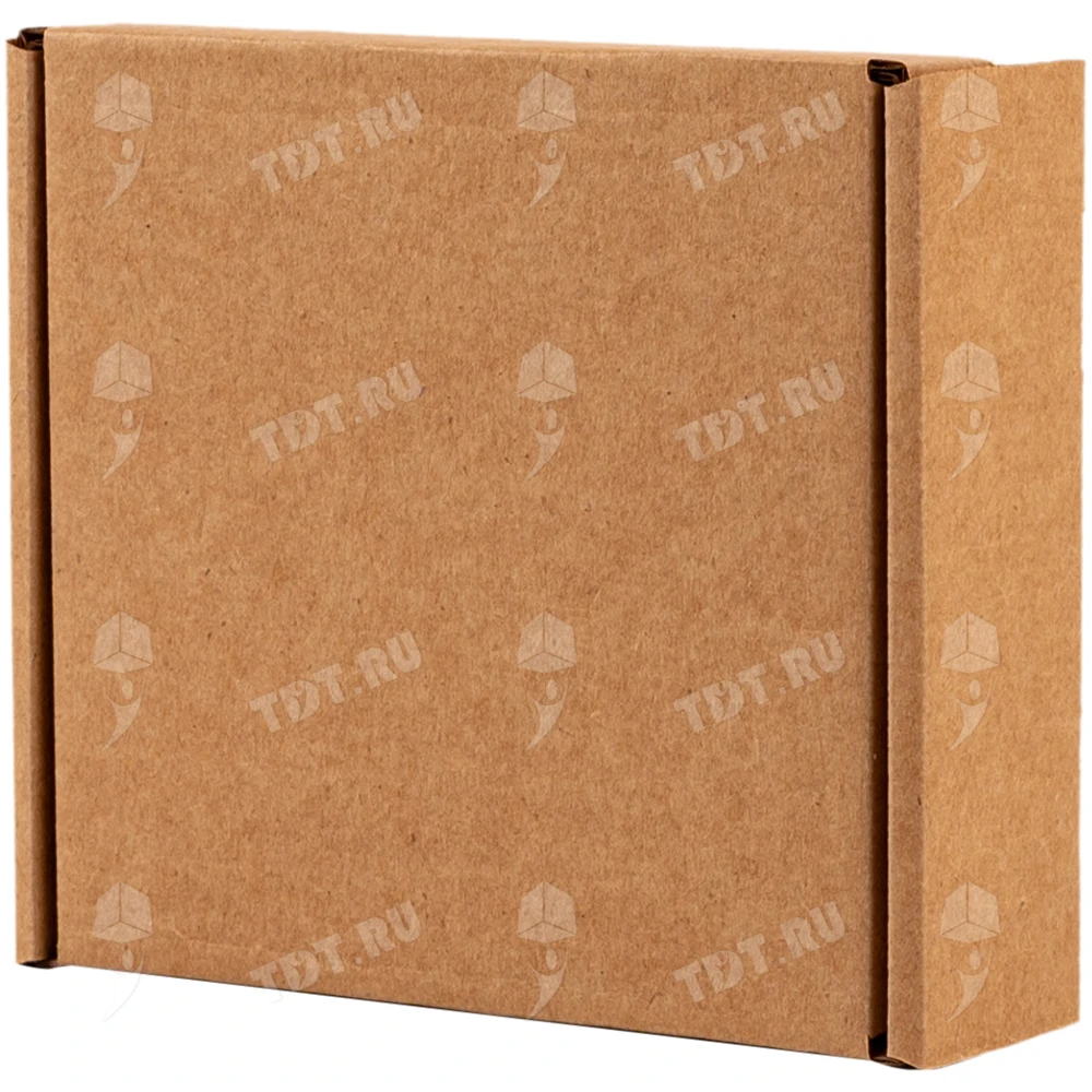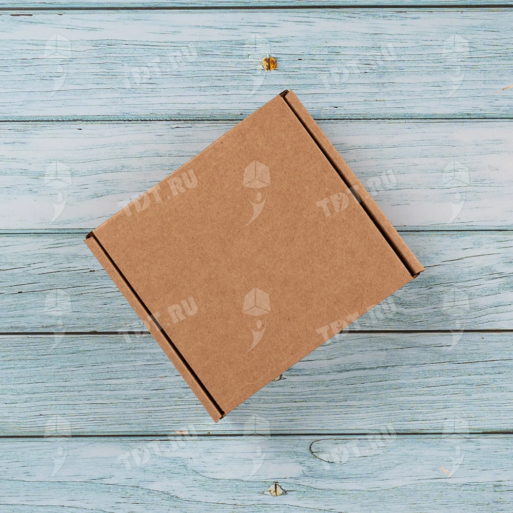 Самосборный короб №129 бурого цвета, длиной 125 мм, шириной 120 мм и высотой 40 мм. Изготовлен из гофрокартона Т-23 Е. Полезный объём — 0.6 л.