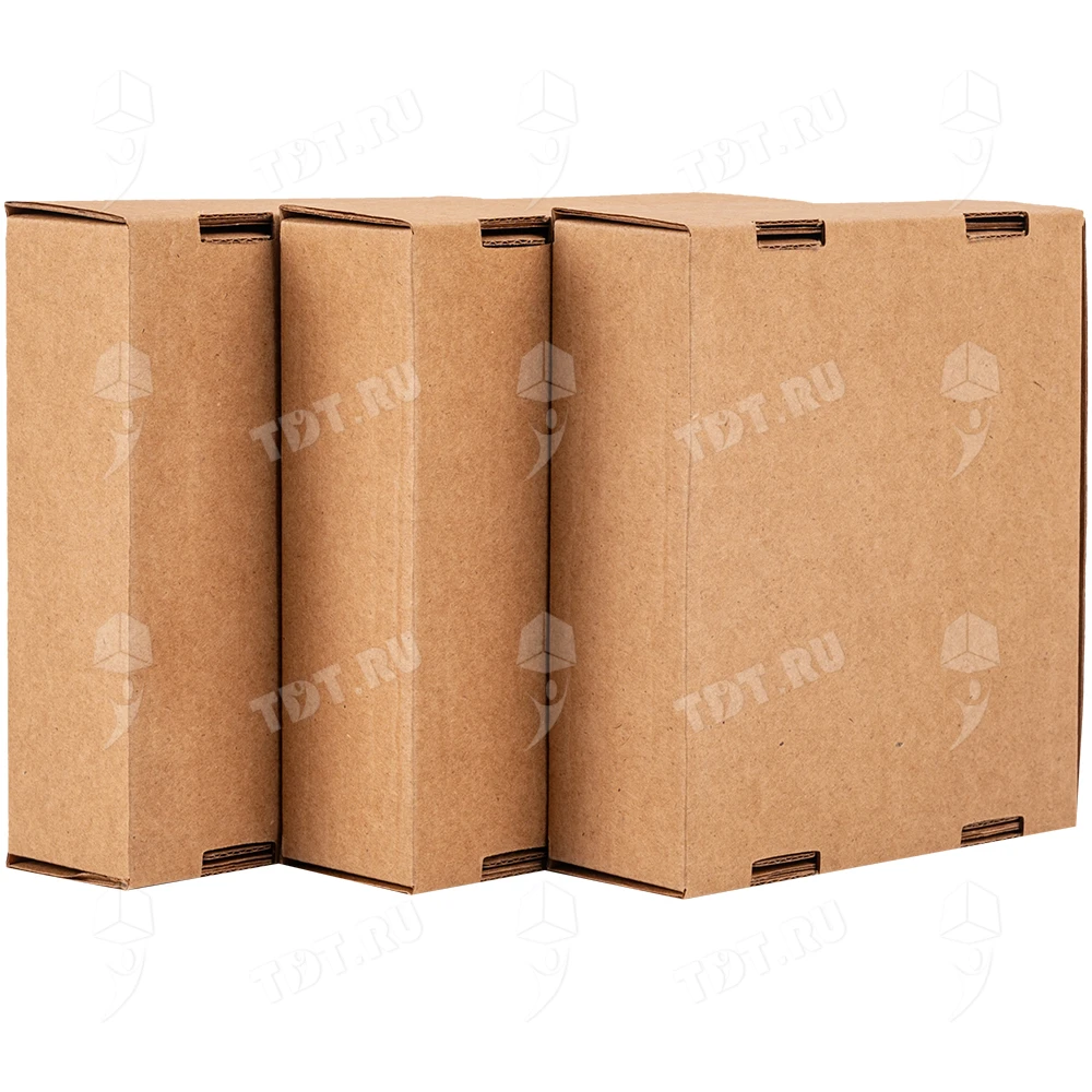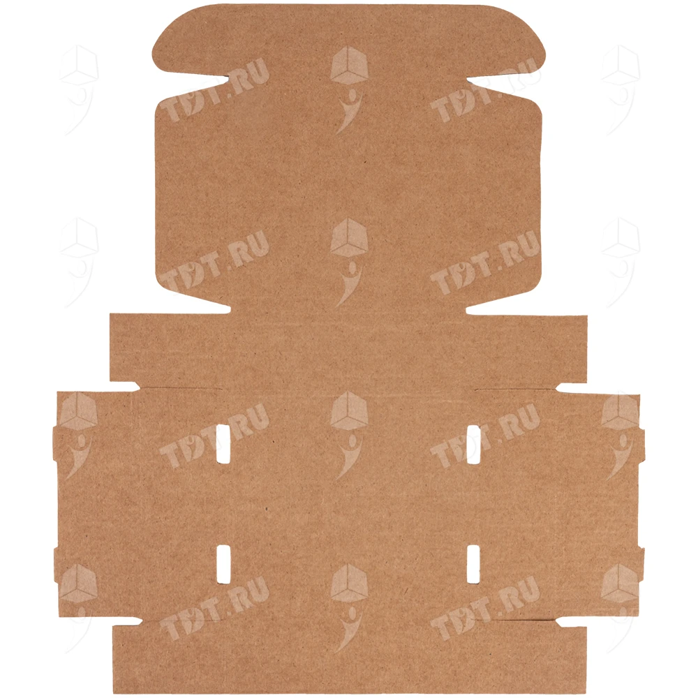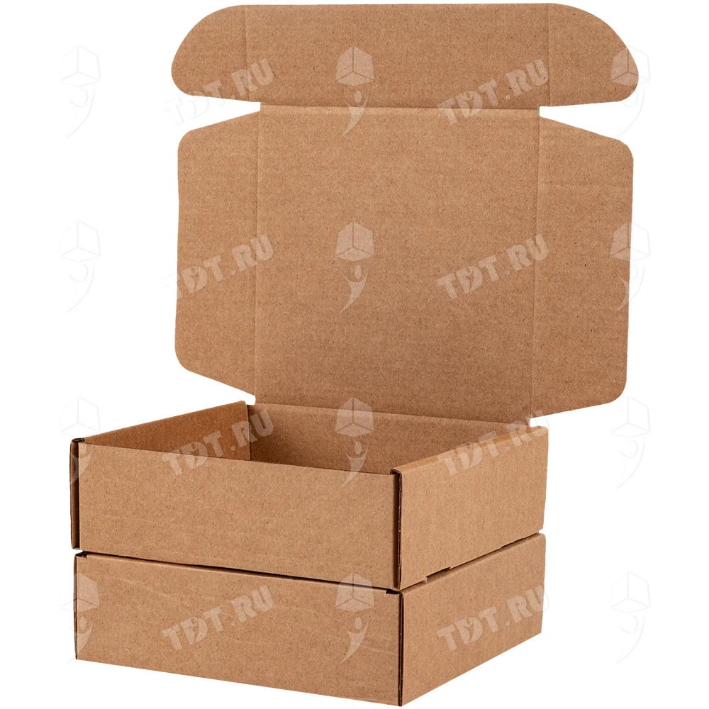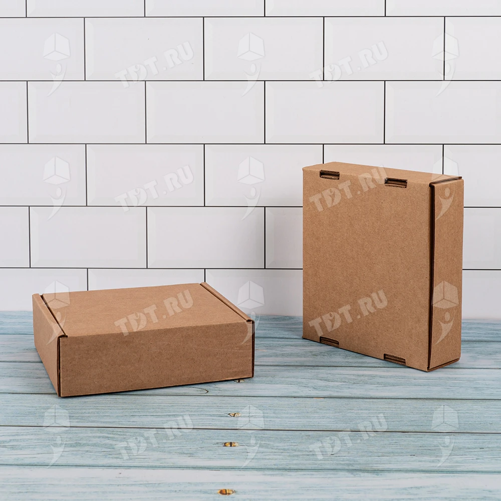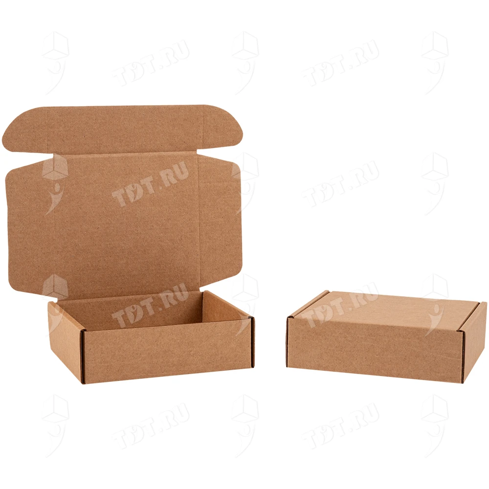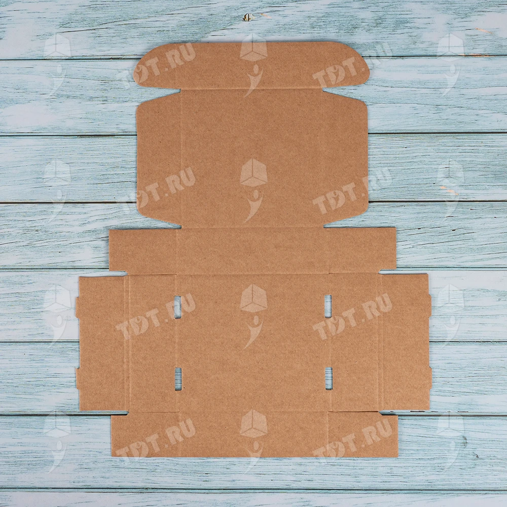 Самосборный короб №129 бурого цвета, длиной 125 мм, шириной 120 мм и высотой 40 мм. Изготовлен из гофрокартона Т-23 Е. Полезный объём — 0.6 л.