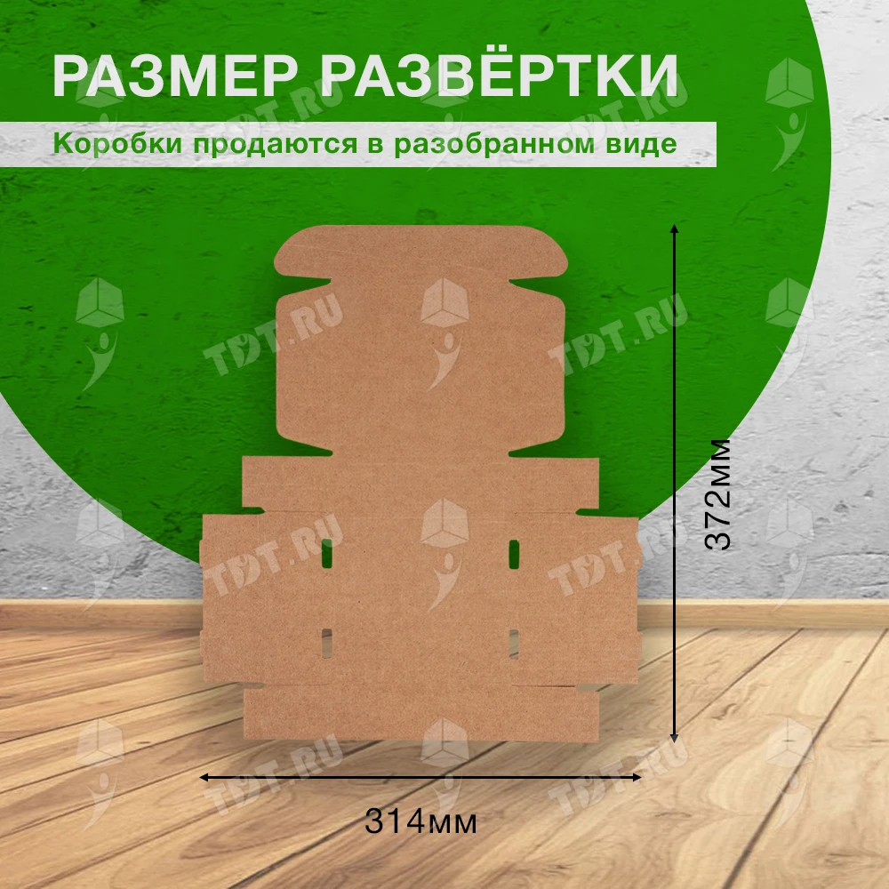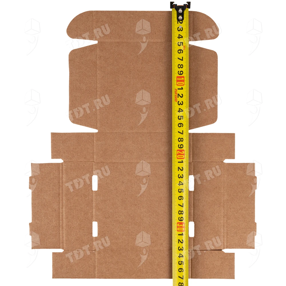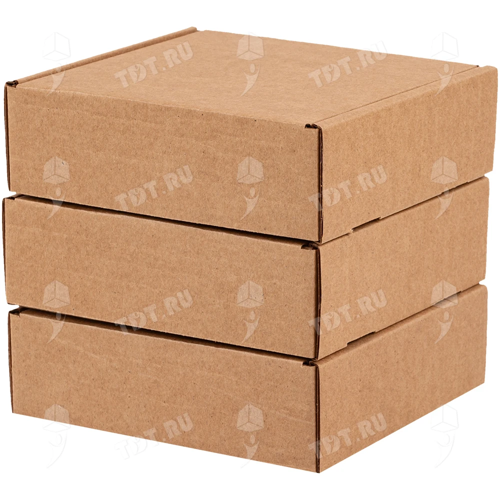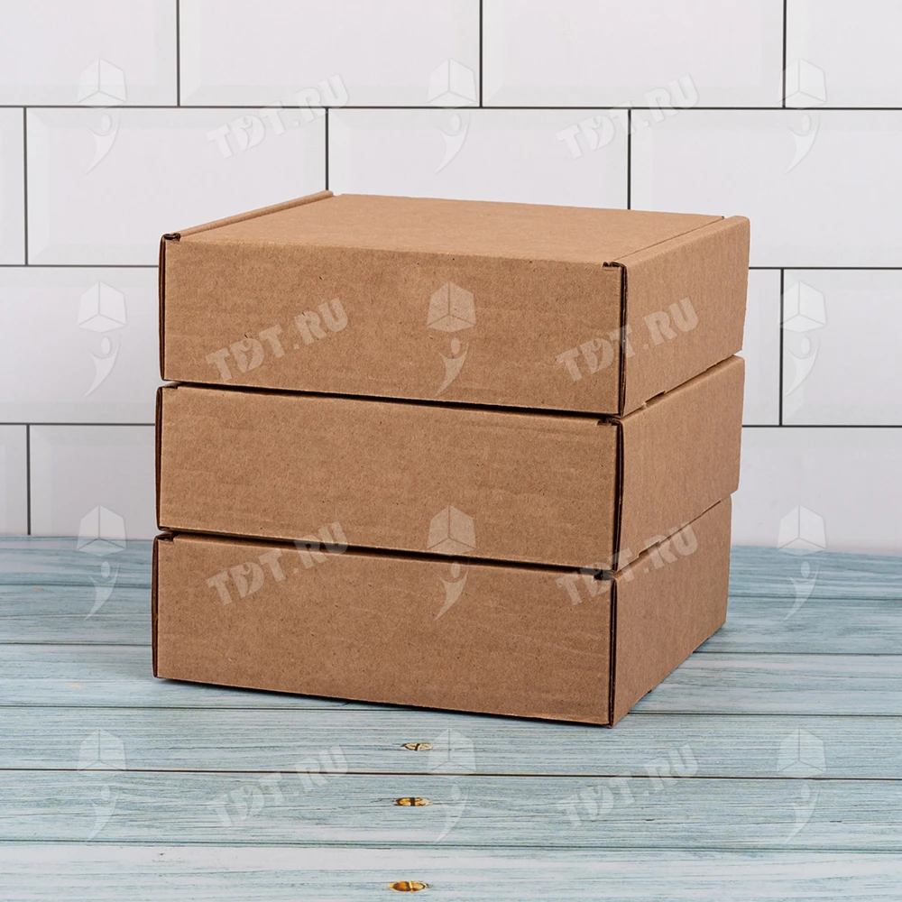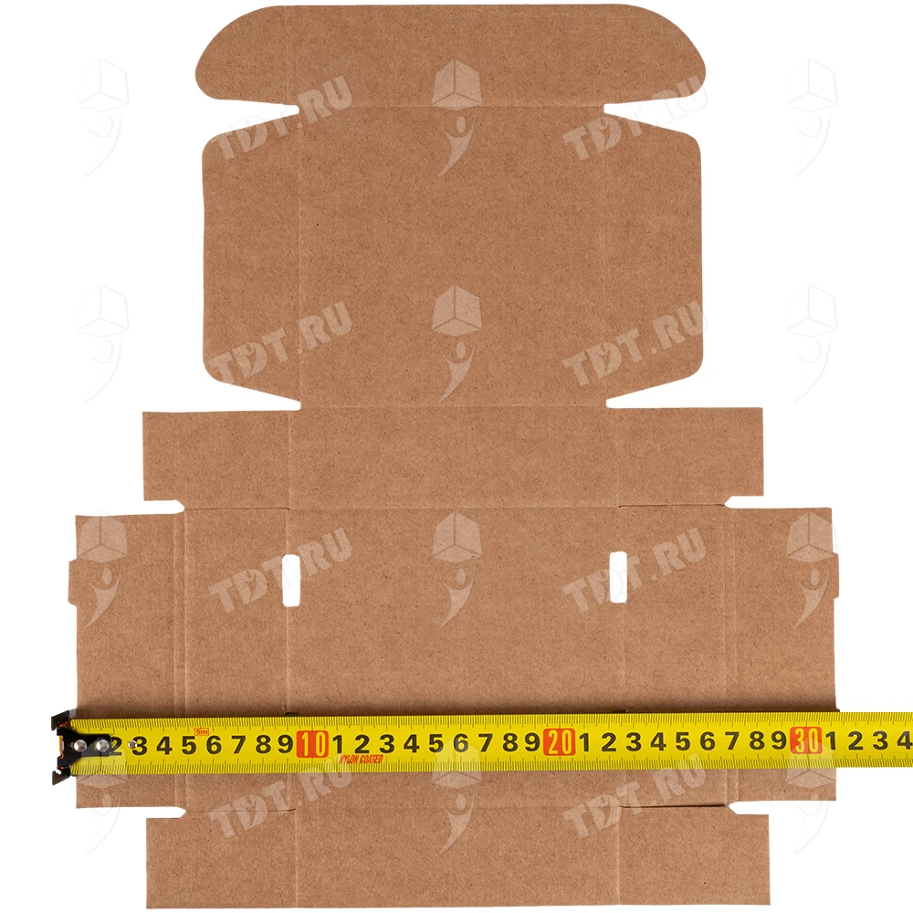 Самосборный короб №129 бурого цвета, длиной 125 мм, шириной 120 мм и высотой 40 мм. Изготовлен из гофрокартона Т-23 Е. Полезный объём — 0.6 л.