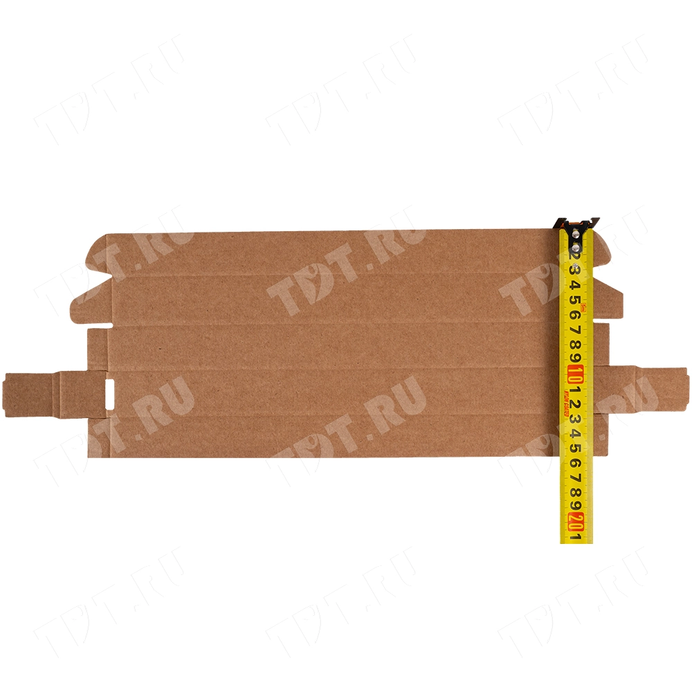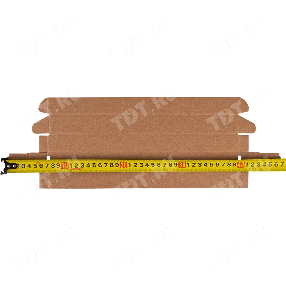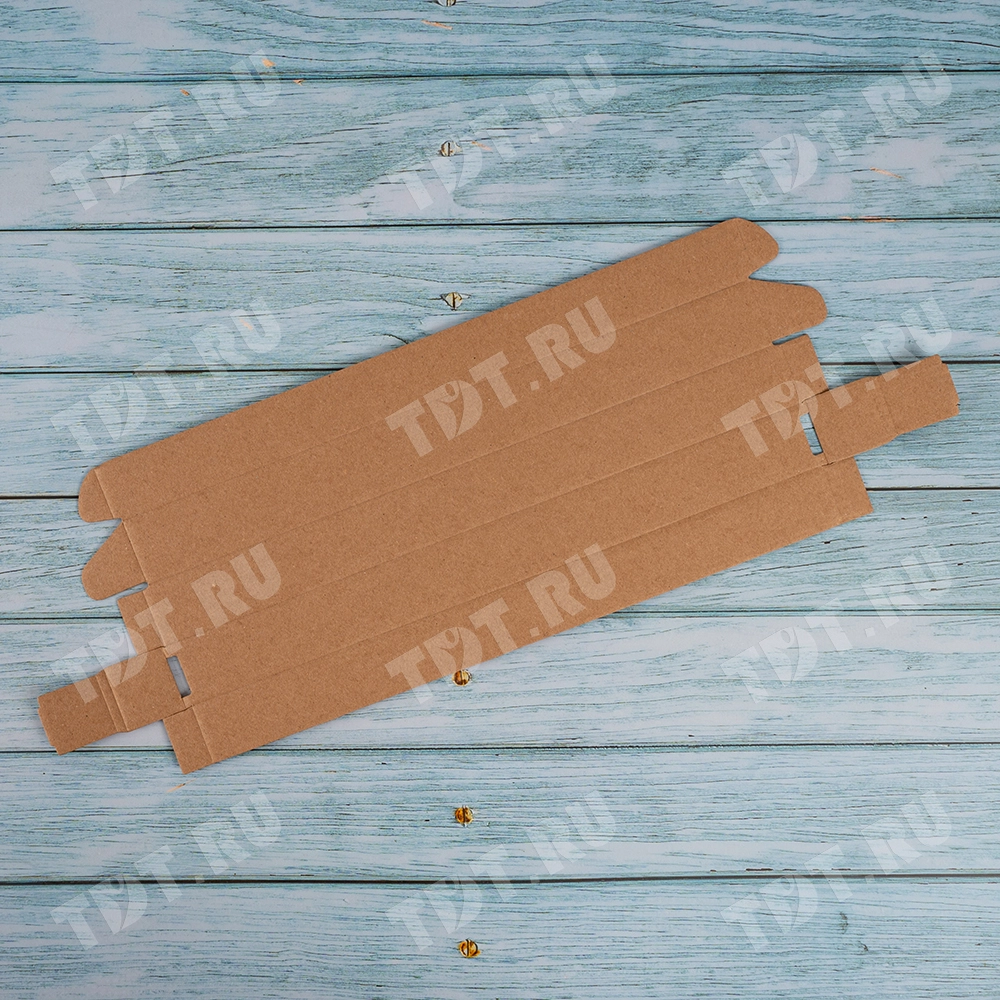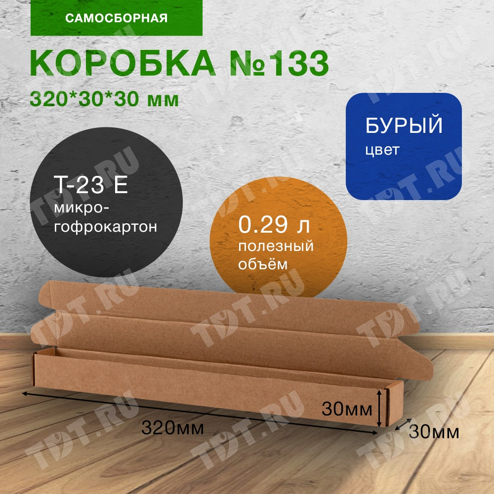 Самосборный короб №133 бурого цвета, длиной 320 мм, шириной 30 мм и высотой 30 мм. Изготовлен из гофрокартона Т-23 Е. Полезный объём — 0.29 л.