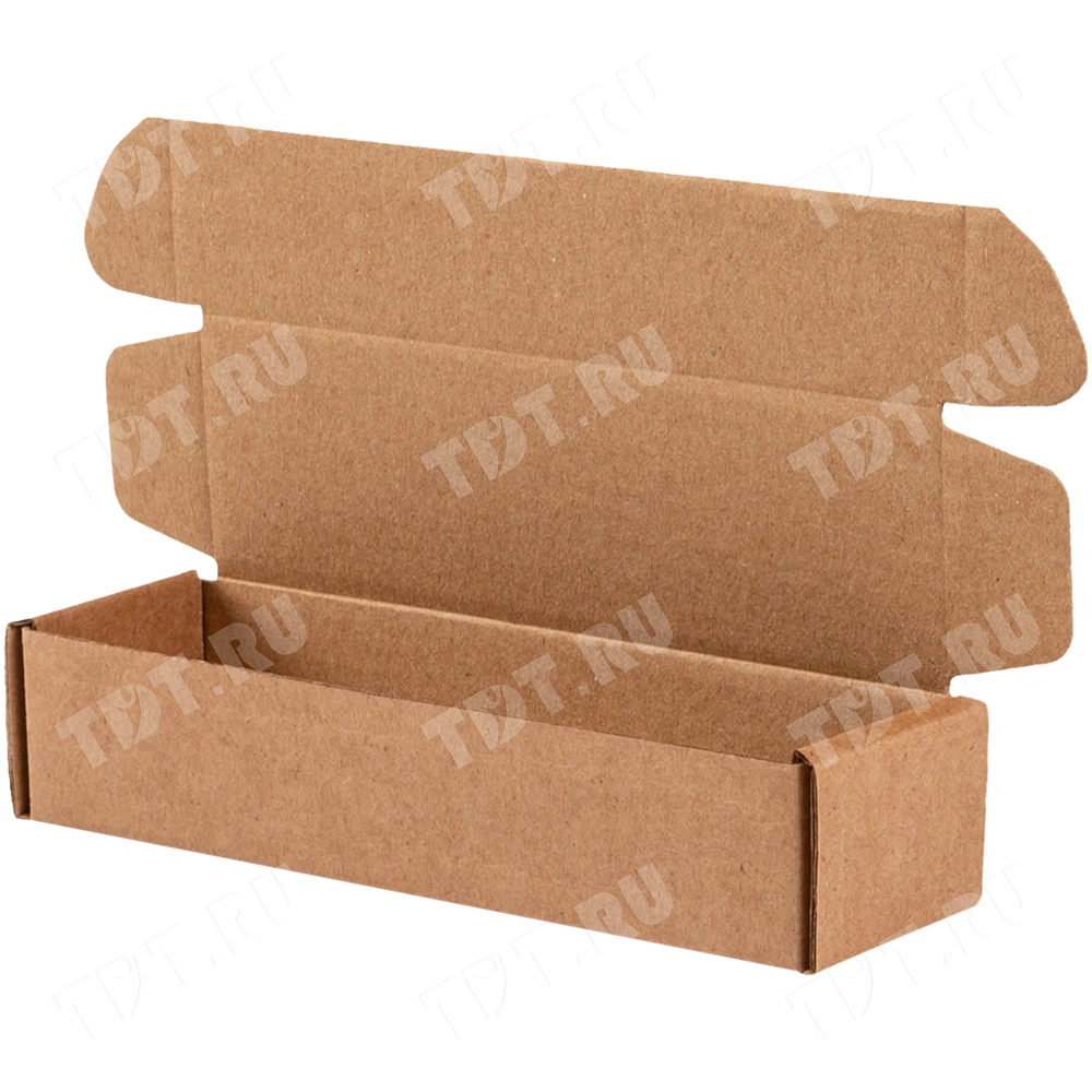 Самосборный короб №135 бурого цвета, длиной 140 мм, шириной 40 мм и высотой 30 мм. Изготовлен из гофрокартона Т-23 Е. Полезный объём — 0.17 л.