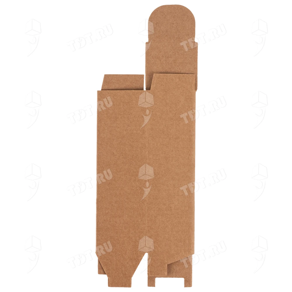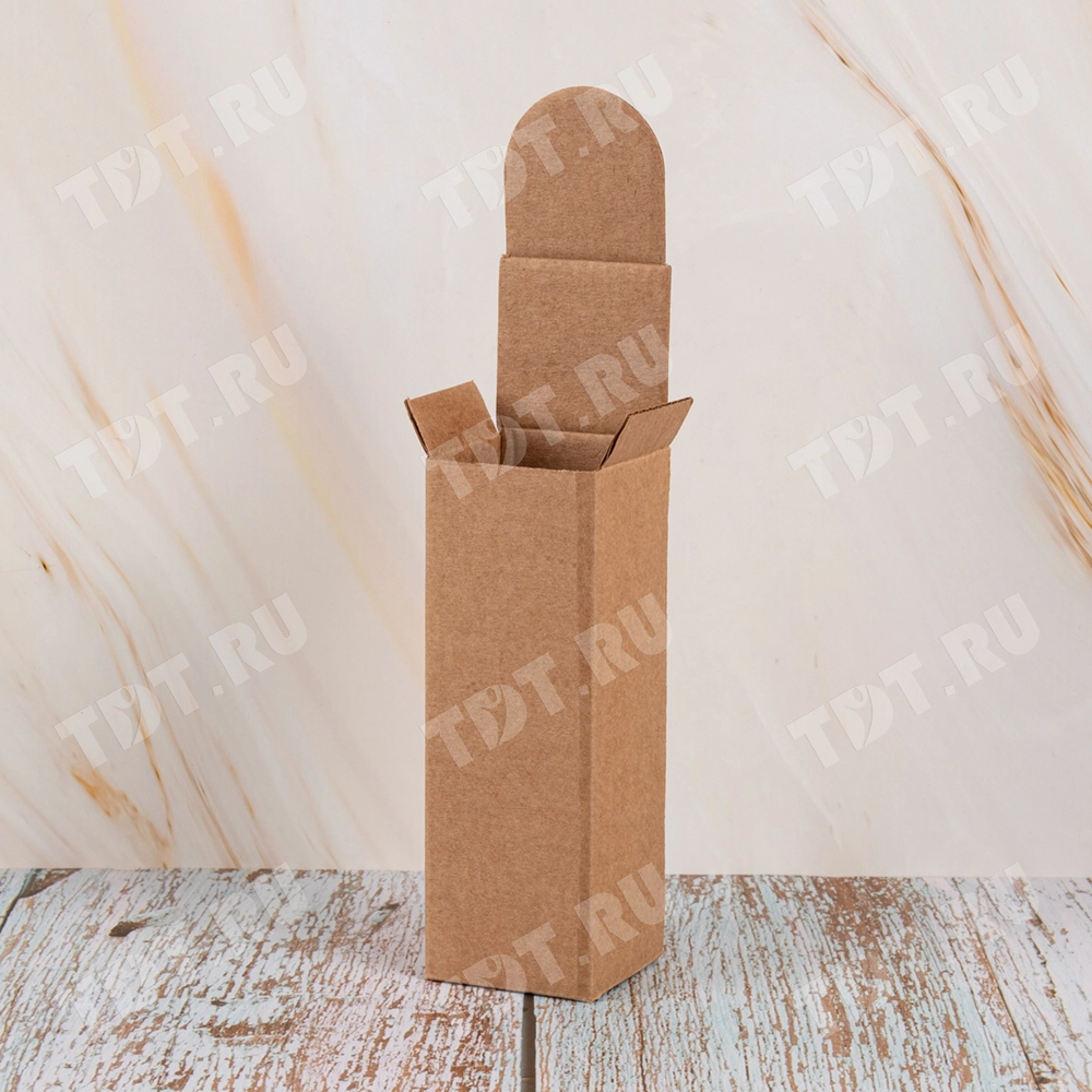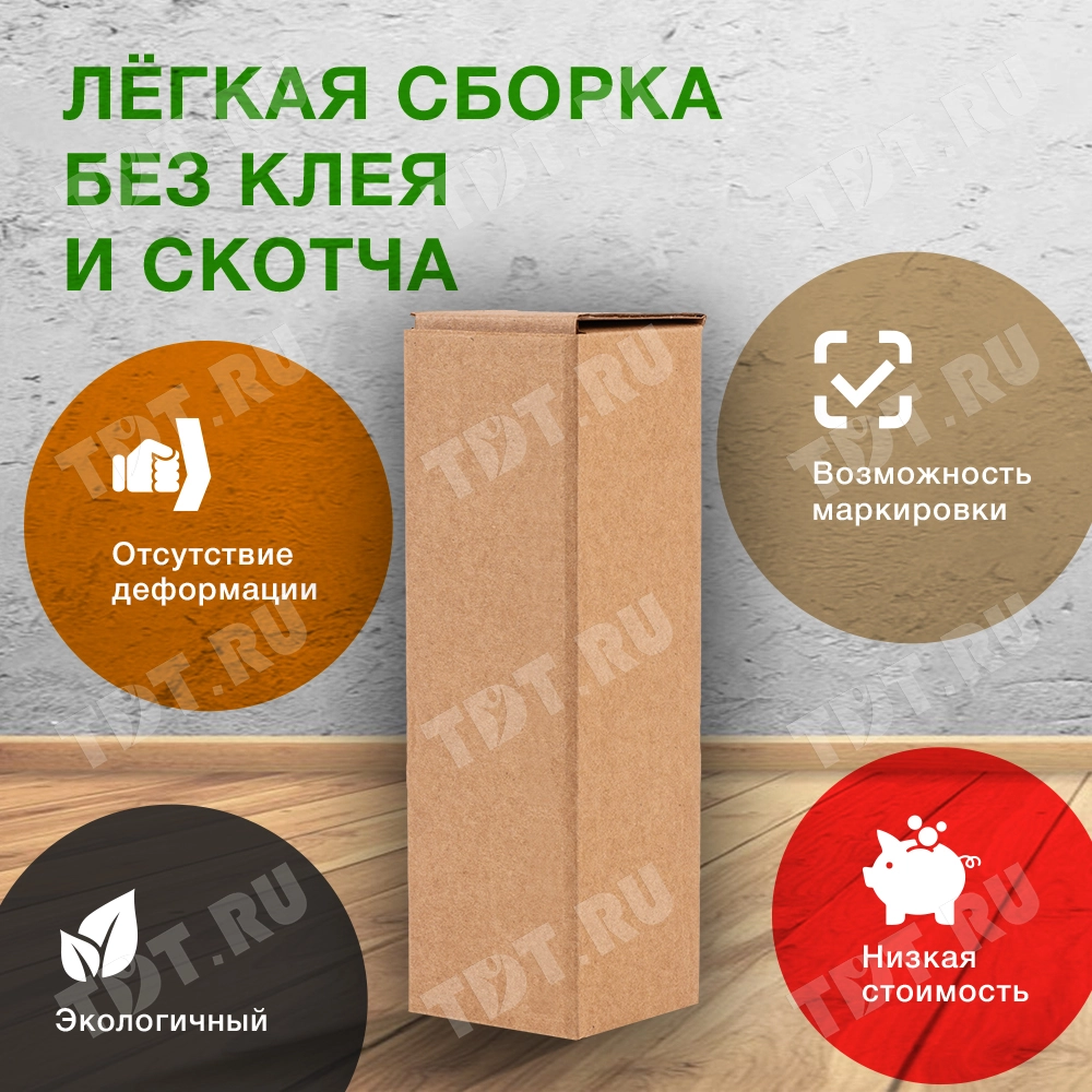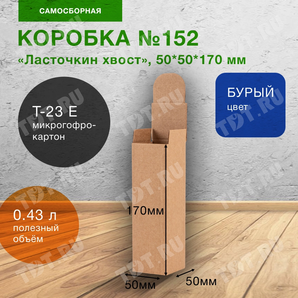 Самосборный короб №152 «Ласточкин хвост» бурого цвета, длиной 50 мм, шириной 50 мм и высотой 170 мм. Изготовлен из гофрокартона Т-23 Е. Полезный объём — 0.43 л.