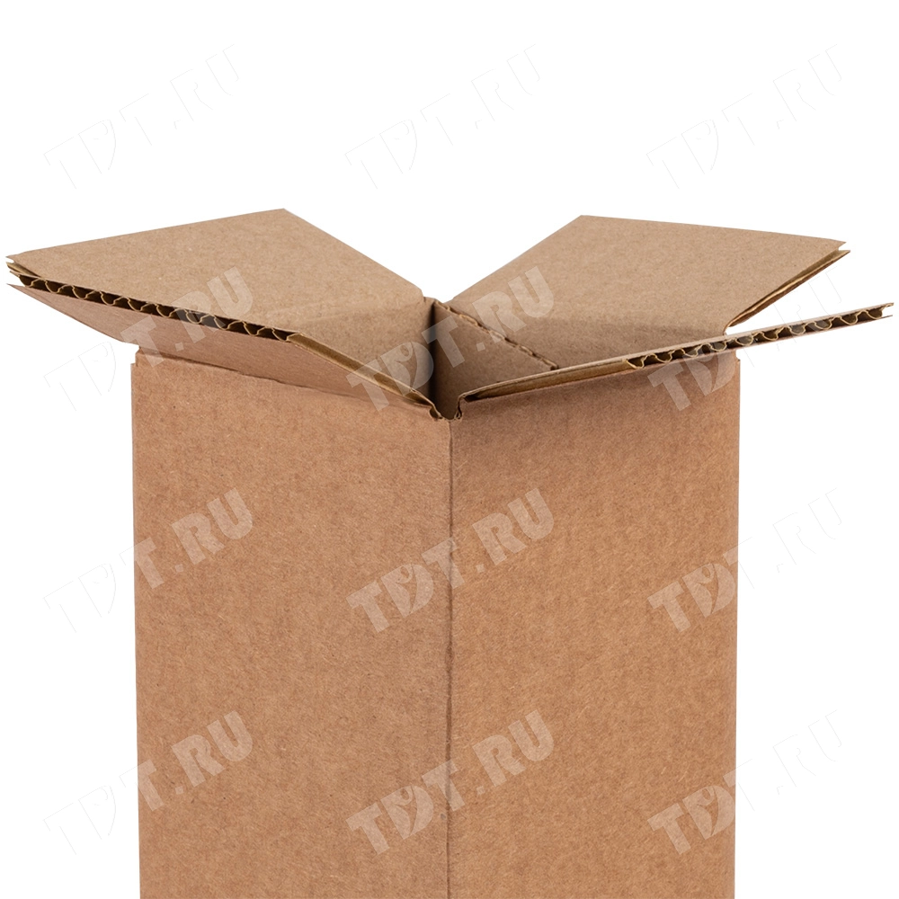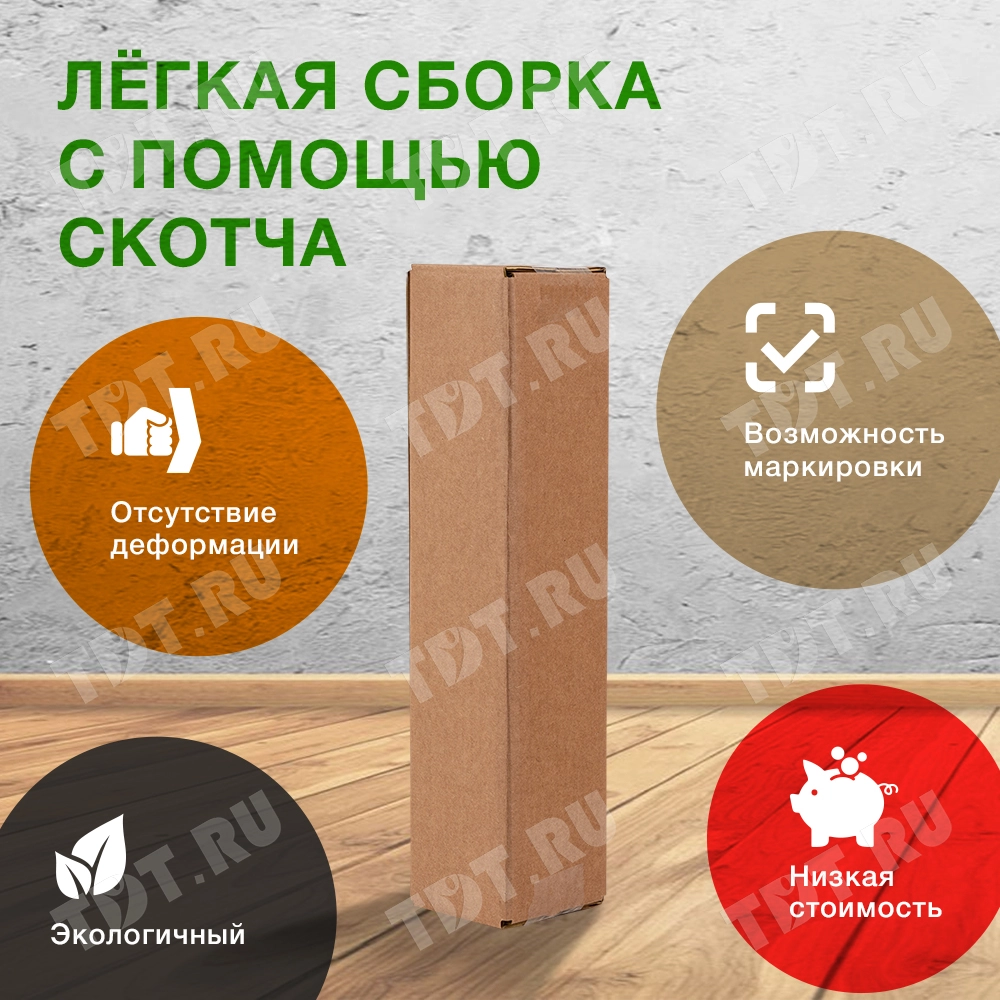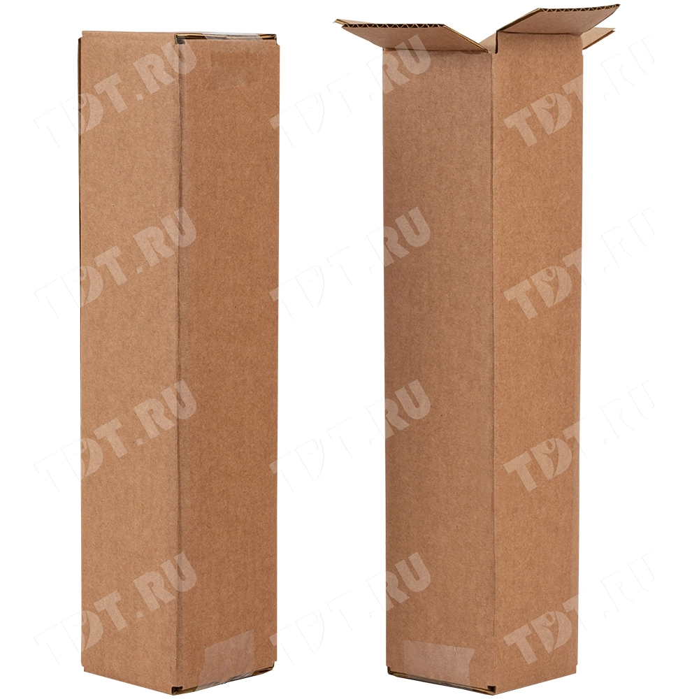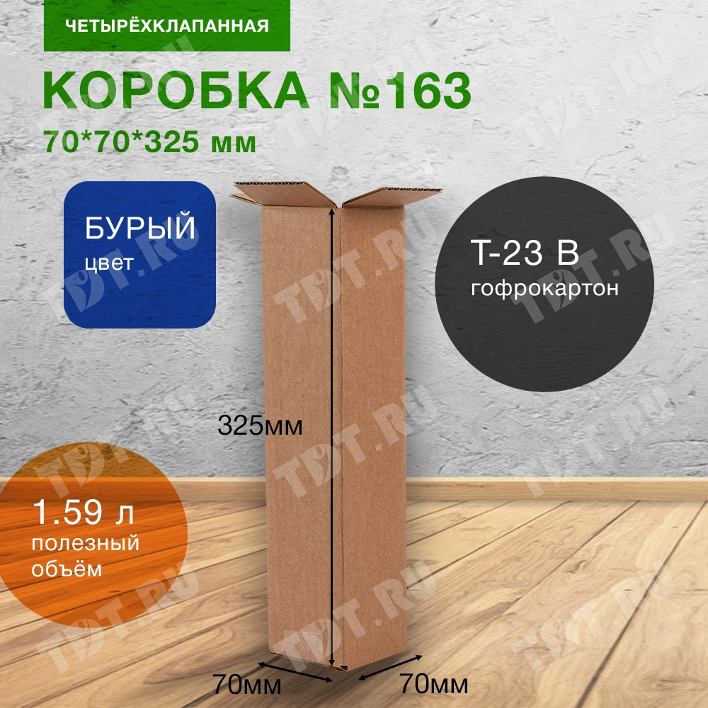 Короб №163 бурого цвета, длиной 70 мм, шириной 70 мм и высотой 325 мм. Изготовлен из трехслойного картона марки Т-23 В. Полезный объём — 1.59 л.