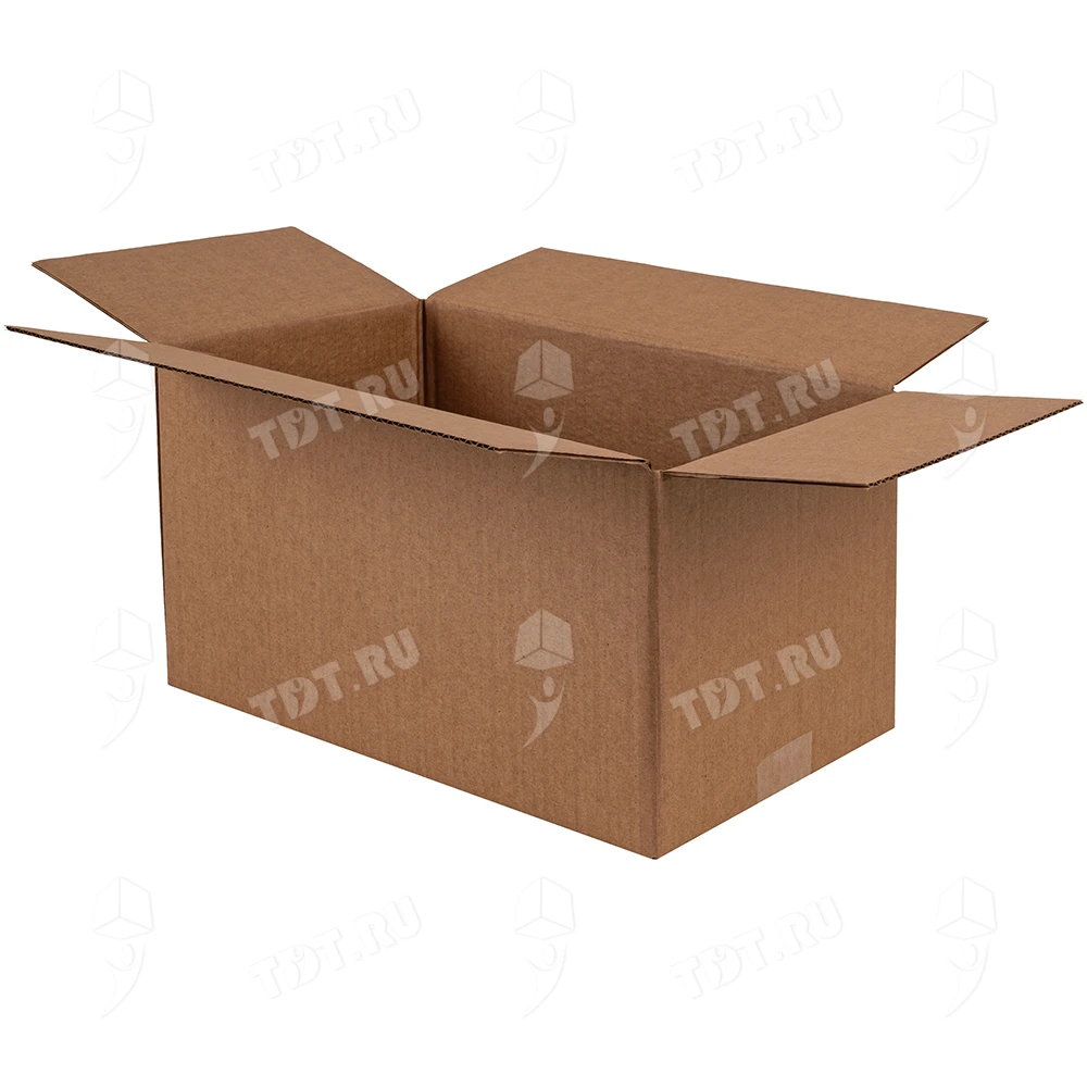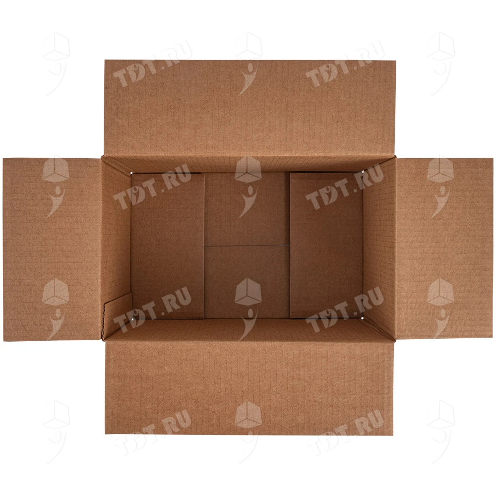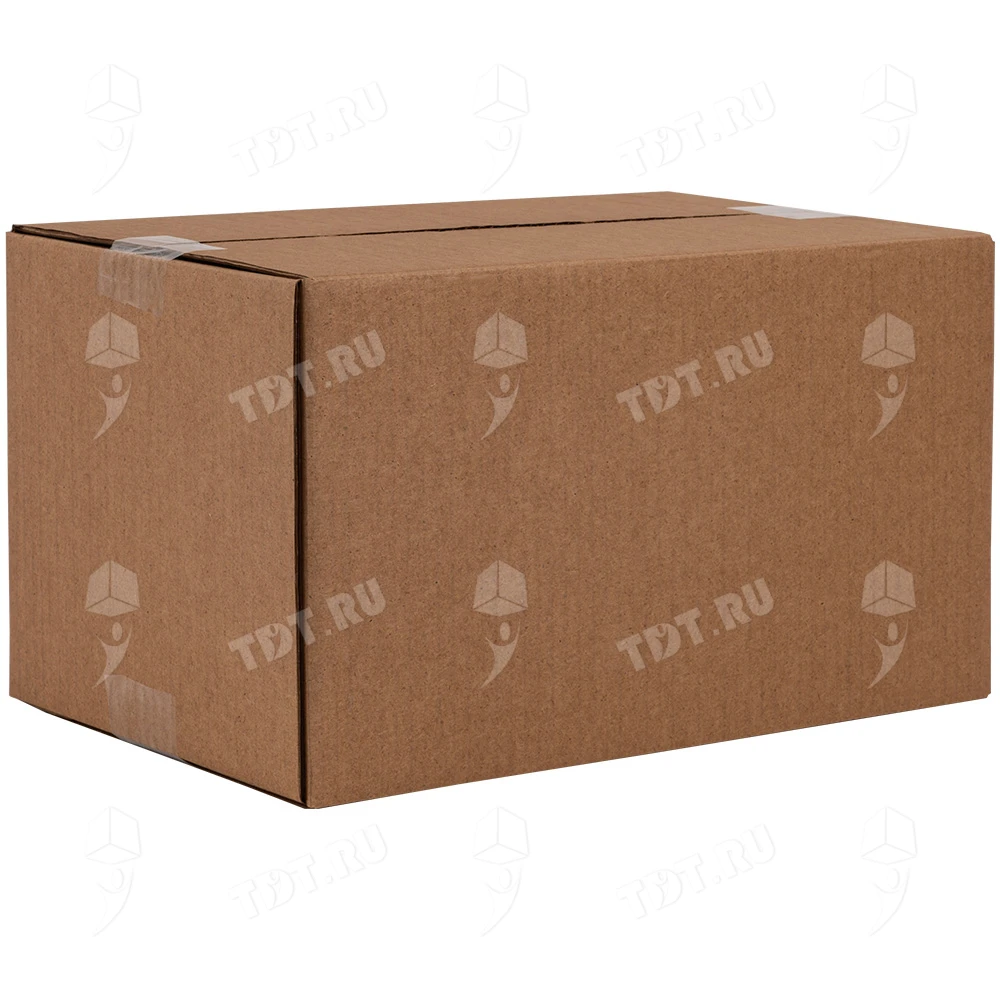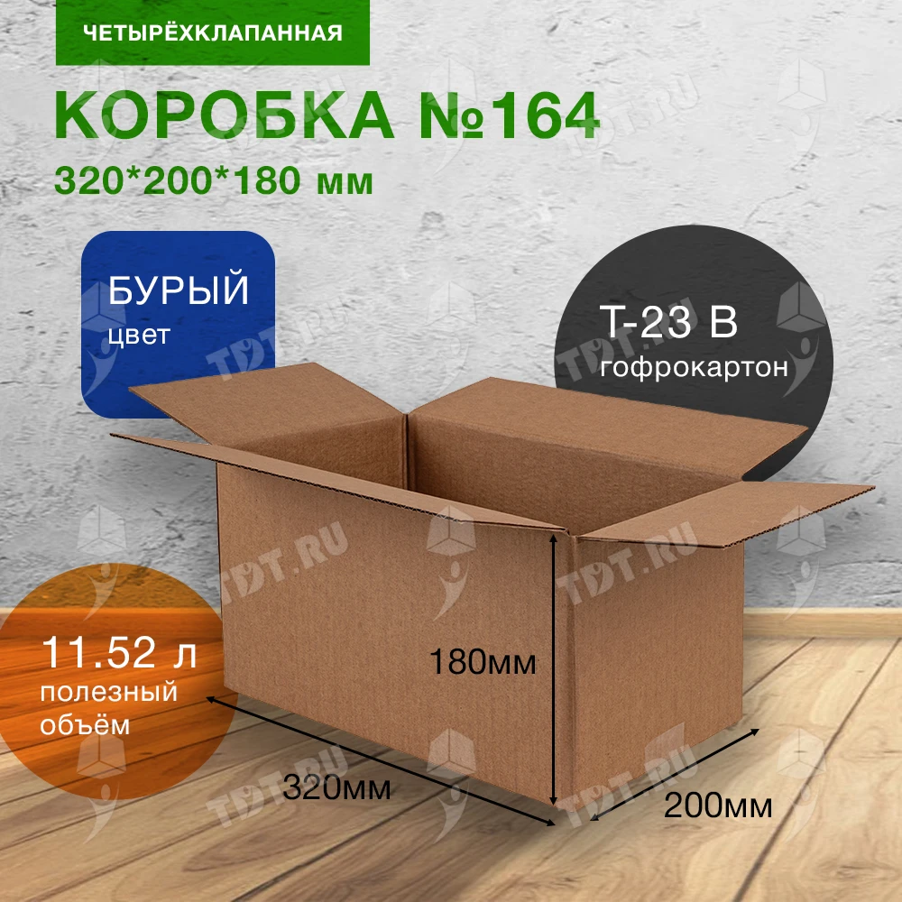 Четырехклапанный короб №164 бурого цвета, длиной 320 мм, шириной 200 мм и высотой 180 мм. Изготовлен из трехслойного картона марки Т-23 В. Полезный объём — 11.52 л.
