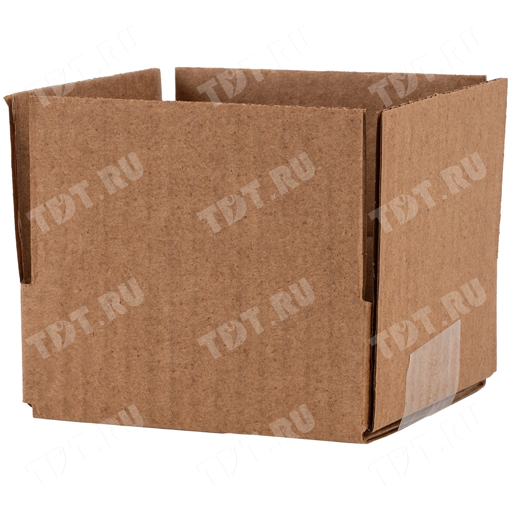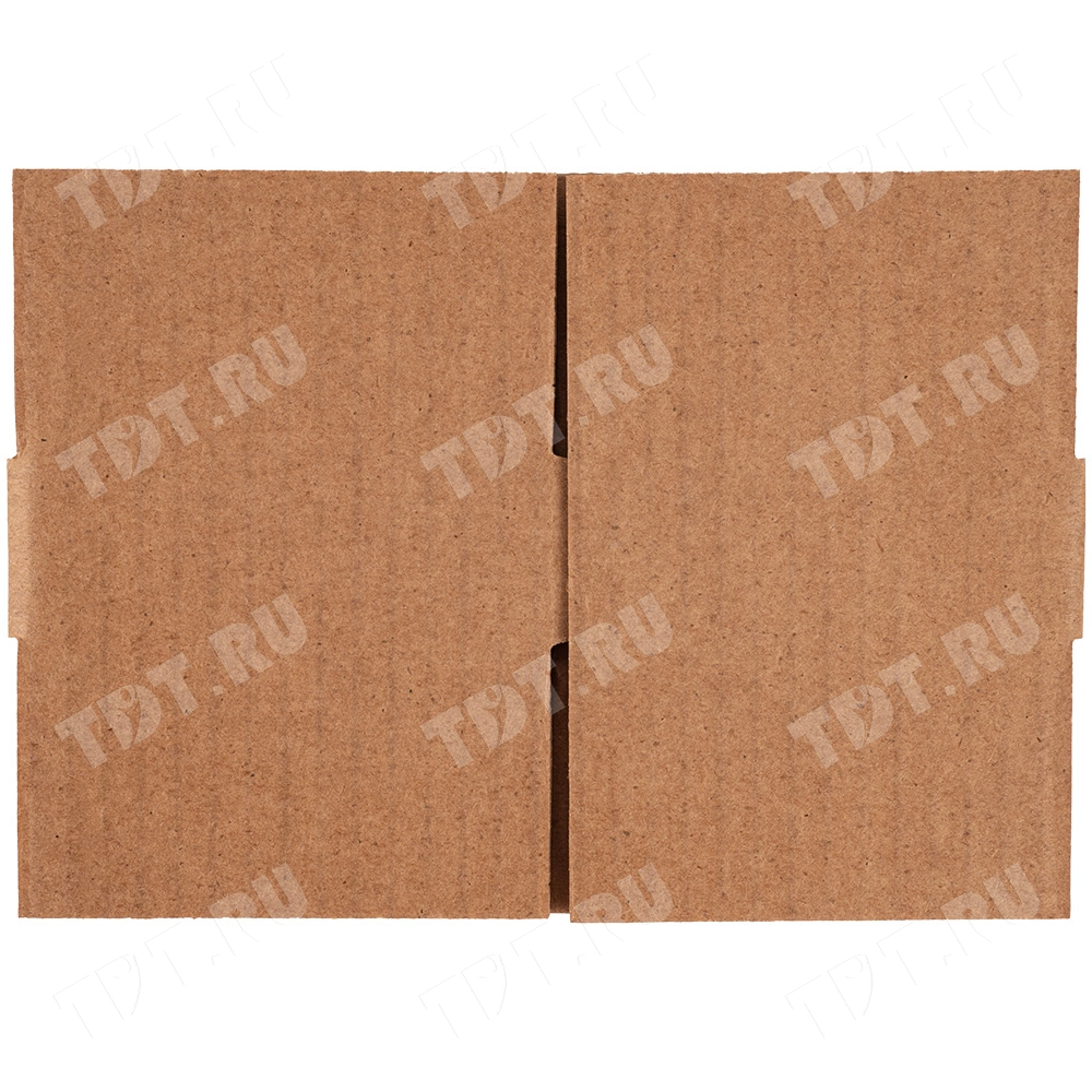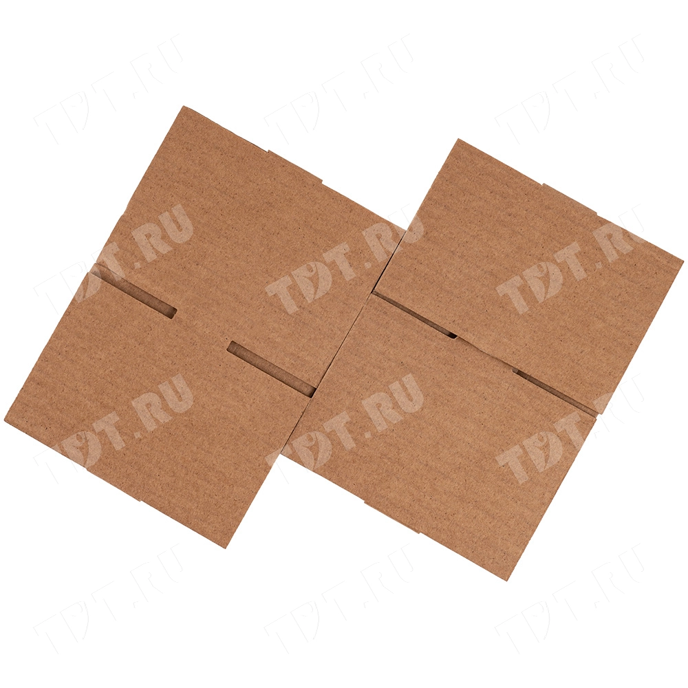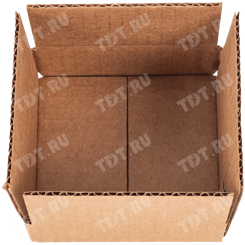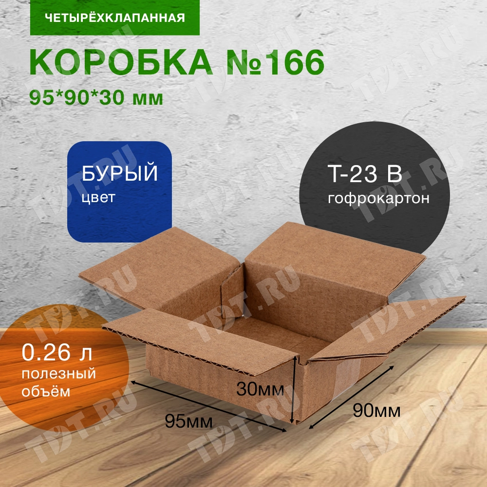 Четырехклапанный короб №166 бурого цвета, длиной 95 мм, шириной 90 мм и высотой 30 мм. Изготовлен из трехслойного картона марки Т-23 В. Полезный объём — 0.26 л.