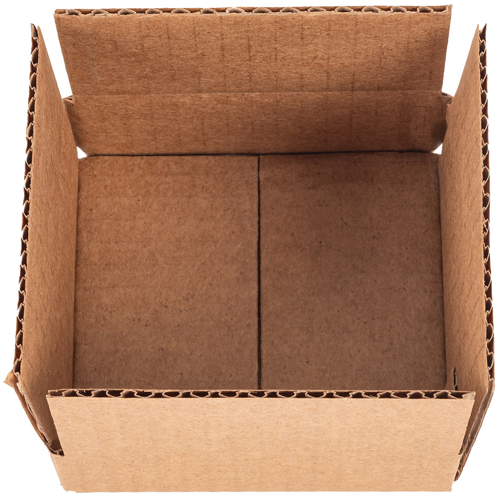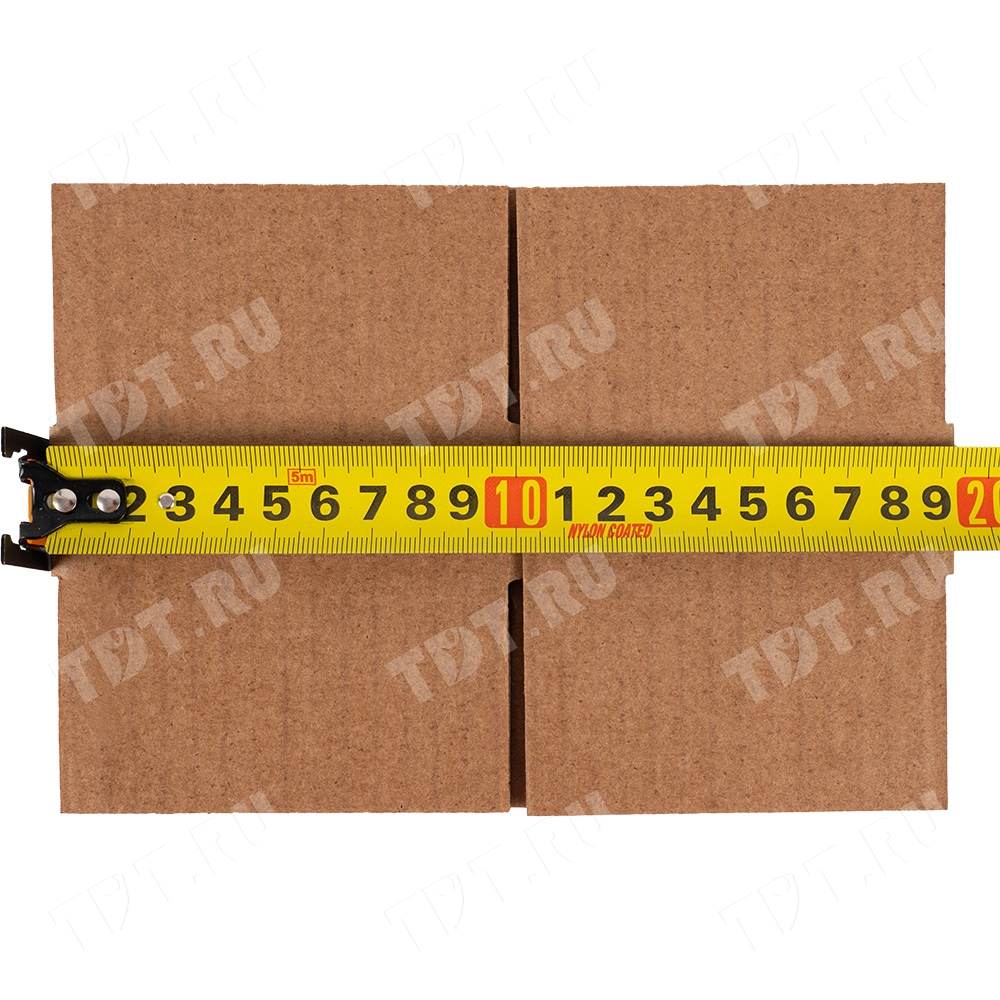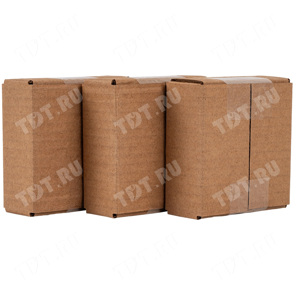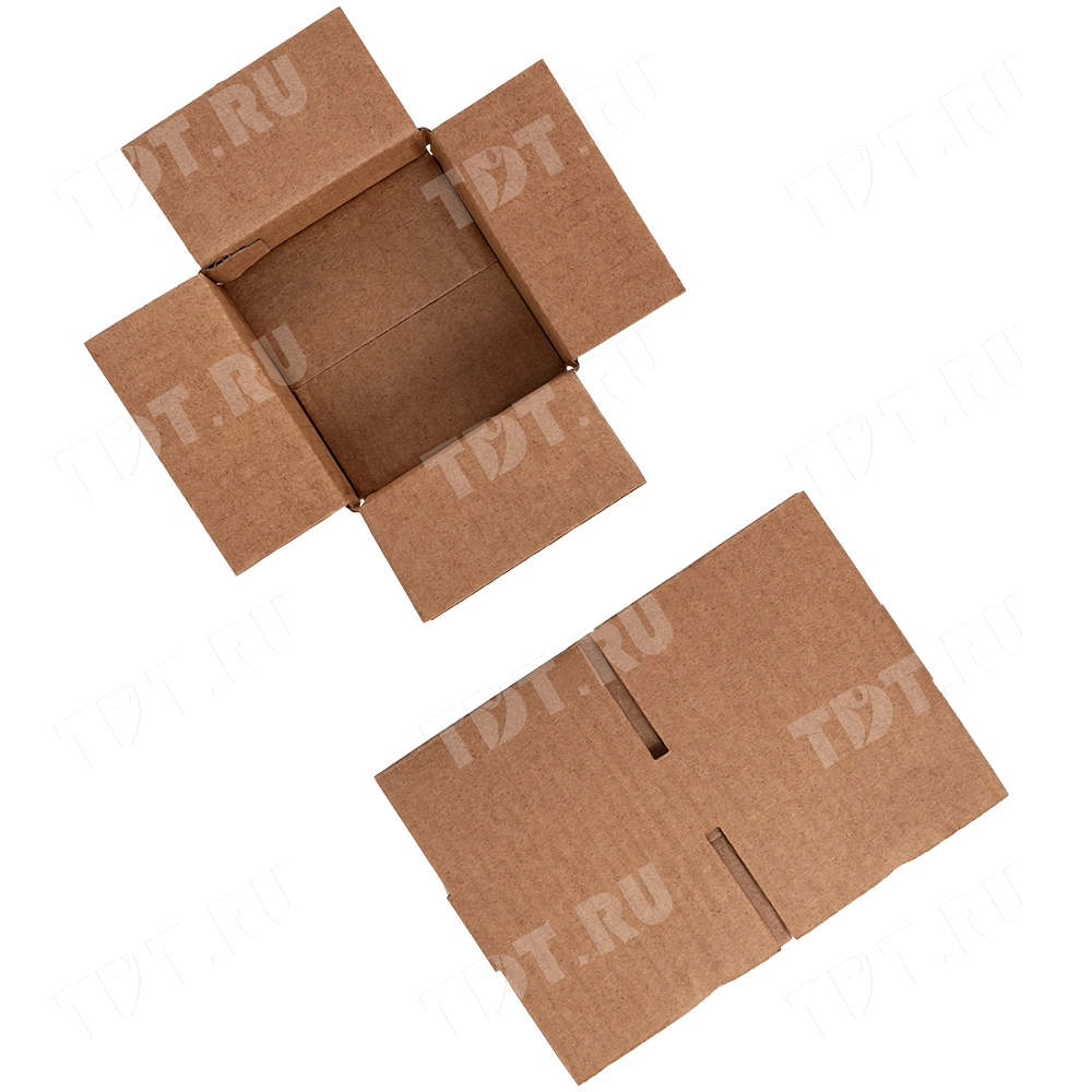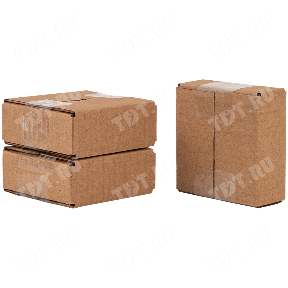 Четырехклапанный короб №166 бурого цвета, длиной 95 мм, шириной 90 мм и высотой 30 мм. Изготовлен из трехслойного картона марки Т-23 В. Полезный объём — 0.26 л.