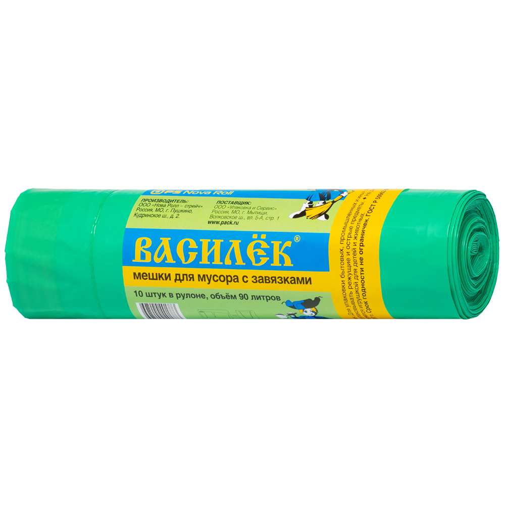 Мешки для мусора «Василёк» с завязками, зелёного цвета снаружи и белого внутри, объёмом 90 л, длиной 90 см, шириной 65 см, толщиной 30 мкм, в упаковке по 10 штук. Изготовлены из полиэтилена высокого давления (ПВД).