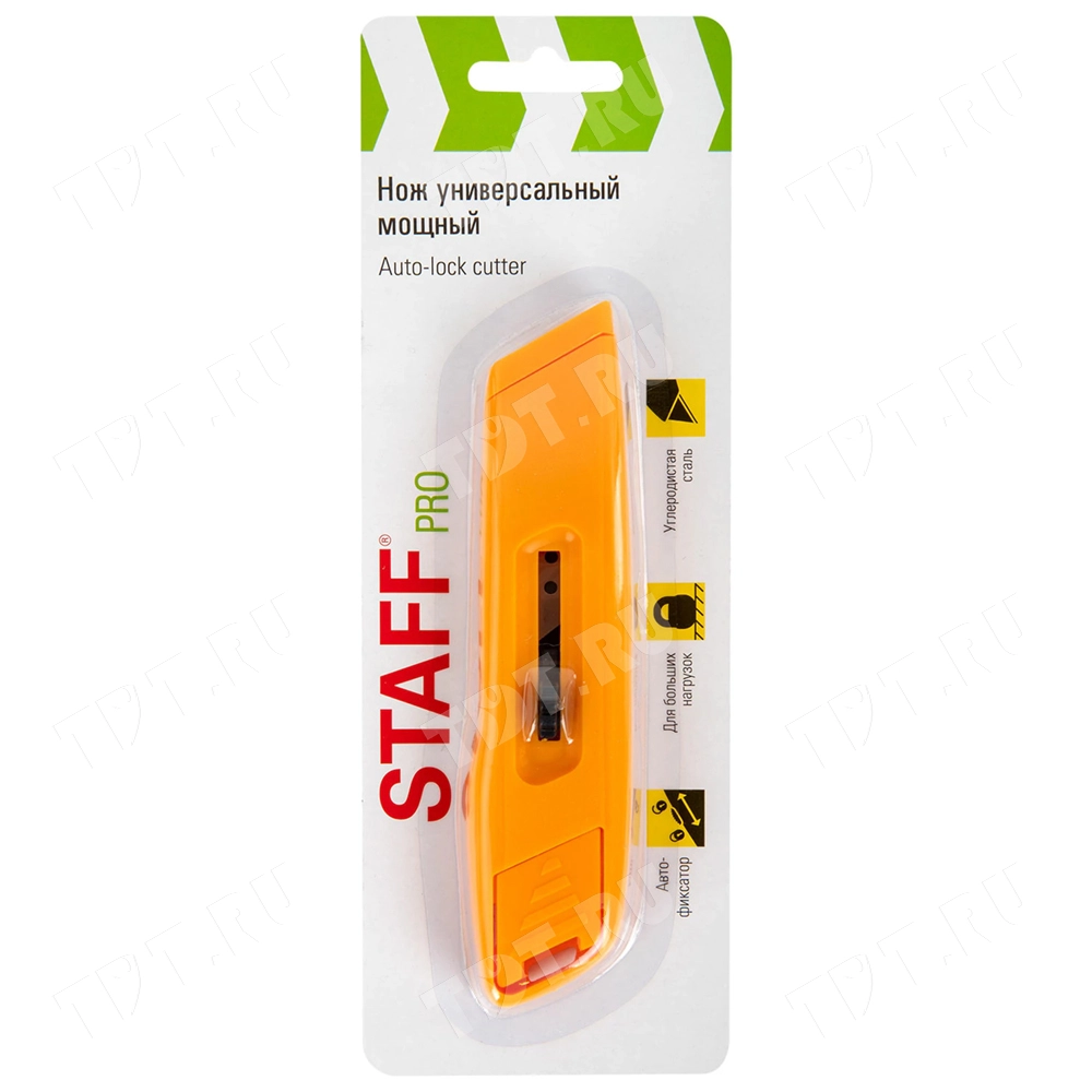 Универсальный мощный нож STAFF «PRO» с автофиксатором, код производителя 238734, шириной лезвия 18 мм. Материал корпуса – ABS пластик. Производится в Китае.